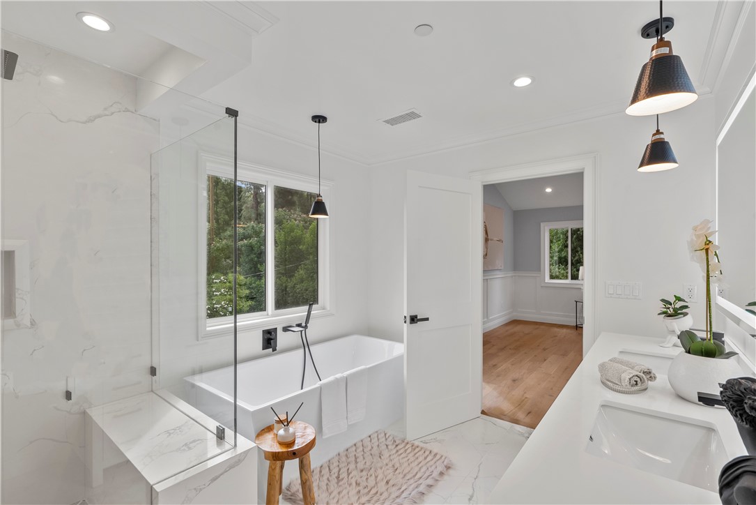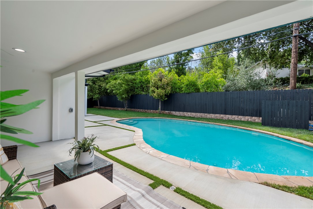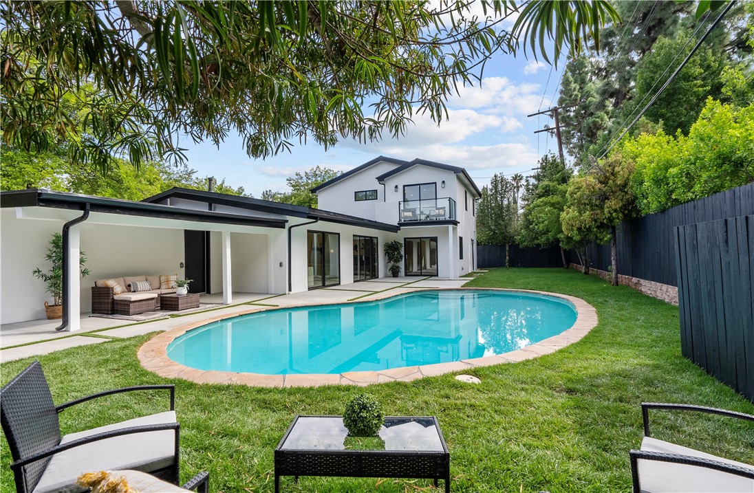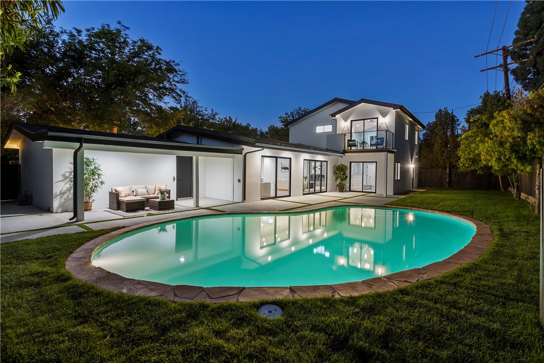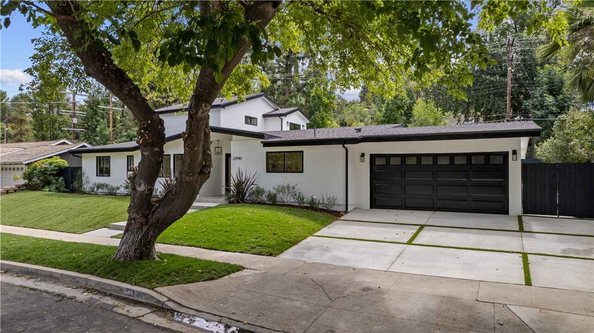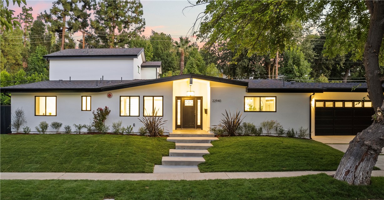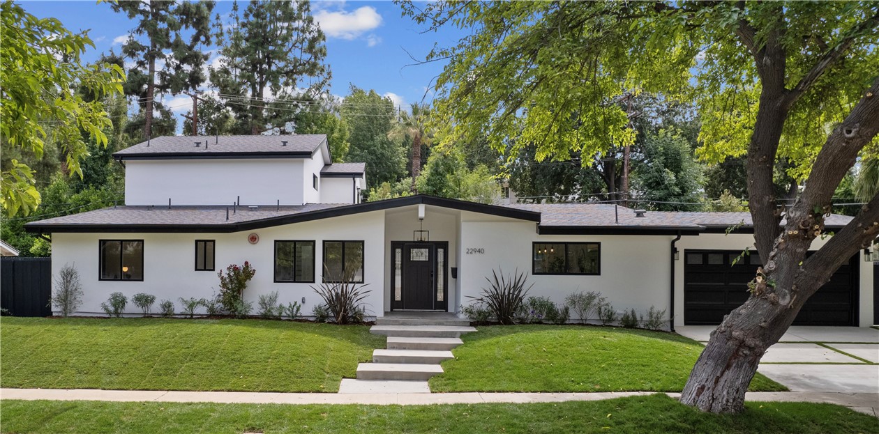 Experience the tranquility of a lush, tree-lined sanctuary south of Ventura Boulevard in the most desirable pocket of Woodland Hills. This is a dream location to enjoy peaceful surroundings and call home. With over 1,000 feet of brand new construction added, this modest 3 bed/2 bath Charles Du Bois home has been transformed into a modern, spacious 5 bed/5.5 bath masterpiece. Even more incredible is that all five bedrooms include private en suite bathrooms. The stunning attention to detail and quality are breathtaking, creating an atmosphere that genuinely feels one of a kind. When you step inside, the sight of engineered hardwood flooring greets you with an aura of richness underfoot. The open-concept area welcomes you with a warm and inviting environment while highlighting the high vaulted ceilings that echo sophistication. Moving onwards leads you into the custom-designed kitchen that connects modern functionality with style. A striking 9' quartz island takes center stage, paired with matching countertops to complete an intoxicating mix of form and function. On the ground level are four expansive bedrooms and a private laundry room, with two of the bedrooms granted access to the outdoors through sliding glass doors. Journey upstairs into the secluded primary bedroom: a cocoon of comfort featuring arched ceilings paired with a large walk-in closet and a captivating bathroom housing a tranquil standalone tub. Start your day with the serenity of a private balcony overlooking the backyard and inground pool. Additional new items include kitchen appliances, lighting, windows, sliding glass doors throughout, smooth exterior-coat stucco, gutters, roof, rain barrels, (2) HVAC units (one for downstairs and one for upstairs), fireplace, electrical/plumbing, electrical panel, (2) water heaters, finished two car garage, driveway and pool patio hardscape, landscaping, fire sprinkler system. Situated less than a mile from the Calabasas Commons and close to Calabash Elementary Charter School, this property blends modern living with unparalleled convenience. Don't hesitate - make your forever home a reality!