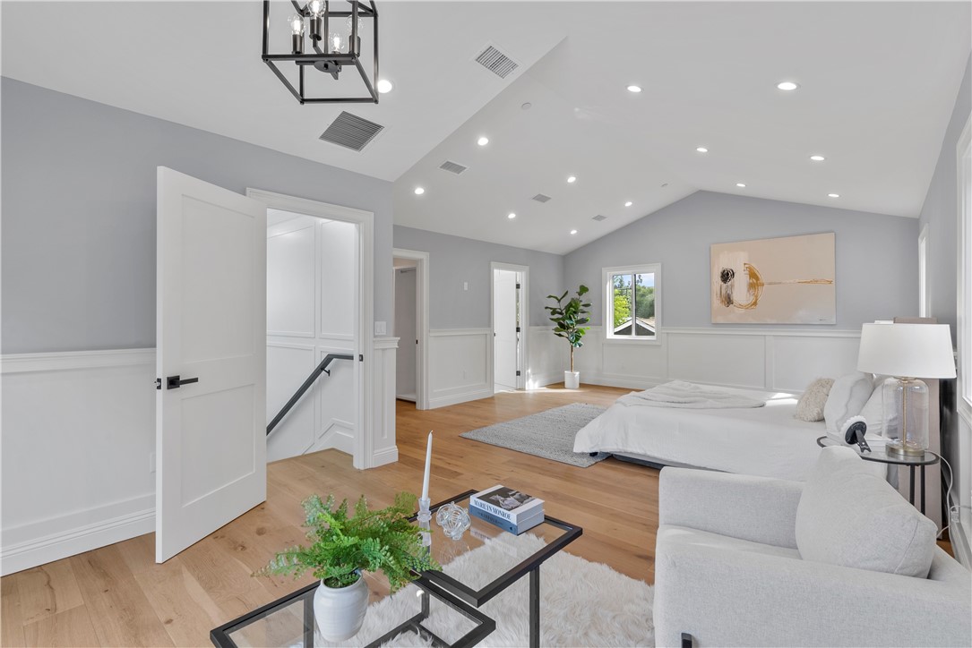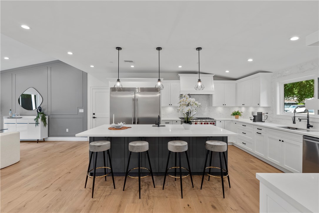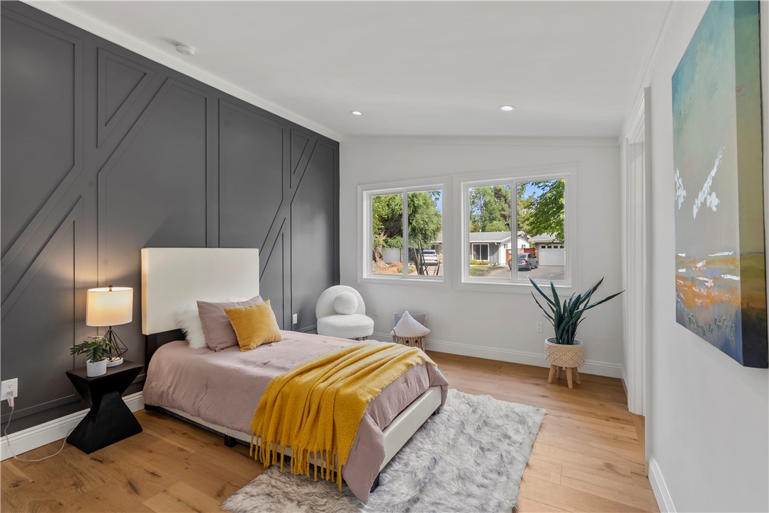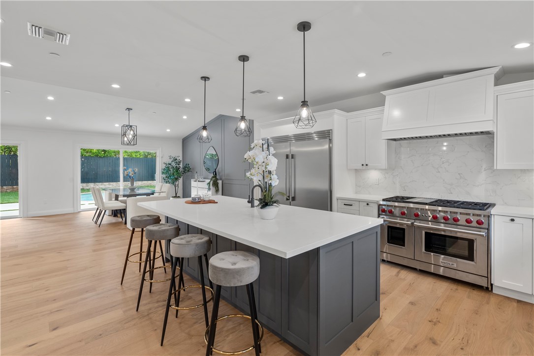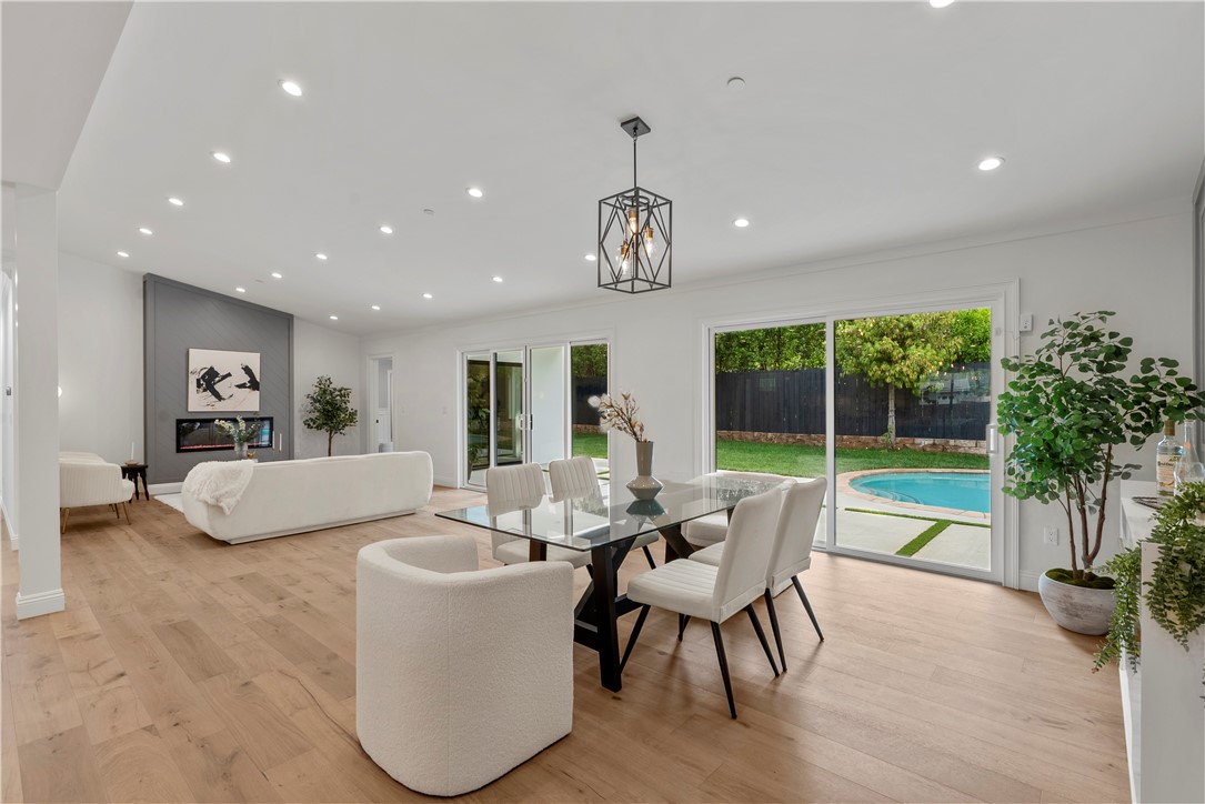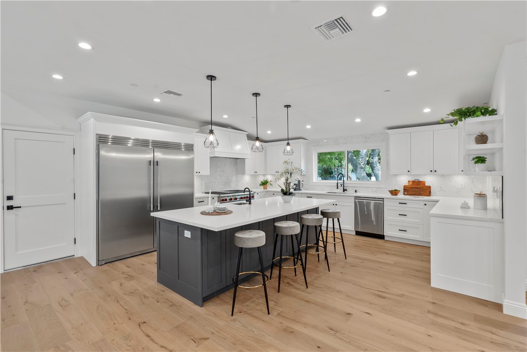 Experience the tranquility of a lush, tree-lined sanctuary south of Ventura Boulevard in the most desirable pocket of Woodland Hills. This is a dream location to enjoy peaceful surroundings and call home. With over 1,000 feet of brand new construction added, this modest 3 bed/2 bath Charles Du Bois home has been transformed into a modern, spacious 5 bed/5.5 bath masterpiece. Even more incredible is that all five bedrooms include private en suite bathrooms. The stunning attention to detail and quality are breathtaking, creating an atmosphere that genuinely feels one of a kind. When you step inside, the sight of engineered hardwood flooring greets you with an aura of richness underfoot. The open-concept area welcomes you with a warm and inviting environment while highlighting the high vaulted ceilings that echo sophistication. Moving onwards leads you into the custom-designed kitchen that connects modern functionality with style. A striking 9' quartz island takes center stage, paired with matching countertops to complete an intoxicating mix of form and function. On the ground level are four expansive bedrooms and a private laundry room, with two of the bedrooms granted access to the outdoors through sliding glass doors. Journey upstairs into the secluded primary bedroom: a cocoon of comfort featuring arched ceilings paired with a large walk-in closet and a captivating bathroom housing a tranquil standalone tub. Start your day with the serenity of a private balcony overlooking the backyard and inground pool. Additional new items include kitchen appliances, lighting, windows, sliding glass doors throughout, smooth exterior-coat stucco, gutters, roof, rain barrels, (2) HVAC units (one for downstairs and one for upstairs), fireplace, electrical/plumbing, electrical panel, (2) water heaters, finished two car garage, driveway and pool patio hardscape, landscaping, fire sprinkler system. Situated less than a mile from the Calabasas Commons and close to Calabash Elementary Charter School, this property blends modern living with unparalleled convenience. Don't hesitate - make your forever home a reality!