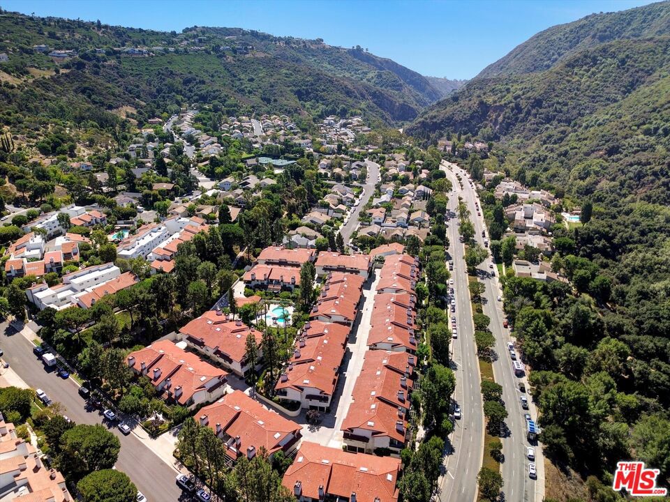 WELCOME TO ONE OF THE BEST TOWNHOMES IN THE PACIFIC PALISADES HIGHLANDS! With fantastic mountain and canyon views, this west facing 2,725sf, 3bed/3bath home has an open floor plan, an abundance of natural light, and is bright and spacious throughout. As you enter the front door of this wonderful end unit, you are welcomed by a formal entry and a living room with a fireplace and vaulted ceilings. Next to the living room is a large patio with plenty of space for furniture and a barbeque. A few steps up from the living room is a formal dining room, a wet bar, a guest bathroom, and a chef's kitchen with its own sitting area. This entire portion of the unit has been previously remodeled/redesigned with an open concept and includes hardwood floors w/upgraded baseboards, solid doors with upgraded hardware and trim, custom cabinetry, granite countertops, stainless steel appliances (w/dual ovens and dual dishwashers), custom/led lighting, a small custom elevator which can be used to carry groceries directly to the kitchen from the garage, and surround sound speakers which are pre-wired in the sitting area. Upstairs you have three generous bedroom suites including a large primary bedroom with a fireplace, wrap around balcony, vaulted ceilings, a walk-in and additional closet, a large en-suite bathroom with dual sinks, a bathtub and a remodeled shower. The second bedroom includes a walk-in closet and shares a bathroom with the third bedroom. Additional features include new carpeting, upgraded solid doors, trim, and baseboards, as well as a wonderful skylight which adds even more natural light. On the ground floor you have direct access to a two car garage with side-by-side washer and dryer, an upgraded HVAC system, a recently replaced water heater, and an adjacent bonus room. In addition to 24-hour security patrol, the HOA is surrounded by lush mature landscaping and includes a swimming pool and spa, dry saunas, and a fitness room. For a fee, homeowners may also become a member of nearby Highlands Park which is gated and offers lovely greenspace and off leash hours. Close to all that Pacific Palisades has to offer including the beach, hiking trails, shops, restaurants, schools, Palisades Village, and the Getty Museum, as well as PCH, Santa Monica, and Malibu, this is the perfect opportunity for the right Buyer! FURNISHED PHOTOS ARE VIRTUALLY STAGED.