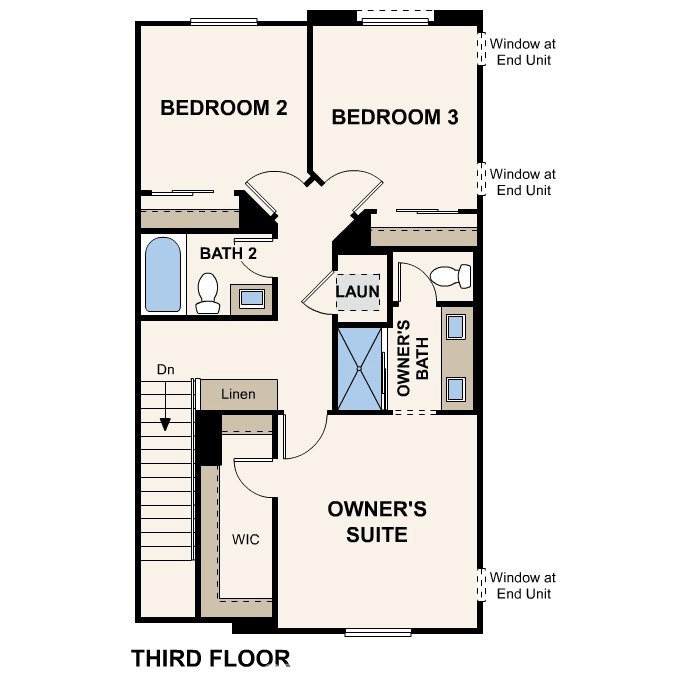 The third floor is dedicated to the secluded owner's suite with a roomy walk-in closet and a deluxe attached bath with dual vanities. Additional second-floor highlights include two secondary bedrooms, a full hall bath, and a convenient laundry room.
