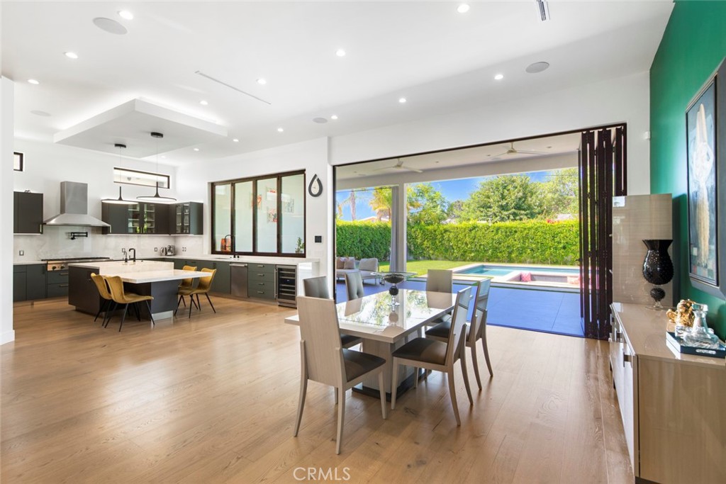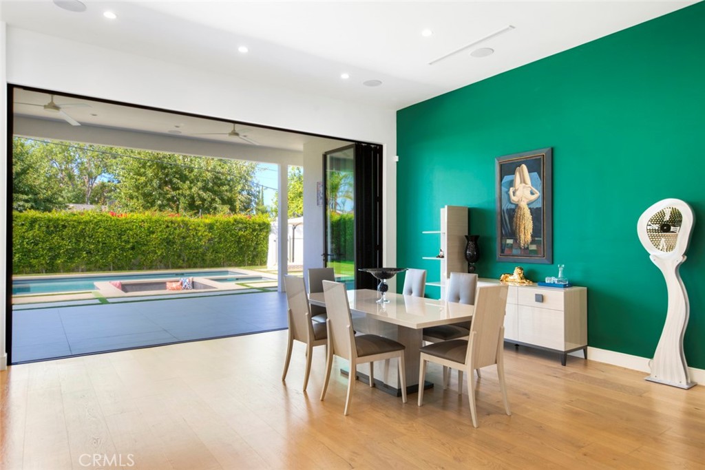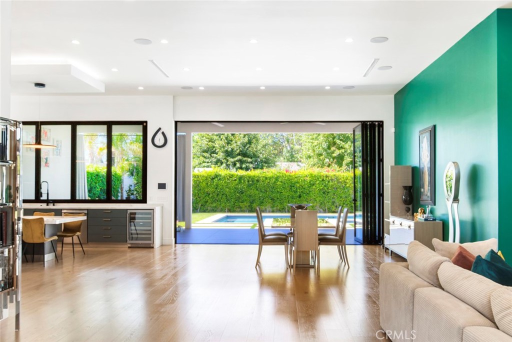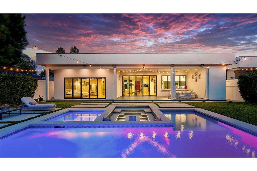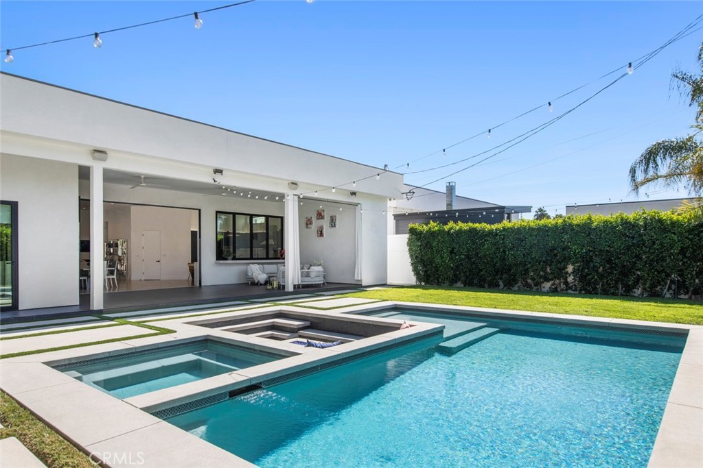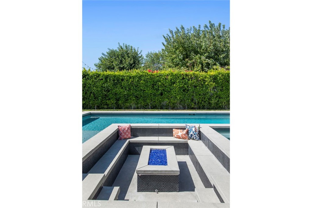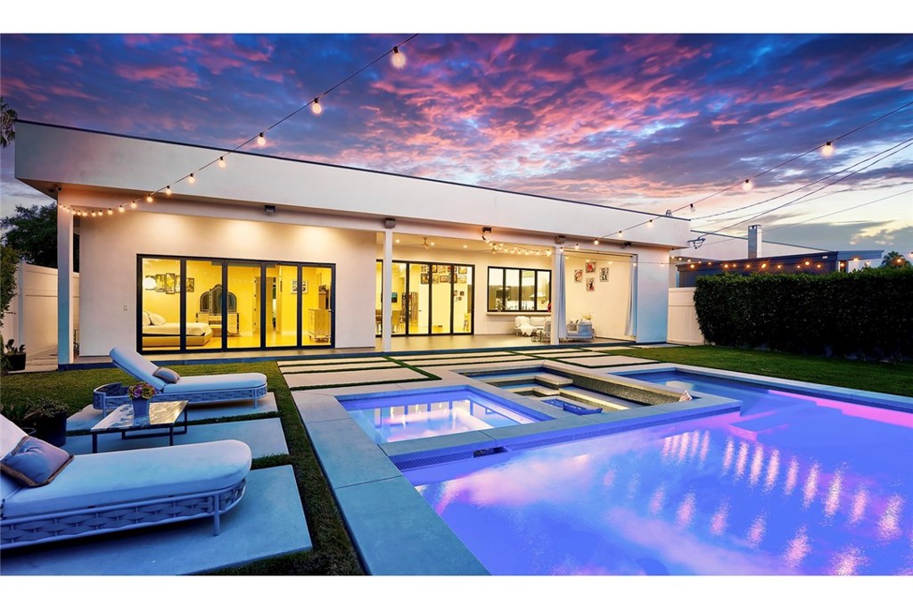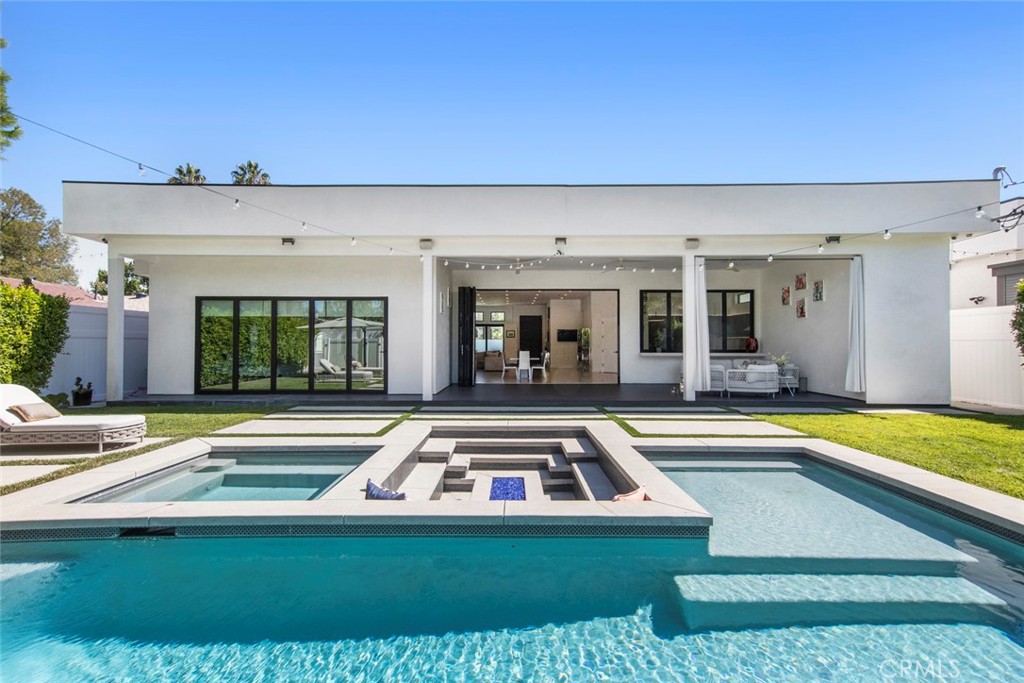 Folding glass doors effortlessly expand the living space to a generous patio and a charming backyard, featuring a sparkling pool, spa, and a sunken fire pit. The primary bedroom, a serene sanctuary, boasting a walk-in closet and an en suite bath, leads to an outdoor terrace overlooking the pool.
