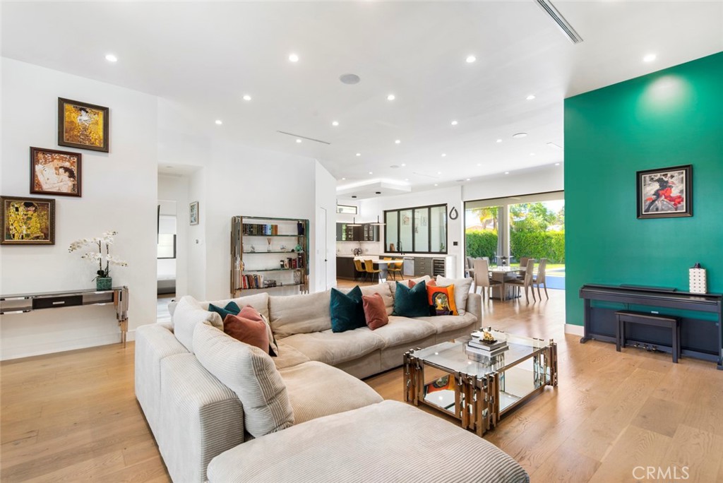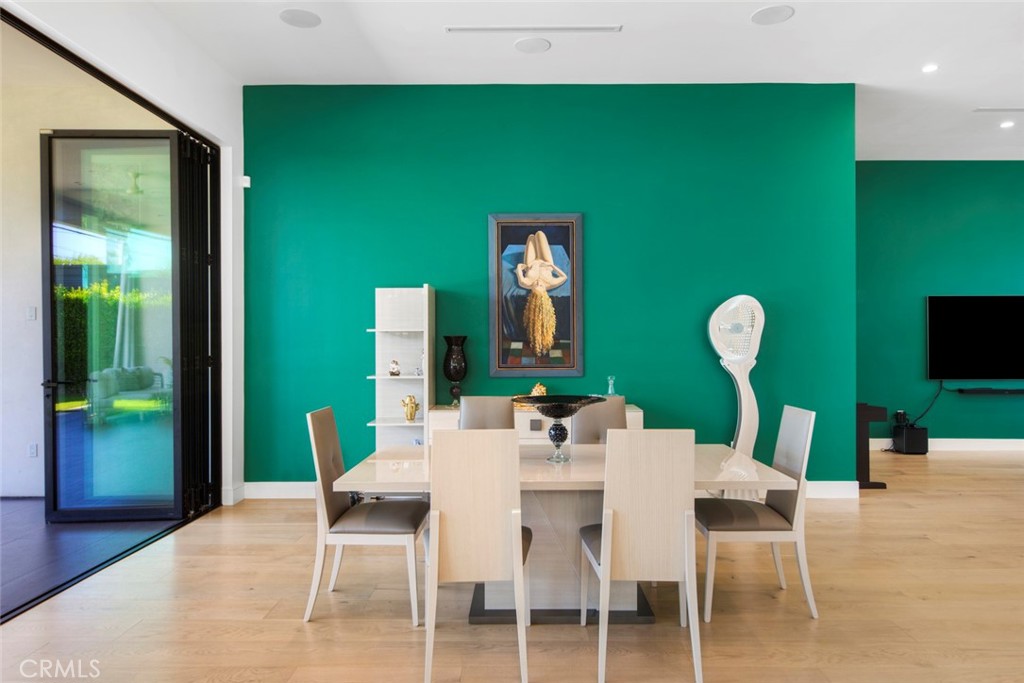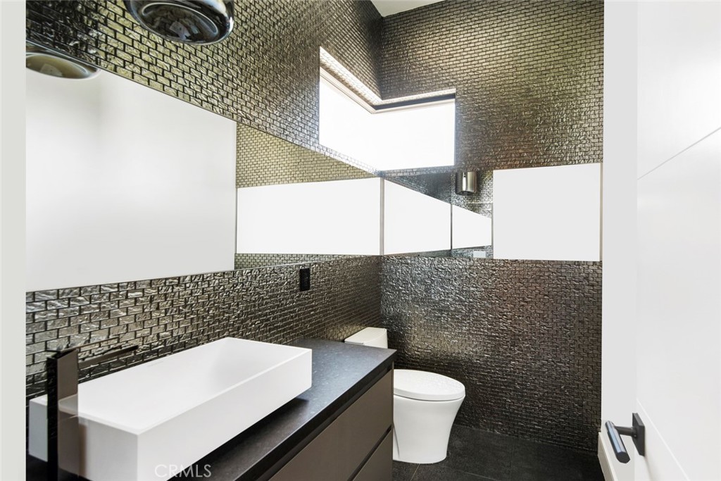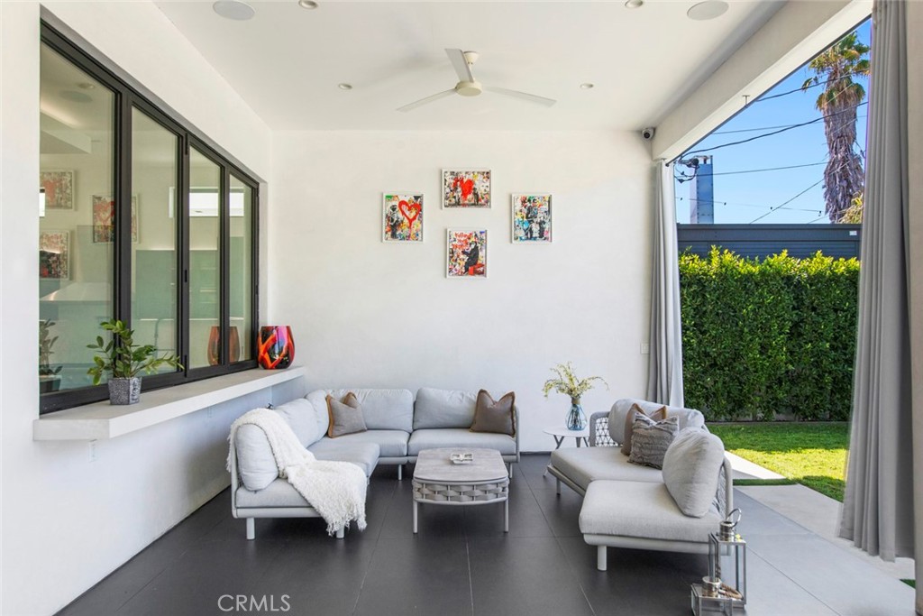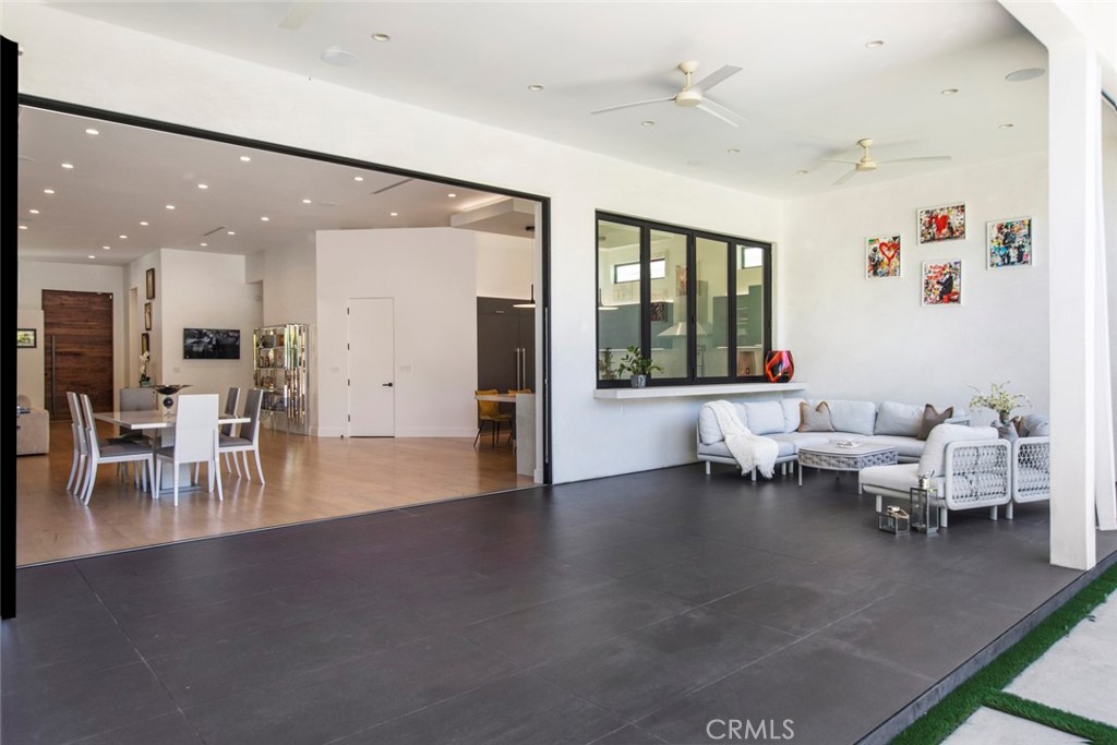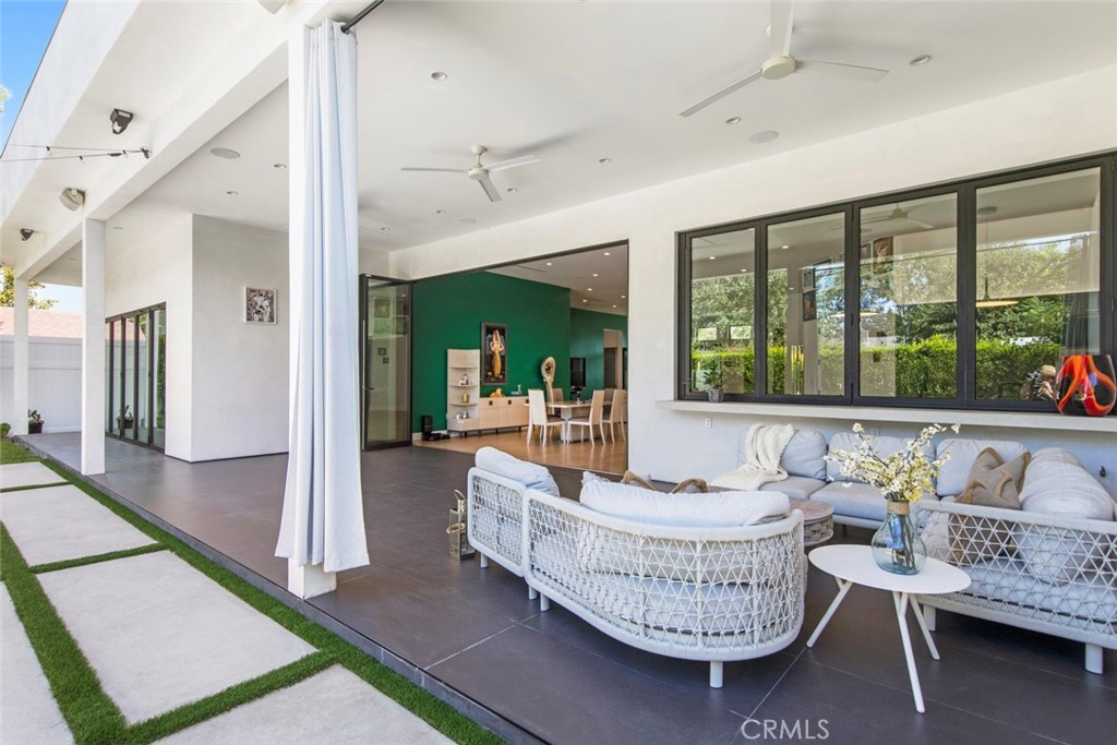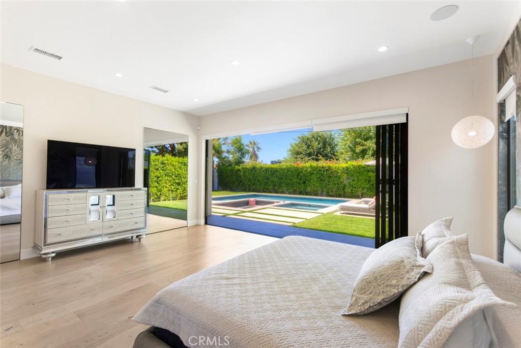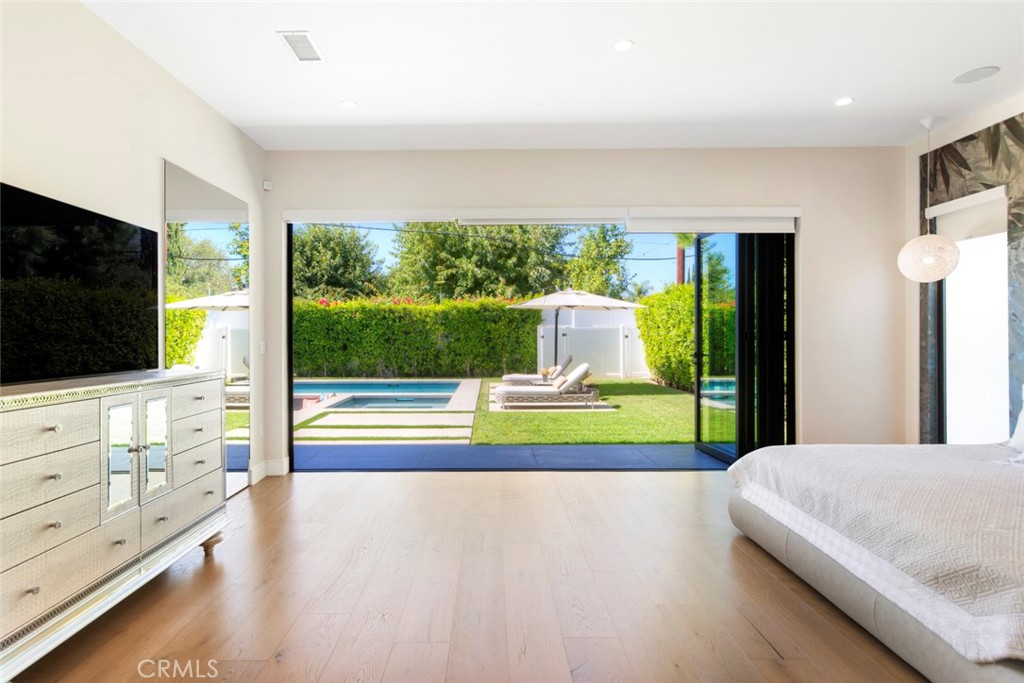 Folding glass doors effortlessly expand the living space to a generous patio and a charming backyard, featuring a sparkling pool, spa, and a sunken fire pit. The primary bedroom, a serene sanctuary, boasting a walk-in closet and an en suite bath, leads to an outdoor terrace overlooking the pool.