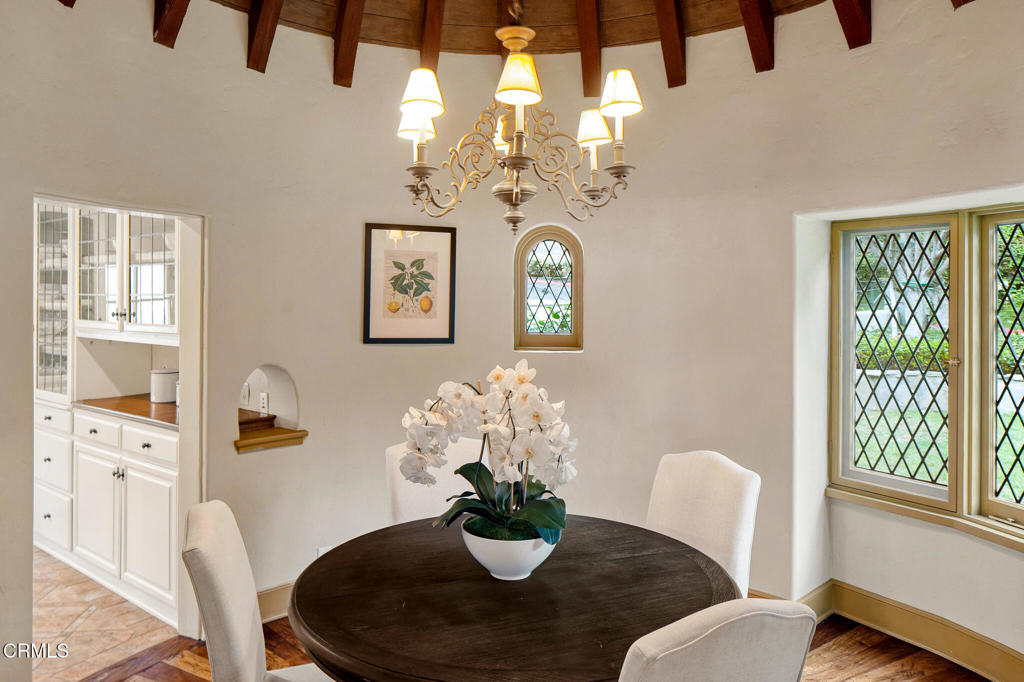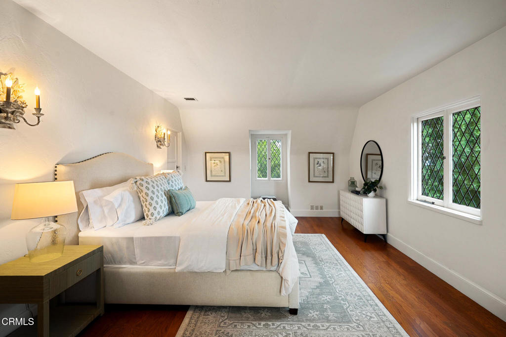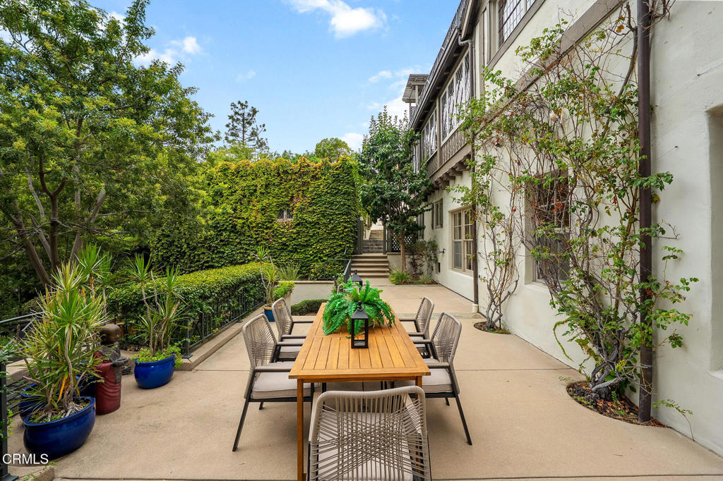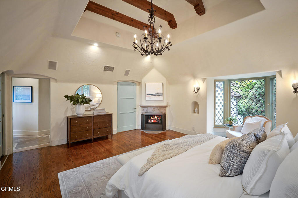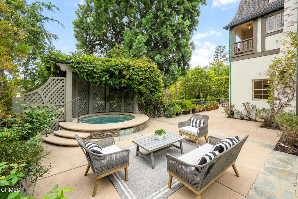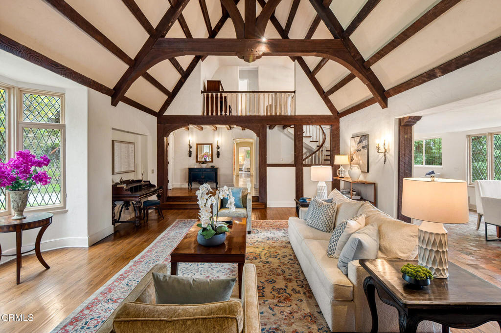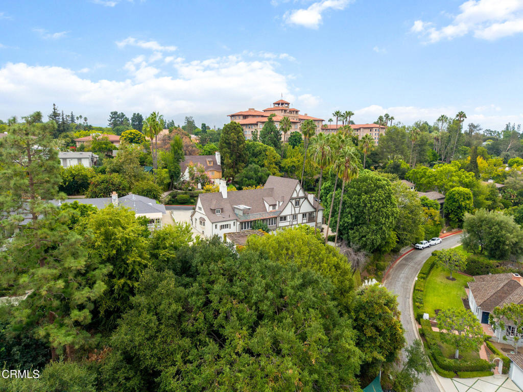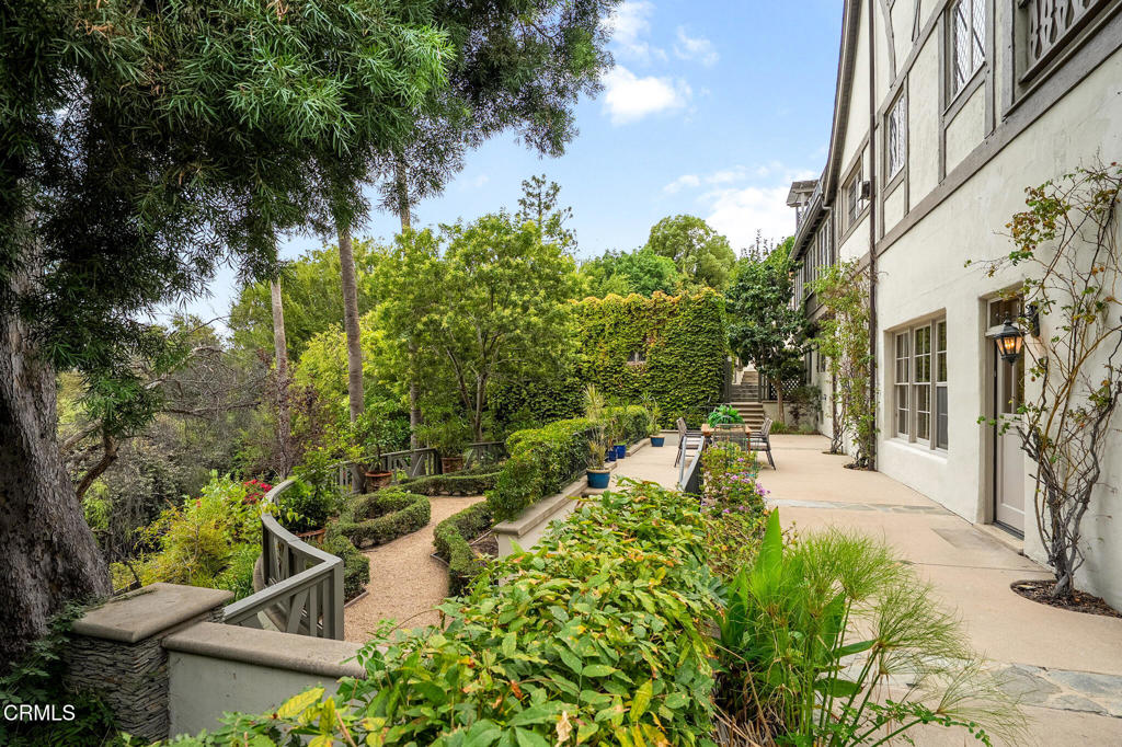 Welcome to Valley View cottage--a treasured piece of Pasadena's architectural heritage designed by Wallace Neff nearly a century ago. One of thirteen beautifully restored cottages on the gated grounds of the historic Huntington Hotel, Valley View was built in 1926 the hotel's long-time owner and manager D.M. Linnard. Rich with timeless character, the residence blends Tudor Revival and storybook cottage styles with hints of a Grimmian fairytale. As you enter, striking interiors and design flourishes echo the home's impressive exterior. In the great room, a nearly 20' ceiling features exposed trusses and beams, creating a grand space for entertaining. The formal dining room glows with natural light from a thirty-foot wall with diamond-shaped mullioned windows while the beautifully updated eat-in kitchen connects to a sunlit breakfast room. Completing the main level, you'll find a guest bedroom / media room, three-quarter bath, and the luxurious primary suite with private balcony and spa bath. Upstairs, two bedrooms share a bathroom, with the southeast bedroom featuring a private balcony and sweeping valley views. The extremely versatile lower level, with its own entrance, offers a bedroom ensuite, two offices, a gym, two kitchens, and flexible living spaces. Outdoors, tiered gardens recall a countryside manor, equally suited for entertaining or a quiet evening under the stars in the Jacuzzi. With four deeded parking spaces plus a three-car garage, guests come and go with ease. As a resident of Huntington Circle, you'll enjoy direct access to the Langham Hotel's world-class amenities--from lush gardens to fine dining. Combining exquisite architecture, modern luxury, and unmatched convenience, Valley View invites you into a timeless storybook setting where your happily-ever-after unfolds.