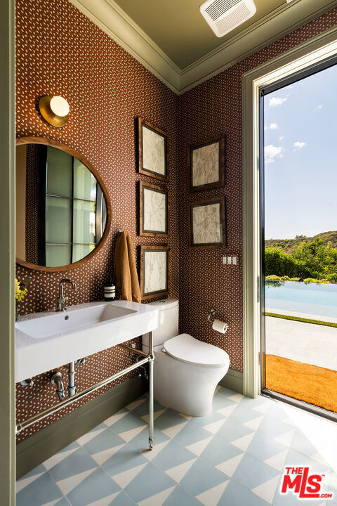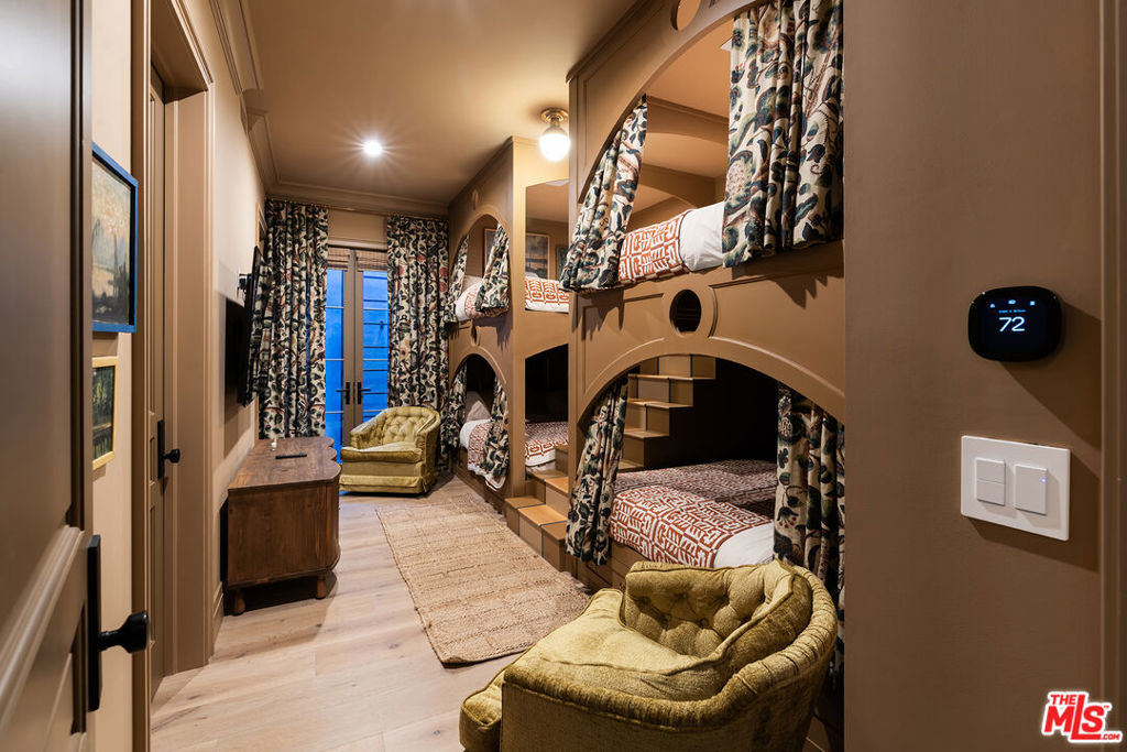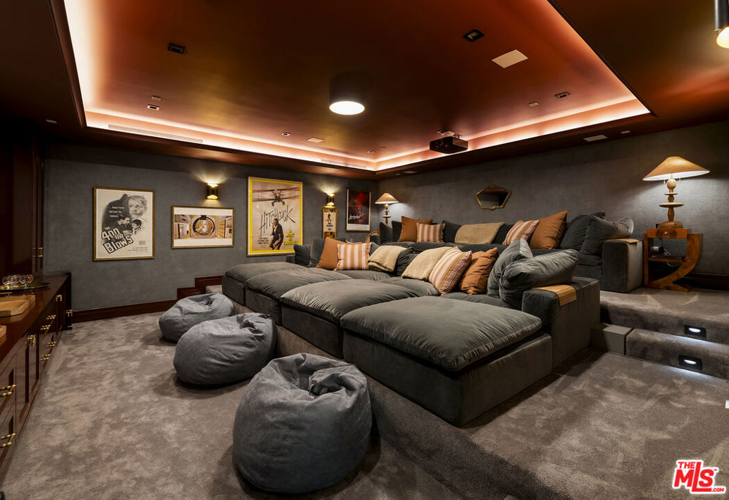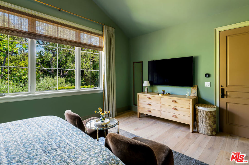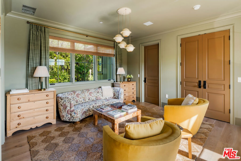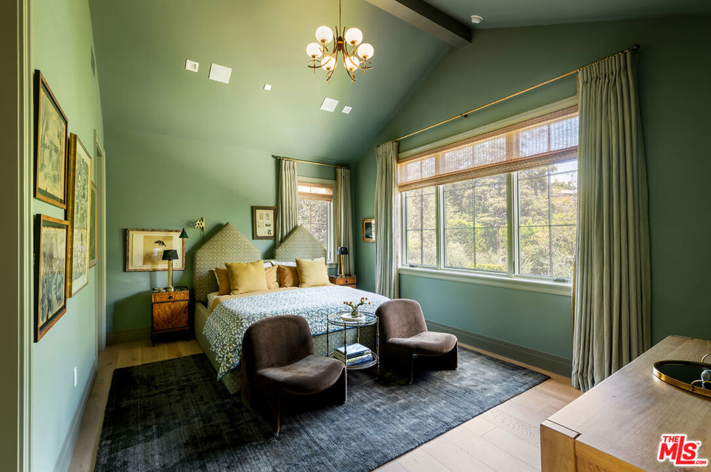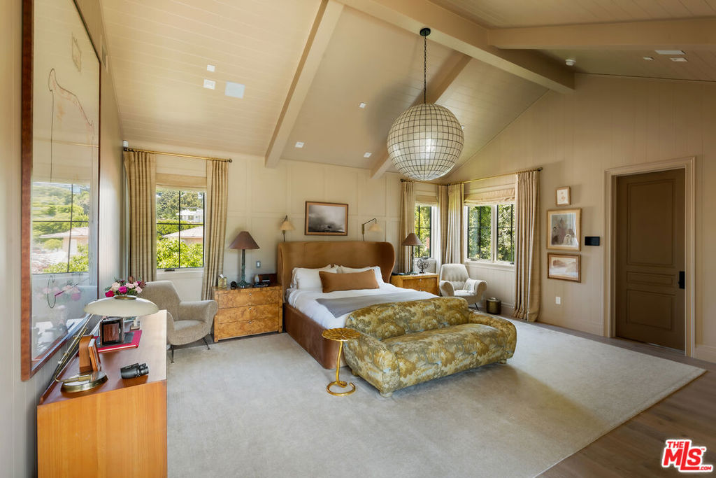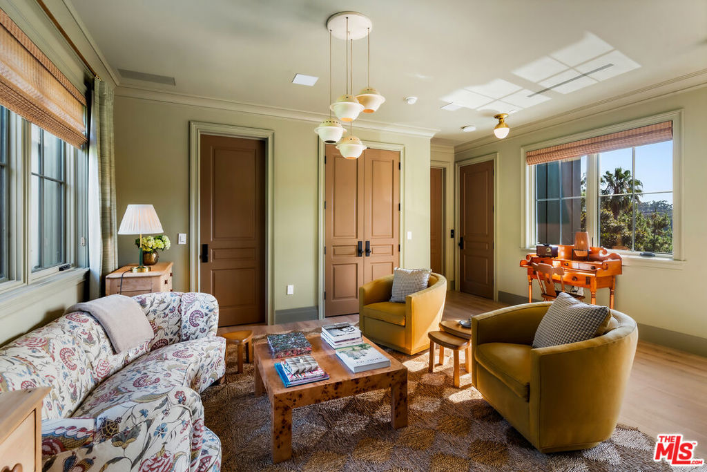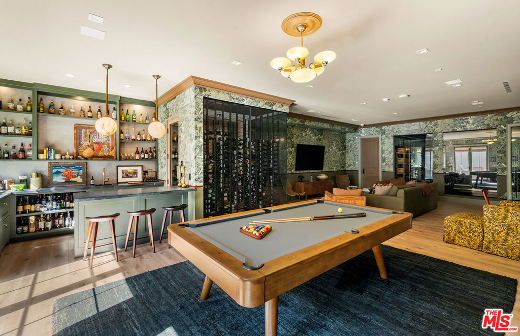 Perfectly situated in the coveted Pacific Palisades Riviera and set behind gates amidst lush and spectacular landscaping is this remarkable estate. The flawlessly executed interiors created by the renowned interior design firm Pierce and Ward, along with the home being a newly built Ken Ungar estate, make this home truly-one-of-a-kind. Every inch of the home, inside and outside, has been transformed to capture the striking canyon views and beams of light glowing through soaring windows and doors from sunrise to sunset at carefully designed vistas throughout the day. Enter through a stunning glass door to ultra-inviting living and dining rooms designed for daily enjoyment, with lavish yet welcoming interiors that appeal to all, featuring a London-chic flair mixed with mid-century design that will surely rival the best home designs executed in all of Los Angeles. The super-inviting family kitchen, with double banquet nooks you won't want to leave all day, offers counter seating, a top-of-the-line Wolf range, multiple ovens, double sinks, and wall-to-wall refrigeration, all opening to a large, stunning family room reminiscent of a chic boutique hotel. This space seamlessly transitions to a large outdoor dining table and chef's barbecue area, ideal for cooking and entertaining guests, all with stunning canyon views. The first floor also features a tucked-away office and a spacious downstairs suite, all carefully laid out with the architect's clear understanding of a masterful floor plan. The second floor boasts a primary suite tucked in its own wing, with dual doors, a fireplace, two walk-in closets: one on each end, a luxurious bath suite, for two, with an oversized double shower, soaking tub, two water closets, separate sink areas, and make-up seating for her, all with beautiful views of the meticulously landscaped grounds and a balcony completing this truly intimate and cozy suite. Across the landing, the second floor also offers a cozy upstairs family room set between three suites, each designed with extraordinary interiors and beautiful tree-top views. An elevator services all three floors, including the lower level, which features the single most inviting screening room, clearly designed for family and friends' movie nights. The lower floor also boasts a large open family room/pool and game room, a stunning bar area, and a wine room, all opening to a cozy patio with plenty of room to enjoy a cold plunge after Pilates in the custom-designed double studio suite and sauna. Down the hall, there is a jaw-dropping four-bed bunk room suite, perfect for late-night sleepovers or additional holiday guests. To complete this lush estate, there is an infinity-edge pool, oversized Baja shelves and spa, a built-in trellis with a fireplace, and a lower-level multiple seating area for guests, parties, and late-night conversations in this award-worthy landscape design encasing the entire estate. Simply exquisite and clearly one of Pierce and Ward's finest design and landscape visions.
