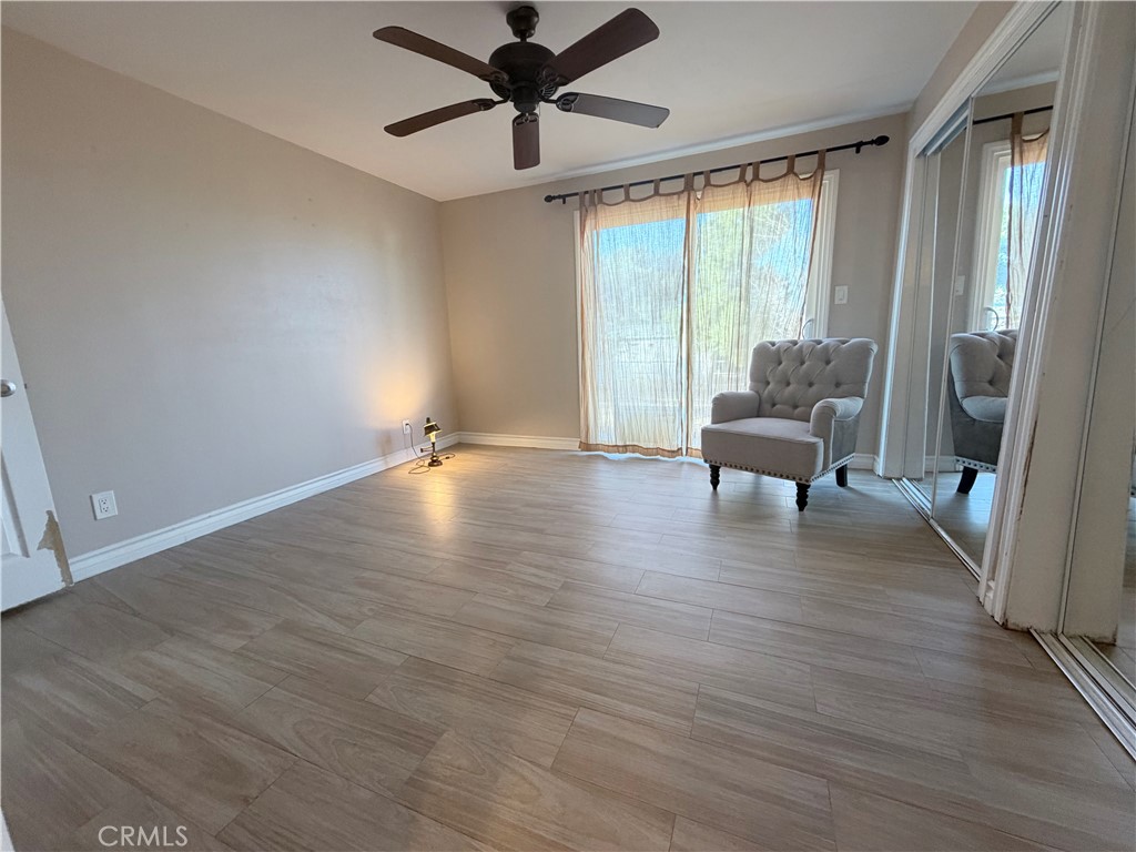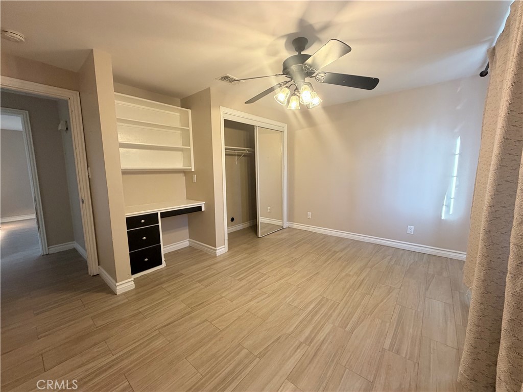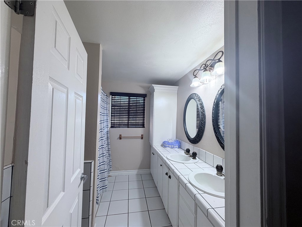 Interior Features: Spacious living room with natural light, sliding glass doors, and cozy fireplace corner, Functional kitchen with plenty of cabinet space, tiled countertops, and adjacent dining nook, Comfortable bedrooms with ceiling fans, neutral tones, and closet space, Two full bathrooms, including a dual vanity with framed mirrors and a tiled shower