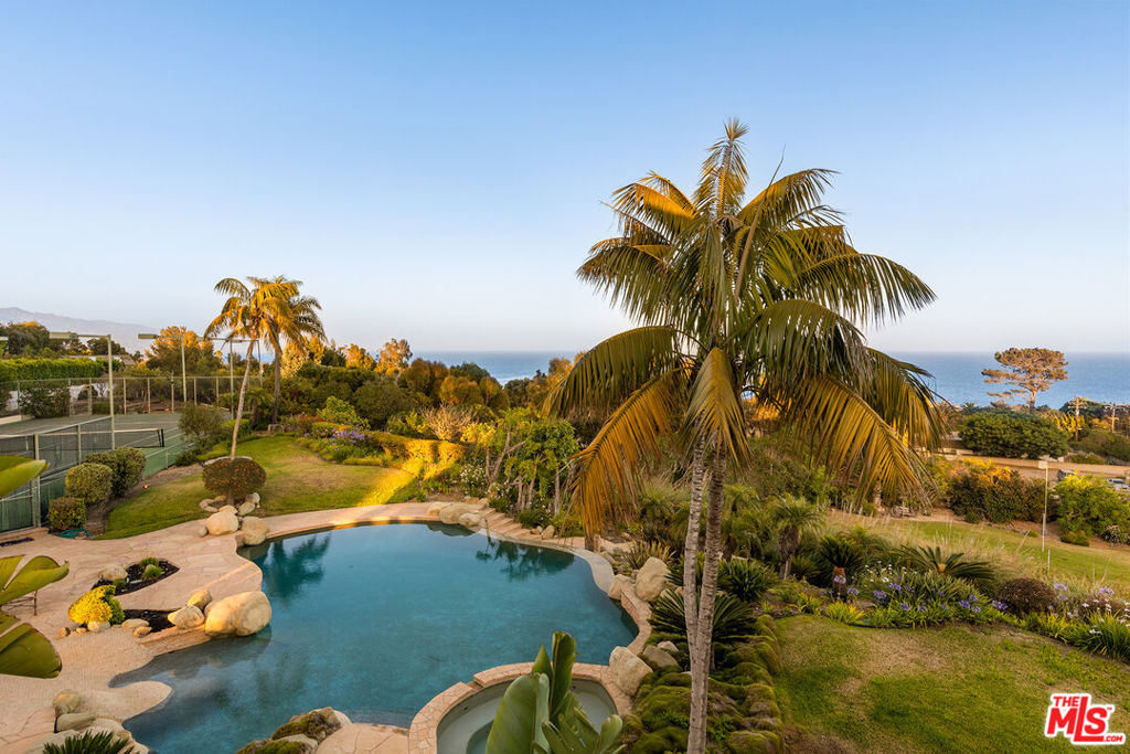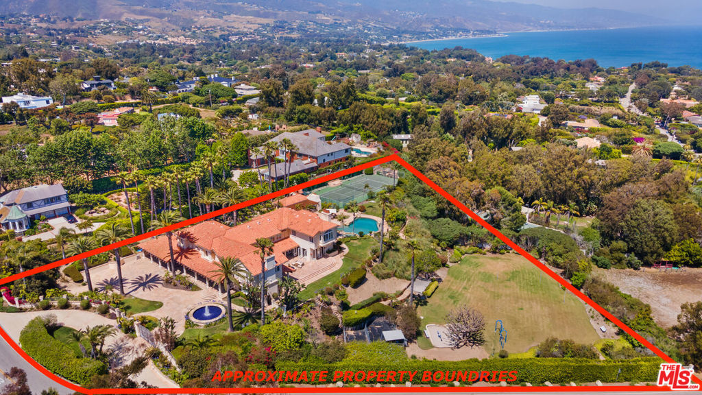 This Idyllic Mediterranean Estate on 2+ Acres at the heart of Point Dume with 180* Promontory Ocean and Point views combines traditional sophistication, warmth, and timeless European design in a private and peaceful So Cal setting. World class amenities include Gated Entry, Resort Lagoon pool with hot tub & water feature, tennis/sport court w/ equipment room, pool house w/outdoor kitchen, dining, bar, living area w/ fireplace, gated motor court with multiple parking spaces & guest parking, detached one bedroom guest house, and a wine cellar. This offering includes a 74,512 Sq Ft. main lot + an additional smaller 14,348 Sq. Ft. lot that connect to each other at the lower sports field where kids have the freedom to run and play or to accommodate larger events. At approximately 10,000 Sq Ft. the main residence features Public Rooms on the first floor and Private Family living on the second floor. Access the second level from one of two staircases to find an incredible Primary Suite featuring Coastline, Ocean, and Horizon Views, bath with steam shower, jetted tub, dual sinks and water closets, and dressing room. Completing this level are 3 additional bedroom suites with full ensuite bathrooms, a dance/yoga studio, and an executive office. On the first floor, rooms are expansive and the floor plan is thoughtfully positioned against the views and usefulness of spaces. The Great Room faces the Pool and a children's play area, and its features include eat-in dining, wet bar, wood burning fireplace, and breathtaking Point Dume & Ocean Views. At the heart of the home is a Gourmet Kitchen with breakfast nook and counter dining, full suite appliances, dual refrigerators, custom Scandinavian cabinets, and pantry and service areas both of which are nearby the formal and casual dining. Completing the lower level is an entertainment room with pool table and fireplace as well as full Maid's Quarters w/ ensuite bath & service entrance. This seasoned home is strategically positioned to take full advantage of Malibu's impressive Sunsets and coastal breezes. Move right in and enjoy, or take advantage of the current size of the home and its' layout to cosmetically update and personalize to make it your own. Text agent for a quick reply.