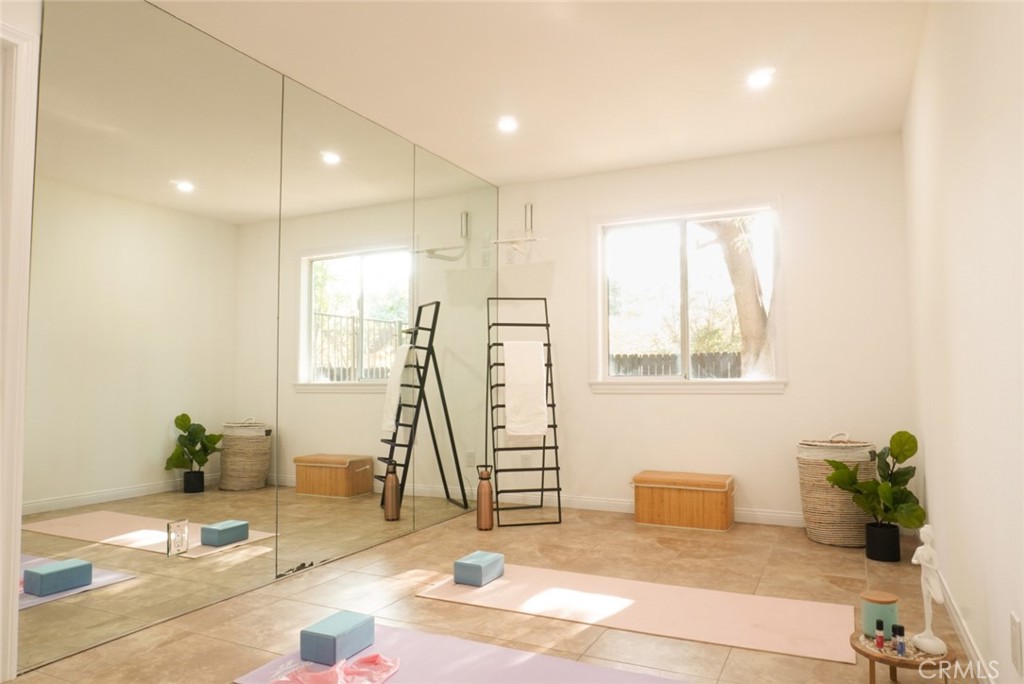 A dramatic formal foyer introduces soaring ceilings, natural light, and a sweeping curved staircase. The formal living room features a fireplace and expansive windows, flowing seamlessly into the family room. The family room is complete with a full bar, second fireplace, and sliding access to the pool and outdoor living space. The gourmet kitchen boasts travertine and granite surfaces, abundant natural light, a spacious eat-in area, breakfast bar, and convenient pool access. An adjacent dining room opens to a private patio- perfect for alfresco entertaining. On the main level you'll find two bedrooms, from which one is en-suite, a powder room, and a versatile fitness room near the kitchen/laundry wing.