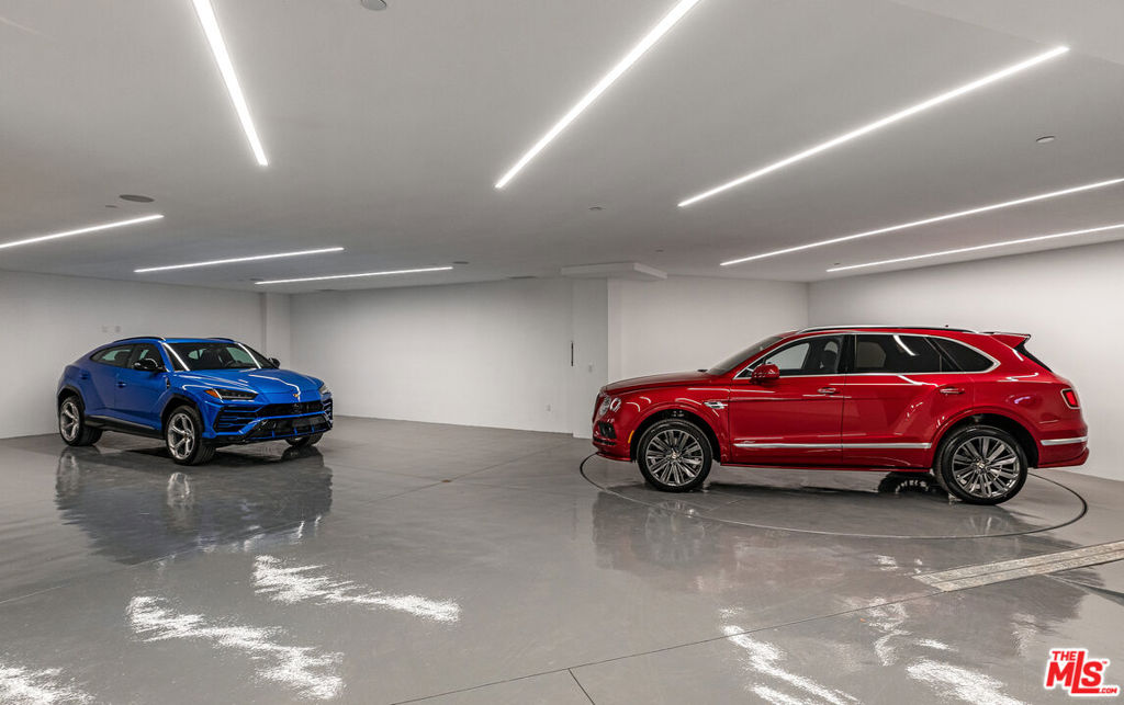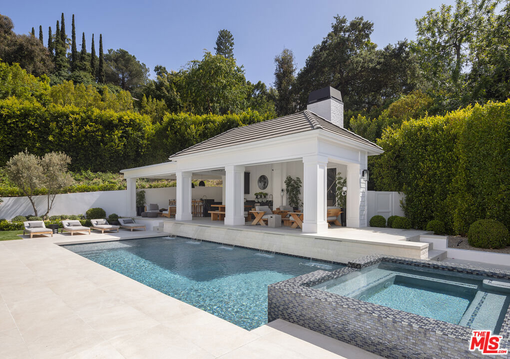 Positioned within the coveted Hidden Valley enclave of Beverly Hills, this impeccable estate offers privacy and tranquility behind secure gates, with 24/7 guard protection and lush, mature landscaping. Situated in one of the area's most prestigious guard-gated communities, this residence showcases timeless design, grand proportions, and a thoughtfully updated aesthetic that harmonizes with its natural surroundings. Every element of this home has been masterfully conceived to deliver an unparalleled living experience. A dramatic 24-foot ceiling in the entry foyer sets the tone, featuring custom-crafted millwork and elegant wrought-iron accents that echo throughout the interiors. Spanning approximately 12,000 square feet, the residence is graced with wide-plank white oak floors, 12-foot-high ceilings, and expansive windows that frame serene canyon vistas. The main level unfolds with a series of distinguished spaces, including a formal living room, office, formal dining room, and multiple powder rooms. A spacious family room seamlessly connects to the outdoor entertaining areas, where a sprawling backyard oasis includes a pool, spa, outdoor kitchen, bar, dining pavilion, and fire pit lounge. The chef's kitchen is a masterpiece of both design and functionality, outfitted with honed Calacatta marble countertops, a La Cornue 1908 range and oven, Wolf microwave, Sub-Zero refrigerator and freezer, dual Miele dishwashers, a wine fridge, and an oversized eat-in island, all framed by crisp white cabinetry. Two ensuite bedrooms and a two-car garage complete the main floor. Effortless access to the estate's three levels is provided by a private elevator. Upstairs, the opulent primary suite offers a serene retreat with a fireplace, a balcony with picturesque views, dual marble bathrooms featuring soaking tubs, and a pair of custom dressing rooms with abundant built-in storage. Four additional ensuite bedrooms, each with spacious dressing closets, complete this floor. The lower level features a host of amenities for relaxation and entertainment. With 11-foot ceilings, this space includes a cozy home theater, a wet bar, lounge, gaming area, temperature-controlled wine room, fully equipped fitness studio, and laundry facilities. Additionally, the subterranean auto gallery spanning approximately 2,590 square feet boasts a revolving car turntable and accommodates up to six vehicles, offering limitless opportunities for customization. Fully automated through Savant and Lutron systems, the home's technology provides seamless control over lighting, drapery, audio, televisions, fireplaces, and entry systems, ensuring modern convenience at every turn. Perfectly positioned within top-tier school districts and offering convenient access to Beverly Hills, the Westside, and the Valley's finest shopping, dining, and nightlife, this estate is a rare offering that combines sophistication, comfort, and cutting-edge amenities.