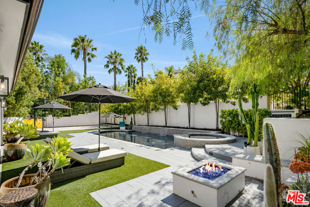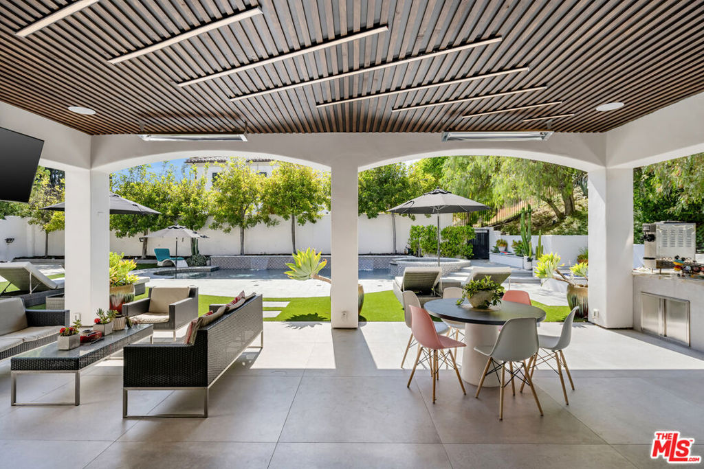 Nestled within the coveted guard-gated enclave of Monte Verde Estates and bordering the prestigious El Caballero Country Club, this Montecito-inspired Spanish estate offers an unparalleled combination of scale, privacy, and timeless elegance. A dramatic rotunda foyer with a skylit stairwell and a sweeping spiral staircase makes a striking first impression, setting the tone for the home's refined interiors. Expansive windows invite an abundance of natural light, while capturing serene hillside views that enhance the sense of openness and connection to nature. The main level is designed for both grand entertaining and effortless living. Two bedrooms flank the great room and formal living room, anchored by a fireplace and wet bar. A temperature-controlled wine cellar adds a sophisticated and convenient touch for the wine connoisseur. The formal dining room overlooks a lush putting green and transitions seamlessly into the gourmet chef's kitchen, appointed with professional-grade stainless steel appliances, a large island, and elegant wood and marble finishes. The kitchen flows into a relaxed, informal family room with a fireplace, and extends outdoors to a heated, covered terrace. Here, multiple lounge and dining areas surround the outdoor kitchen, firepit, pool, spa, TV, and lighted sport courtcreating a private resort-like atmosphere. Upstairs, a private screening room with en-suite bath, which could easily be converted to a seventh bedroom, is complemented by three additional en suite bedrooms. The primary suite crowns the residence with a sitting area and fireplace, private viewing deck, and spa-inspired bath featuring a jetted tub, steam shower, dual vanities, and two custom walk-in closets. Meticulously upgraded and designed for modern luxury, this estate represents one of the finest values within a premier gated community. Just moments from fine dining, shopping, and top-rated schools, it offers the perfect blend of elegance and convenience. Discover the lifestyle of Monte Verde Estates, where sophistication meets serenity.