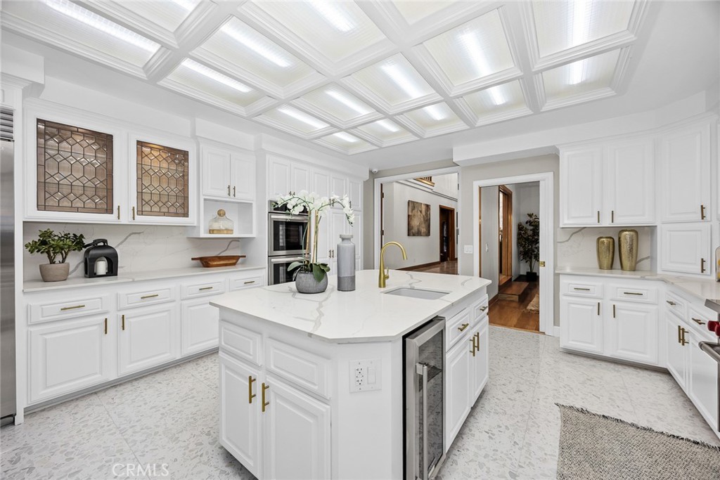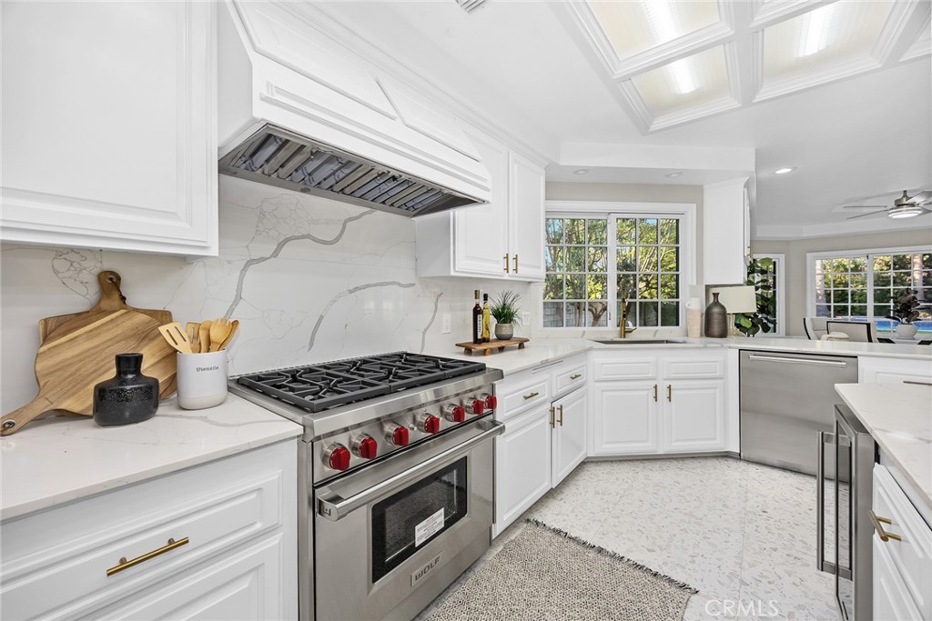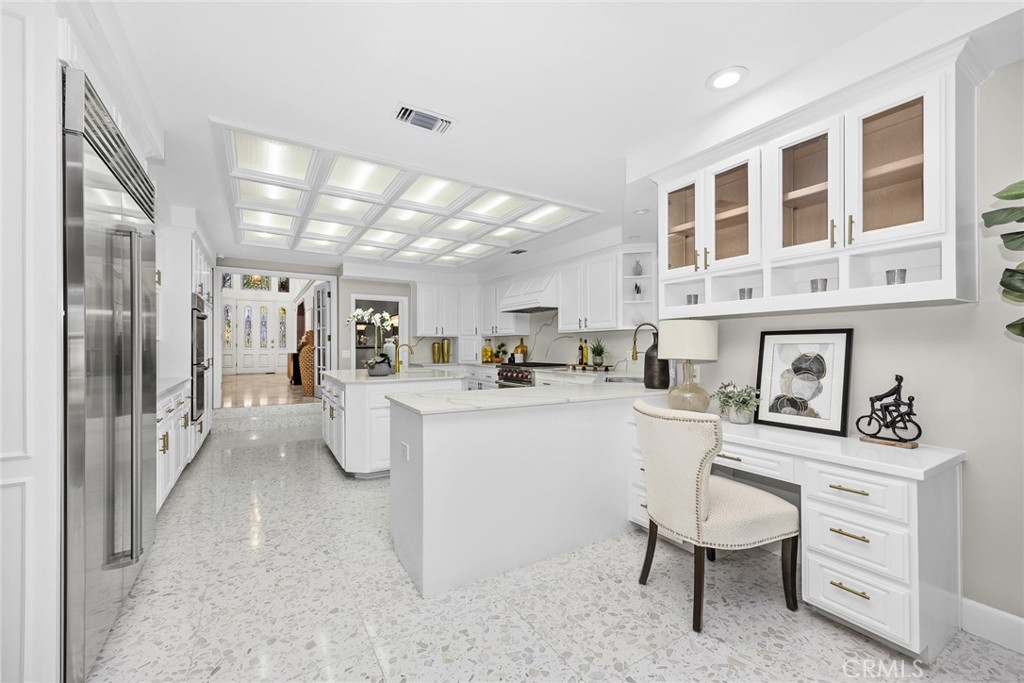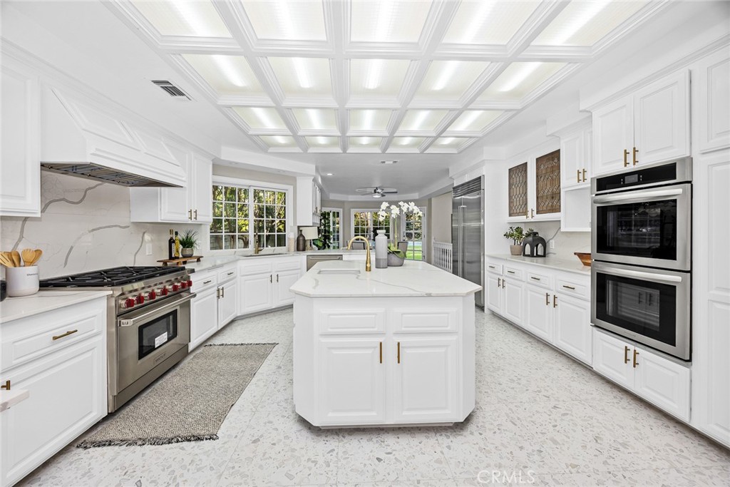 GOURMET CHEF’S KITCHEN FEATURING A LARGE CENTER ISLAND WITH CORTZ COUNTERTOPS, HIGH-END WOLF AND SUB-ZERO APPLIANCES, AND A CHARMING BREAKFAST ALCOVE