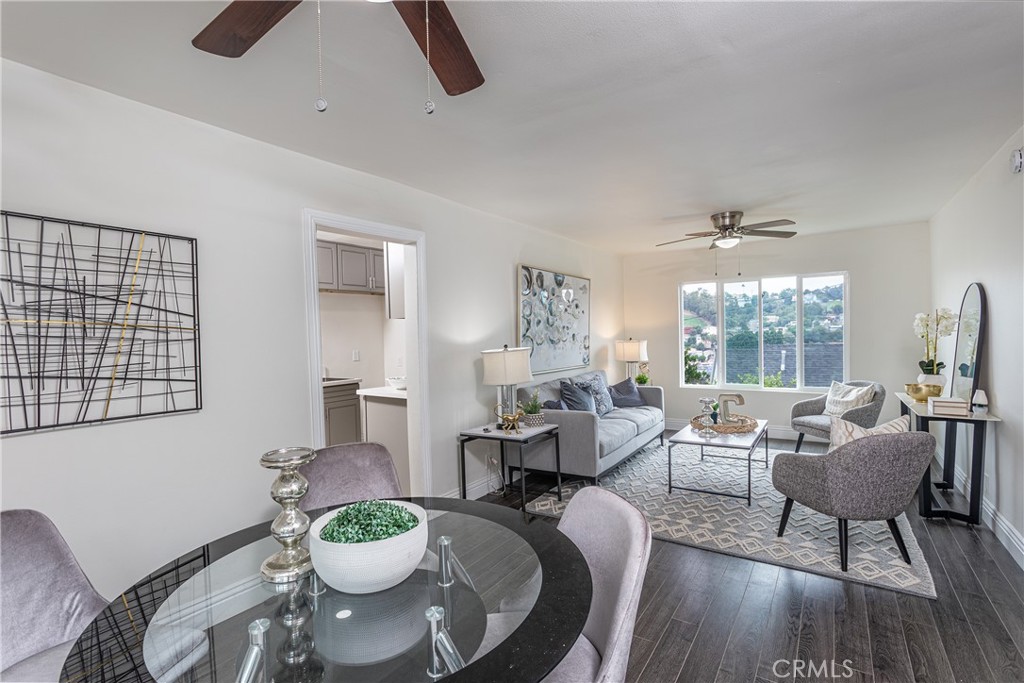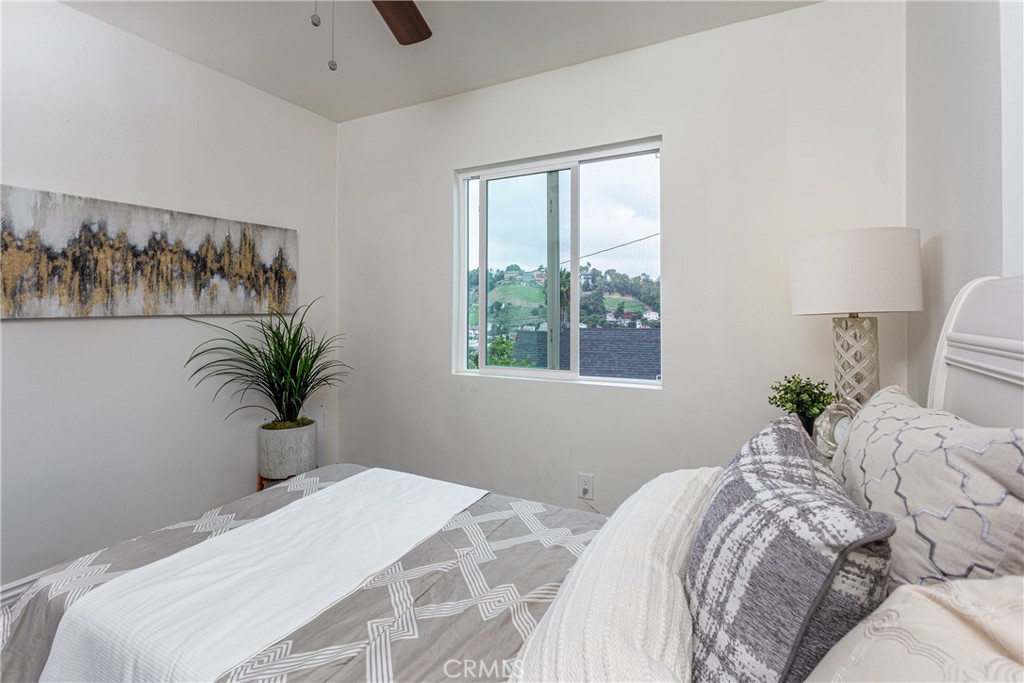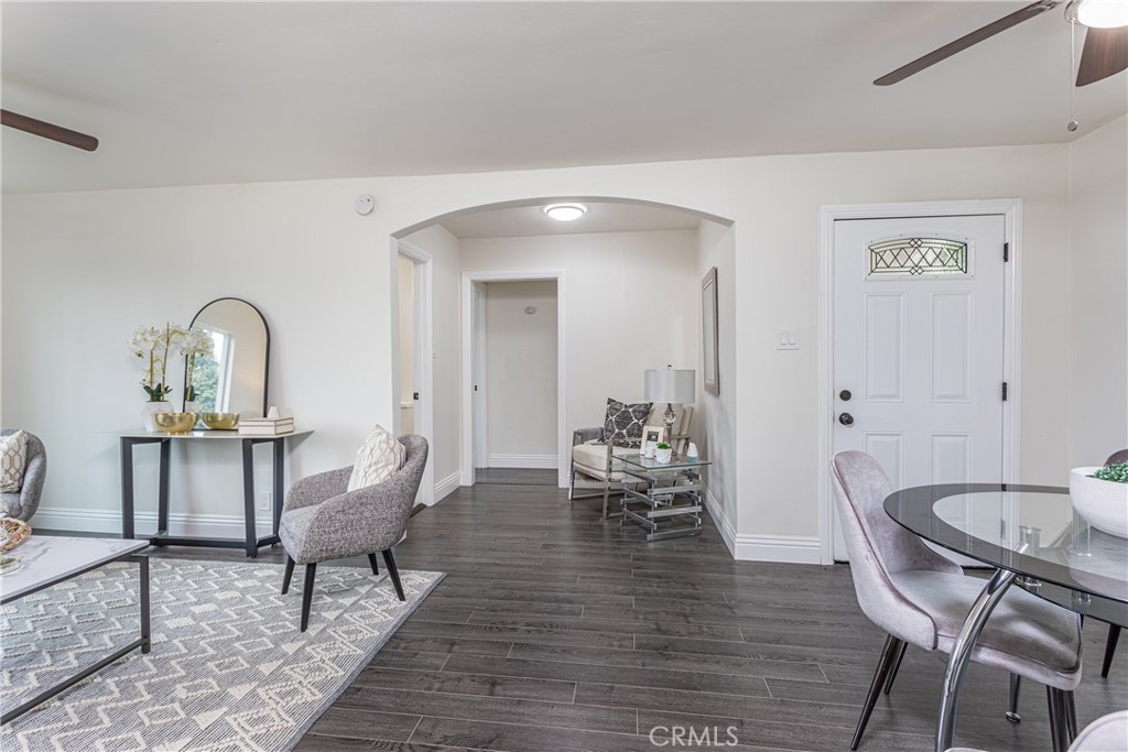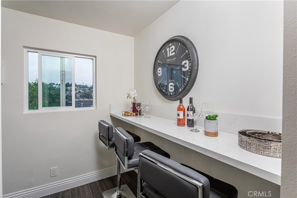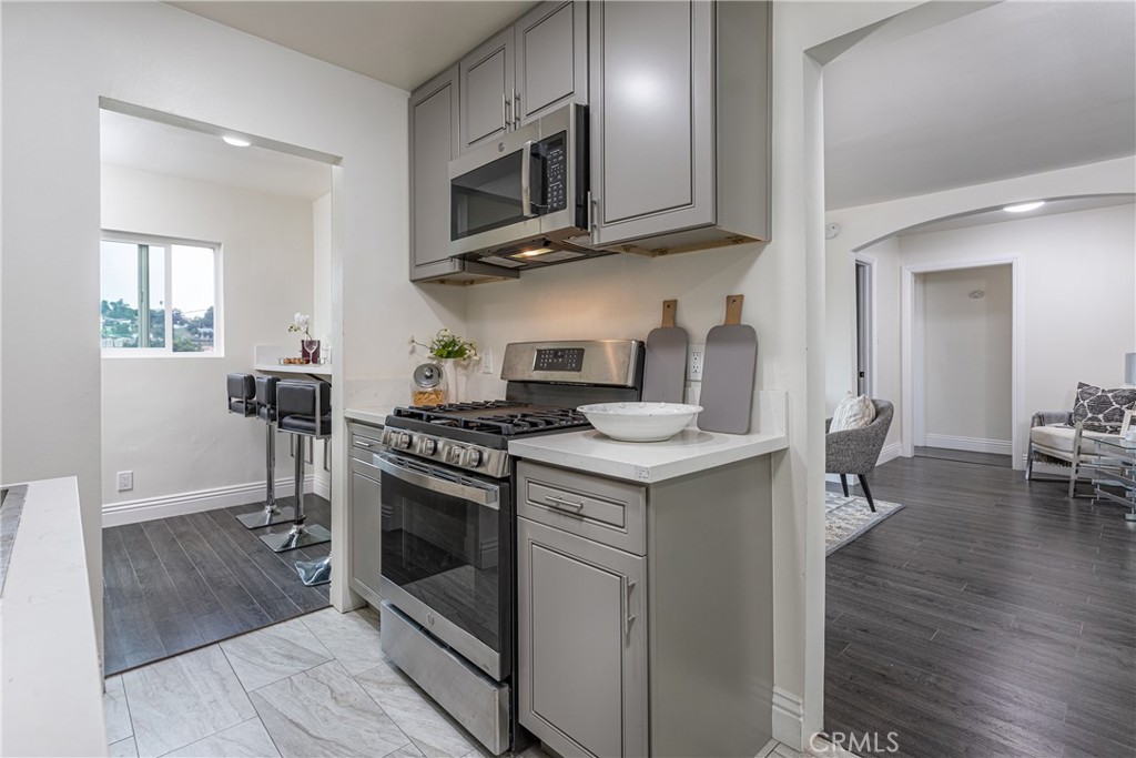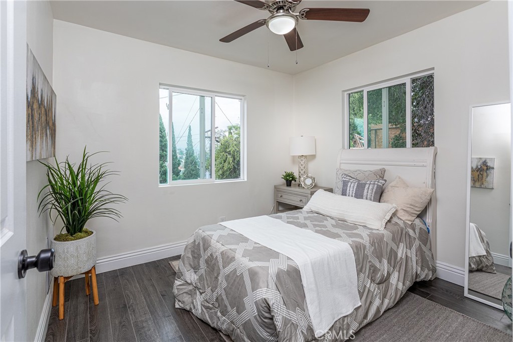 Move in Ready! Nestled on a peaceful hillside in the University Hills neighborhood of Los Angeles is this freshly updated gorgeous home with a generous amount of living space. The living room, a great space to relax with family and friends, has freshly painted walls and beautiful laminated flooring that extends into the dining area, kitchen, and bedrooms. The galley kitchen has new stainless-steel appliances and trendy vinyl plank flooring. The adjacent bonus area has bar seating with an added storage area. Rounding out the main floor are three light and bright bedrooms with ceiling fans, and a fully updated bathroom with a gorgeous, tiled shower tub and quartz topped vanity. Downstairs are two additional bedrooms, a full bathroom complete with a tiled shower tub, and a single sink vanity along with additional storage space. There is also a door leading to the private backyard, a perfect space to make your own outdoor oasis. This incredible home is located near Cal State Los Angeles University, coffee shops, restaurants, shopping, Ascot Hills Park, and more. Do not miss this amazing opportunity to own this expansive home!