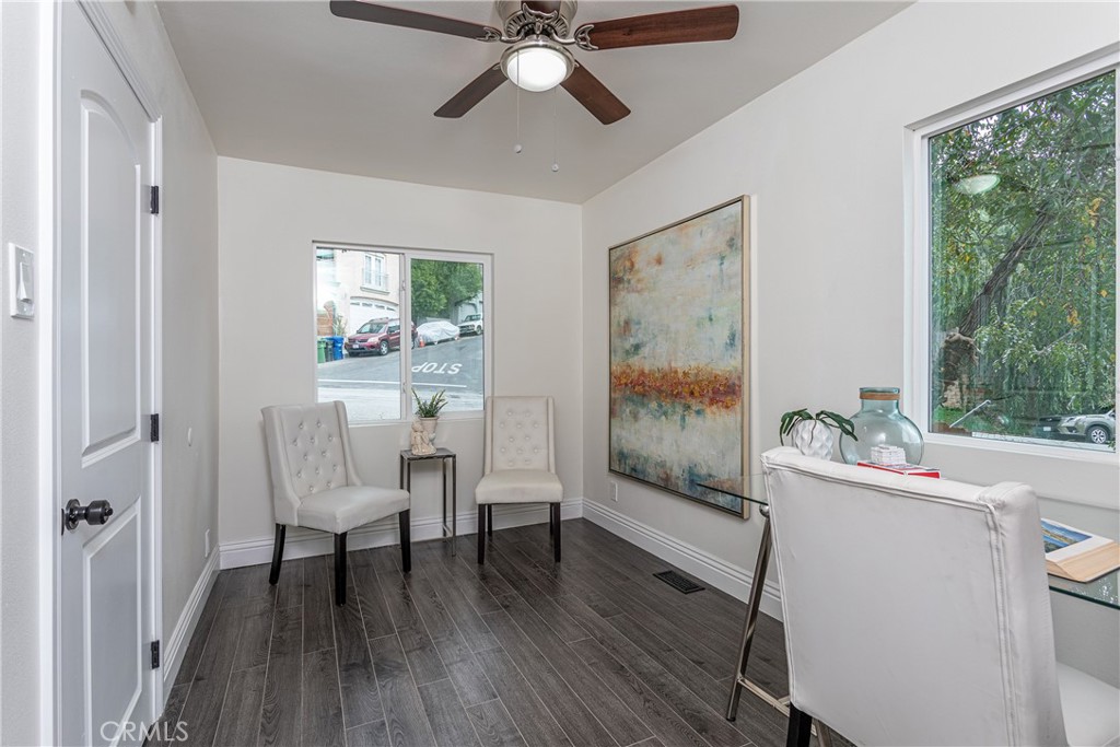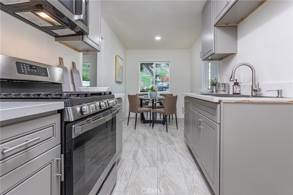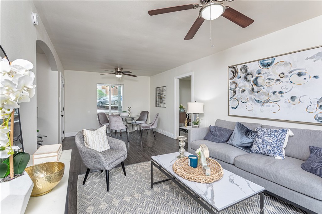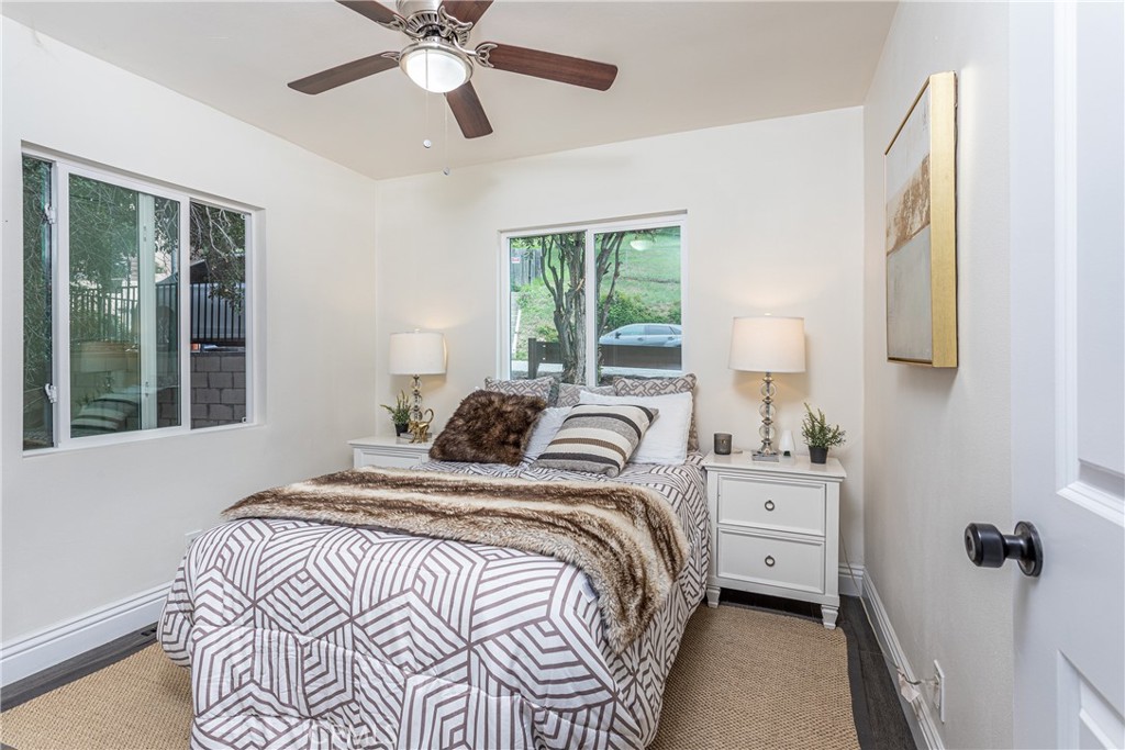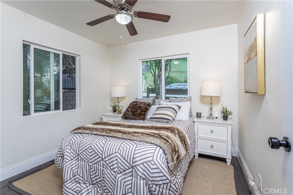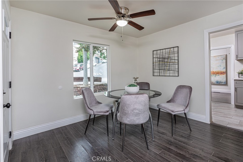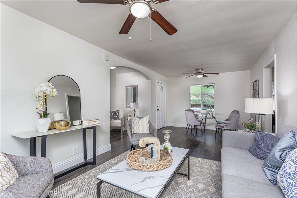 Move in Ready! Nestled on a peaceful hillside in the University Hills neighborhood of Los Angeles is this freshly updated gorgeous home with a generous amount of living space. The living room, a great space to relax with family and friends, has freshly painted walls and beautiful laminated flooring that extends into the dining area, kitchen, and bedrooms. The galley kitchen has new stainless-steel appliances and trendy vinyl plank flooring. The adjacent bonus area has bar seating with an added storage area. Rounding out the main floor are three light and bright bedrooms with ceiling fans, and a fully updated bathroom with a gorgeous, tiled shower tub and quartz topped vanity. Downstairs are two additional bedrooms, a full bathroom complete with a tiled shower tub, and a single sink vanity along with additional storage space. There is also a door leading to the private backyard, a perfect space to make your own outdoor oasis. This incredible home is located near Cal State Los Angeles University, coffee shops, restaurants, shopping, Ascot Hills Park, and more. Do not miss this amazing opportunity to own this expansive home!