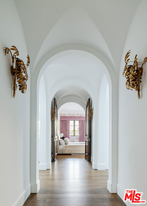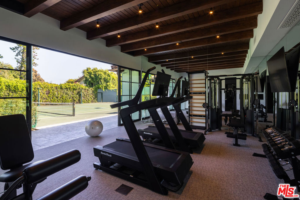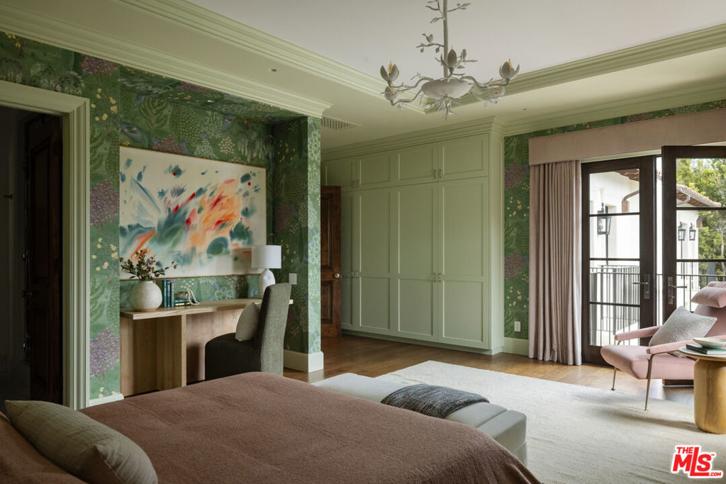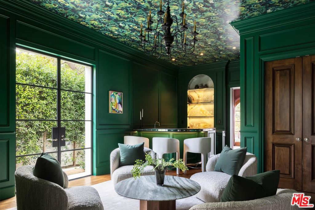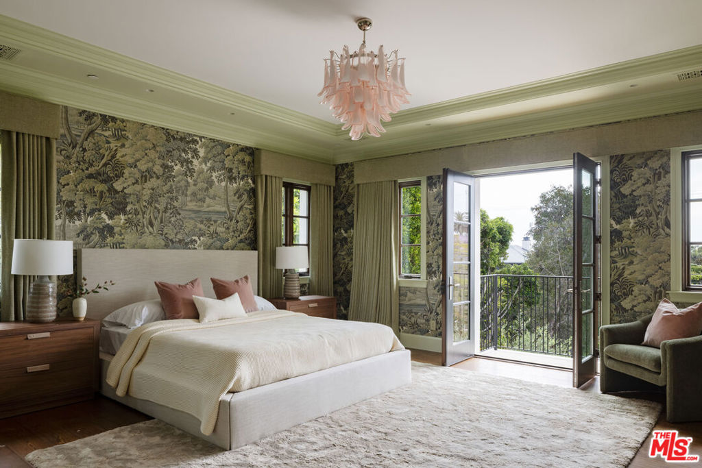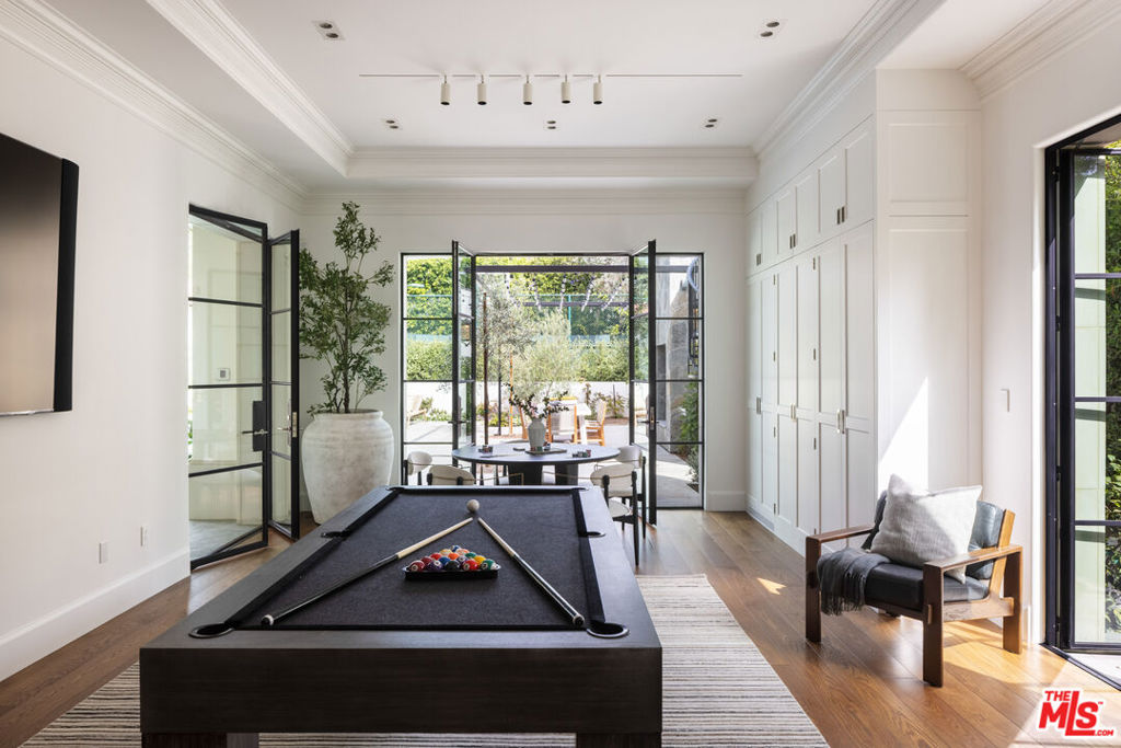 Behind the gates of a private motor court in the heart of Brentwood Park stands The House of Hanover. Timeless European architecture reimagined through a contemporary lens this is the result of a three-year collaboration between AY Architects, Rattigan Construction, and Coppel Design. Spanning nearly 12,000 square feet entirely above grade, the residence reflects uncompromising craftsmanship at every turn. Dramatic ceiling heights and voluminous interiors unfold through a sequence of elegant spaces framed by arched passages, wide-plank wood floors, and black steel windows and doors accented with Nanz New York hardware. The Italian chef's kitchen crafted by Officine Gullo Firenze is a statement in precision and beauty, showcasing hand-finished stainless steel cabinetry, an eight-burner range, and Gaggenau dual ovens and refrigeration. Formal and informal living rooms, a pub lounge, game room, library and dining salon together create a seamless flow ideal for both grand entertaining and intimate living. Upstairs, five generous en suite bedrooms reveal an artful interplay of pattern and stone, featuring House of Hackney wall coverings and exquisite natural marbles. The primary suite is a private sanctuary with dual baths clad in Norwegian Rose marble and custom walk-in dressing rooms, each designed with couture-level detail. Beyond the main residence, the grounds evoke a private resort with a resort-sized pool, north-south tennis court and a spectacular entertainer's pavilion complete with raised-beam ceilings and a full bar overlooking the tennis court. Additional amenities include a detached professional gym, state-of-the-art theater, pool changing room with outdoor shower, full outdoor kitchen with bbq and pizza oven and a three-car garage with built-in storage. Throughout, every fixture and finish tells a story of connoisseurship: lighting by Paul Ferrante, Mechini, I Borbone and Murano chandeliers, plumbing by Sherle Wagner and THG, Crestron home automation, solar system and a backup generator for seamless comfort and effortless lifestyle. The House of Hanover represents the rarest form of Los Angeles luxury, a one-of-one estate of timeless character and contemporary grace.