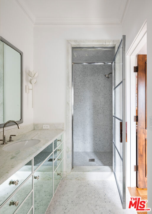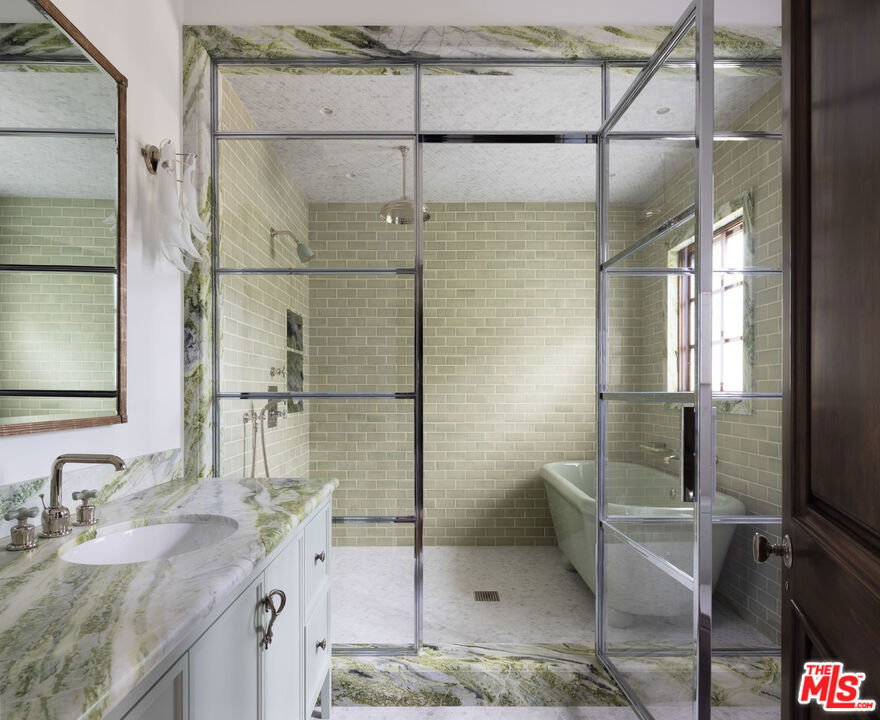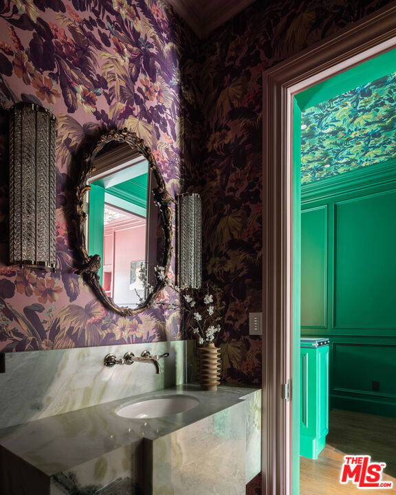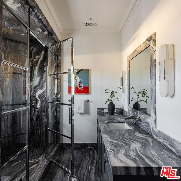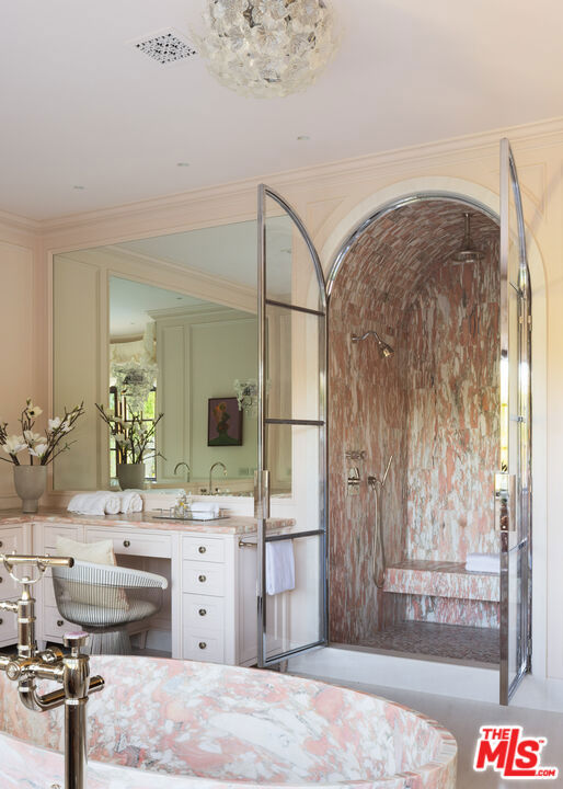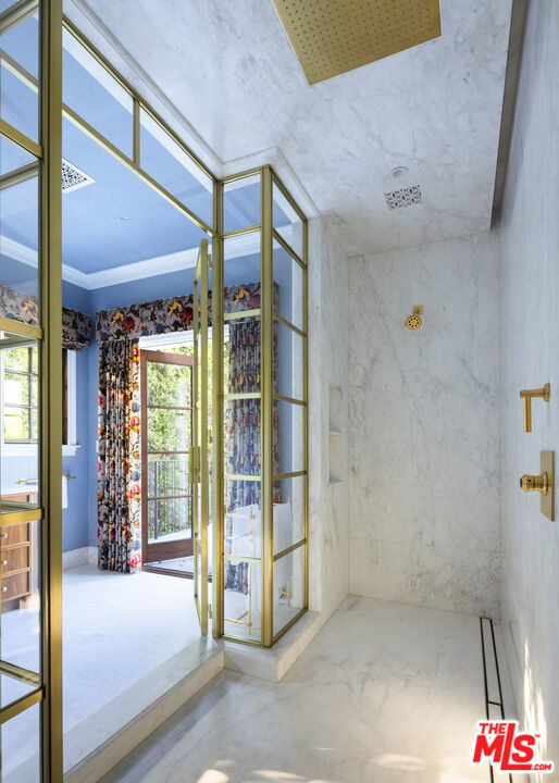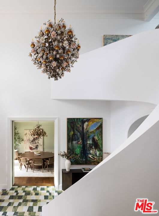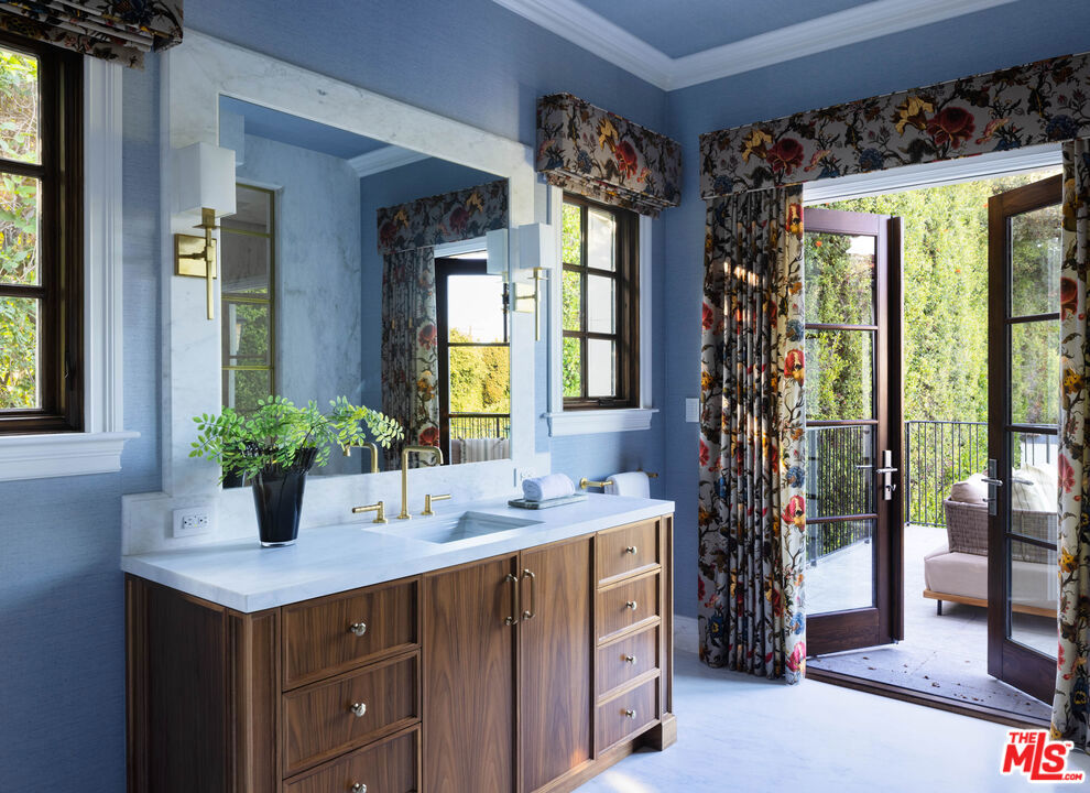 Behind the gates of a private motor court in the heart of Brentwood Park stands The House of Hanover. Timeless European architecture reimagined through a contemporary lens this is the result of a three-year collaboration between AY Architects, Rattigan Construction, and Coppel Design. Spanning nearly 12,000 square feet entirely above grade, the residence reflects uncompromising craftsmanship at every turn. Dramatic ceiling heights and voluminous interiors unfold through a sequence of elegant spaces framed by arched passages, wide-plank wood floors, and black steel windows and doors accented with Nanz New York hardware. The Italian chef's kitchen crafted by Officine Gullo Firenze is a statement in precision and beauty, showcasing hand-finished stainless steel cabinetry, an eight-burner range, and Gaggenau dual ovens and refrigeration. Formal and informal living rooms, a pub lounge, game room, library and dining salon together create a seamless flow ideal for both grand entertaining and intimate living. Upstairs, five generous en suite bedrooms reveal an artful interplay of pattern and stone, featuring House of Hackney wall coverings and exquisite natural marbles. The primary suite is a private sanctuary with dual baths clad in Norwegian Rose marble and custom walk-in dressing rooms, each designed with couture-level detail. Beyond the main residence, the grounds evoke a private resort with a resort-sized pool, north-south tennis court and a spectacular entertainer's pavilion complete with raised-beam ceilings and a full bar overlooking the tennis court. Additional amenities include a detached professional gym, state-of-the-art theater, pool changing room with outdoor shower, full outdoor kitchen with bbq and pizza oven and a three-car garage with built-in storage. Throughout, every fixture and finish tells a story of connoisseurship: lighting by Paul Ferrante, Mechini, I Borbone and Murano chandeliers, plumbing by Sherle Wagner and THG, Crestron home automation, solar system and a backup generator for seamless comfort and effortless lifestyle. The House of Hanover represents the rarest form of Los Angeles luxury, a one-of-one estate of timeless character and contemporary grace.