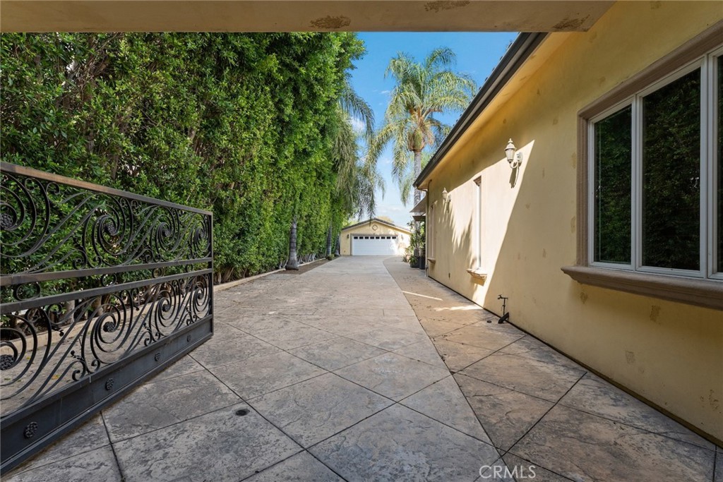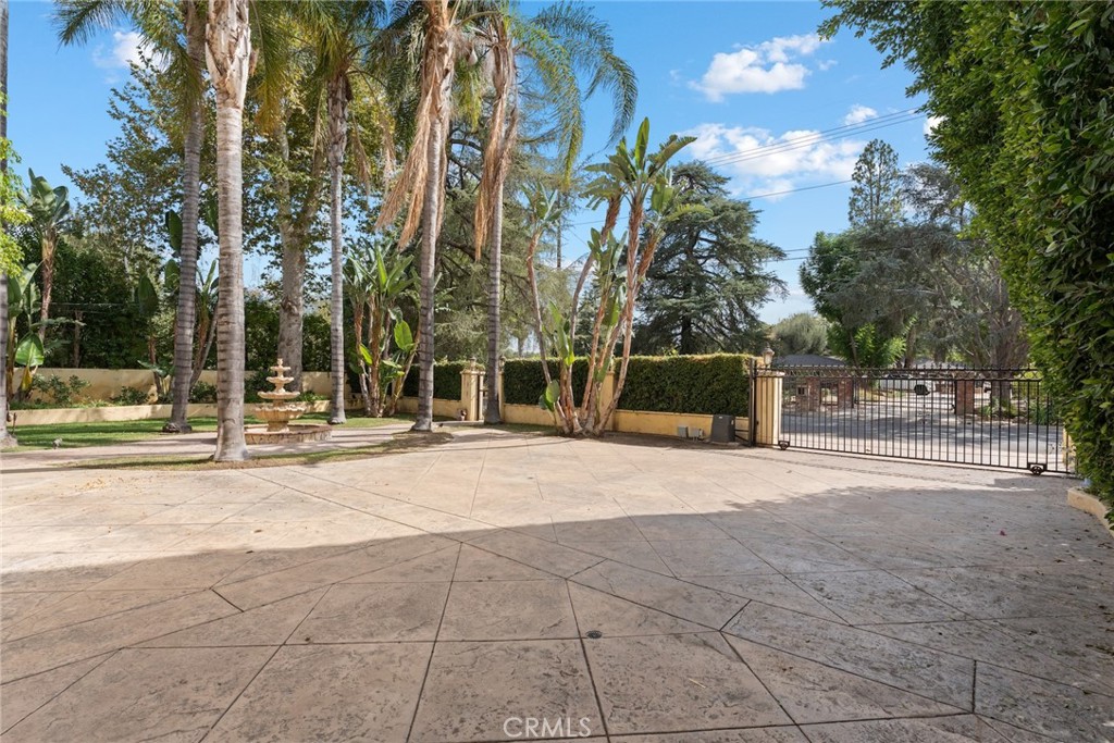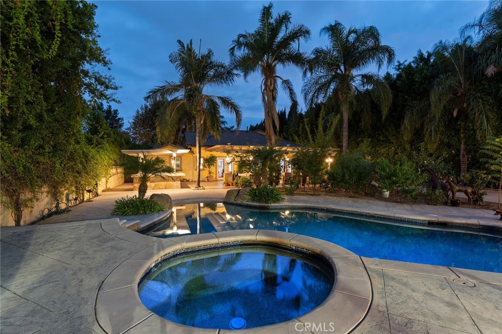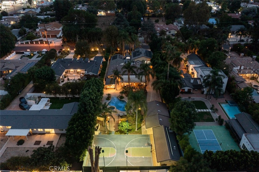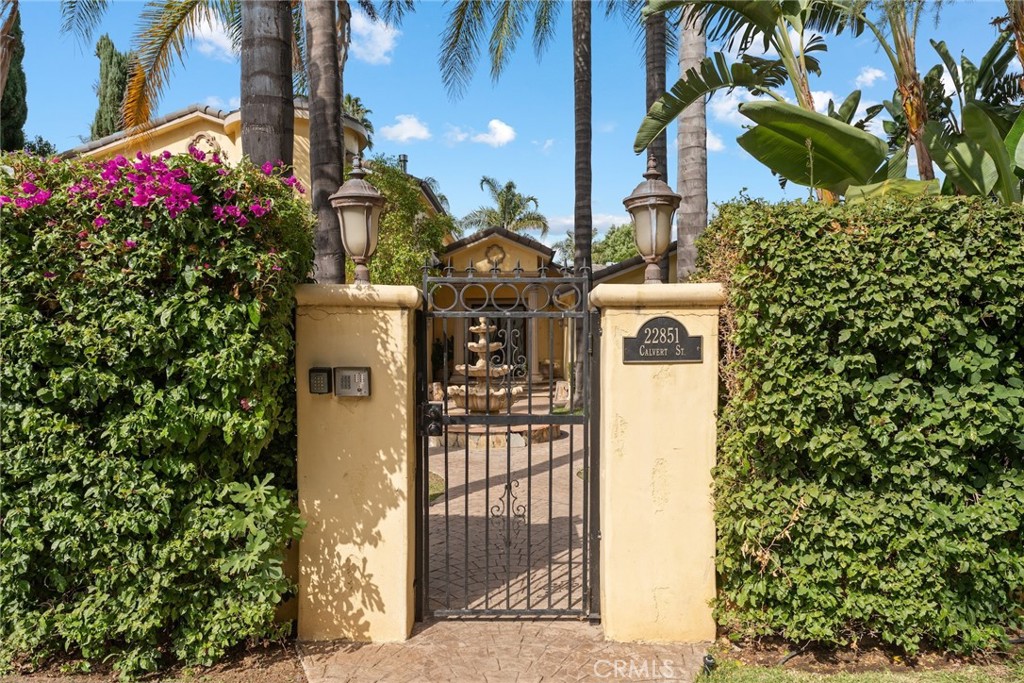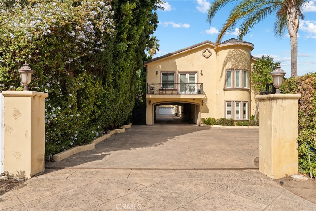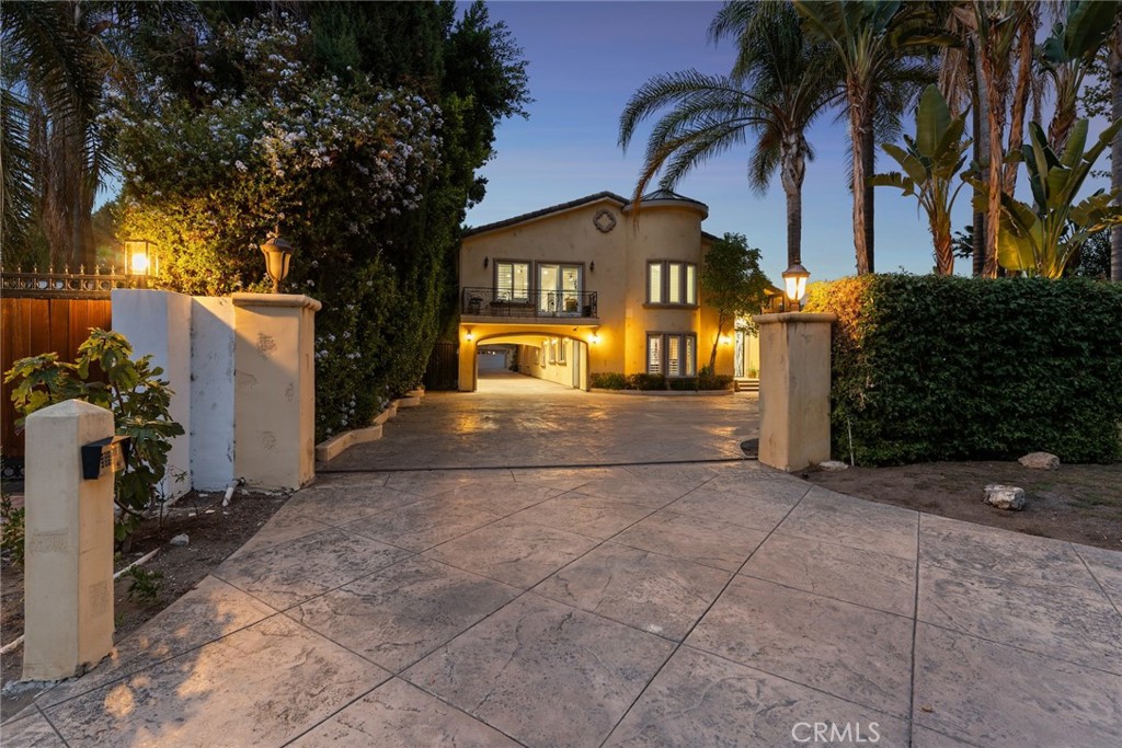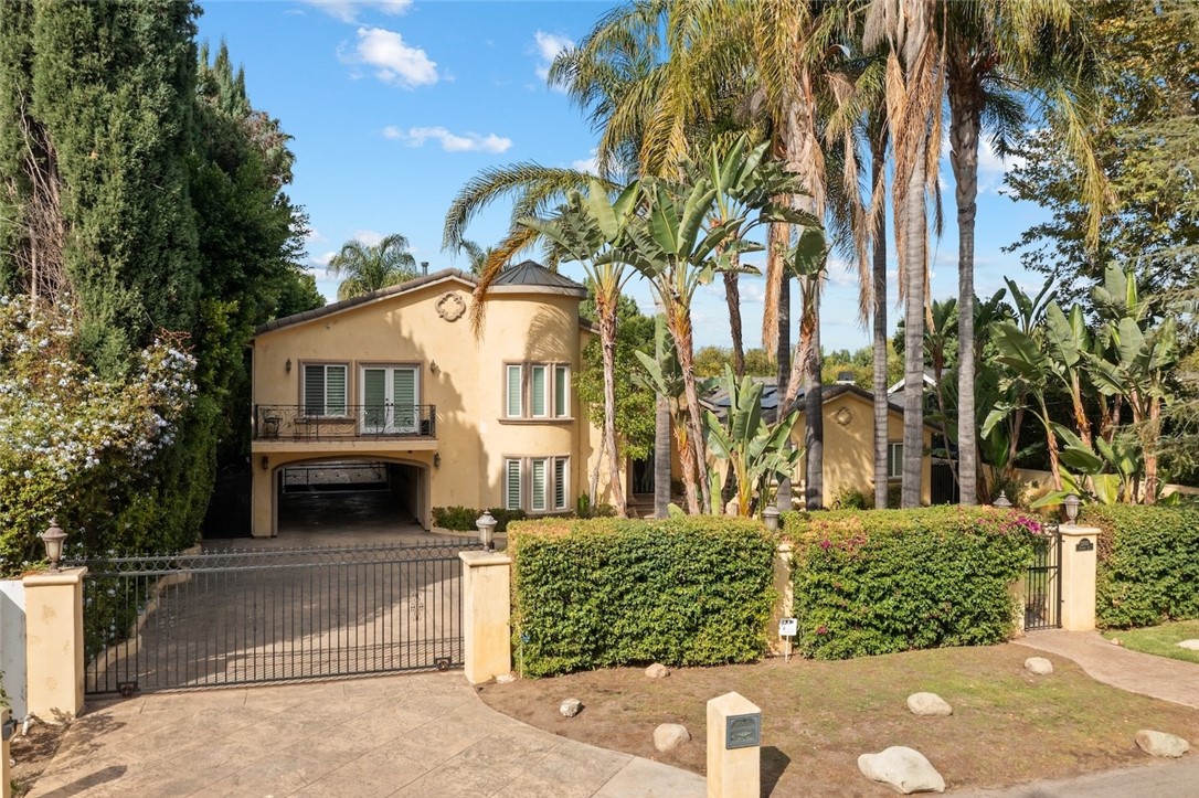 Custom gated Walnut Acres Italian Villa featuring a primarily one level main residence plus a detached oversized guest house situated on an expansive 26,000 SF flat lot. The private estate is secured behind an automatic security gate with separate pedestrian access and lush landscaping including full growth hedging and towering mature palms. The front yard features a sprawling driveway that can accommodate parking for large scale events and RVs/boats with a separate additional long gated driveway that leads to a covered carport and 2-car garage. Step inside to find a completely open concept floor plan with architectural design elements and designer finishes. A massive grand entry foyer with soaring ceiling and skylight basks the space with wonderful natural light. The foyer opens to a large great room with French doors that open to the backyard. Separate sitting and family rooms share a double-sided fireplace and wet bar. The vast chef’s kitchen is highlighted by a “sushi bar” inspired wraparound countertop peninsula and boasts Sub Zero 36” column fridge & freezer and Viking range with double ovens & 6-burner grill + griddle. The formal dining room has built-in storage cabinetry and French doors that open to the yard. A separate living room off the entry features fireplace, built-ins, and a second wet bar. The entire second level is dedicated to a luxurious primary suite featuring an enormous bedroom with sitting room/office, wet bar, fireplace, front & back balconies, large walk-in closet, storage room with laundry hookups, and spa-like bathroom with dual sinks, steam shower, spa tub, & toilet room. The home truly lives like a one story featuring 4 well appointed bedrooms downstairs including a first level primary suite with en-suite bathroom with walk-in shower and separate spa tub. First floor also has a guest powder bath and second laundry room. The entertainer’s backyard is a true oasis featuring beach entry pebble pool & spa, large covered patio with fire pit, separate outdoor kitchen with two BBQ grills, lighted sports court with two basketball hoops, and lushly landscaped grounds with lawns, fruit trees, & mature palms. The 1 bed, 1 bath guest house features living room with vaulted wood beamed ceiling and fireplace, full kitchen, and separate gym/bonus/game room. Total SF includes guest house. Paid off Solar panels! Adjacent to Westfield Mall/Village, Calabasas Commons, Warner Center & zoned for award-winning El Camino & Hale charter schools.