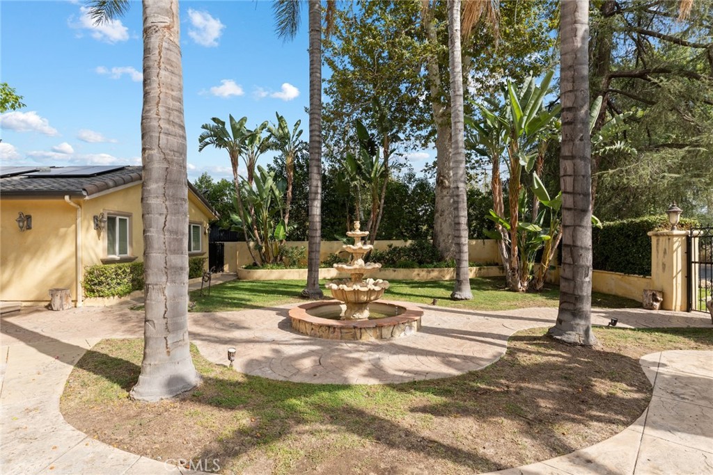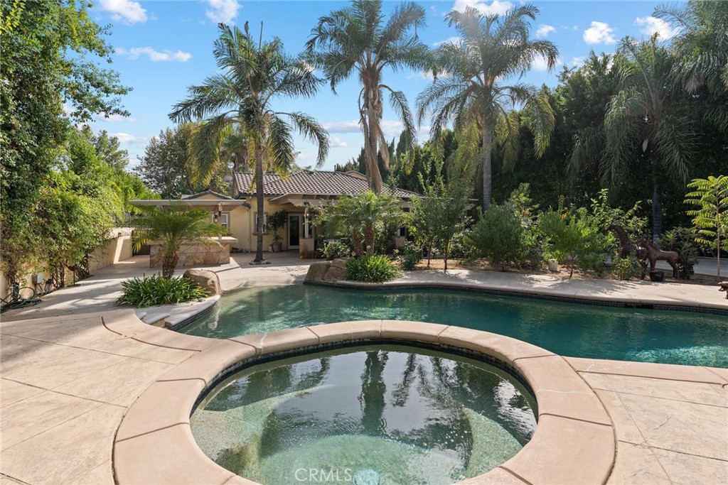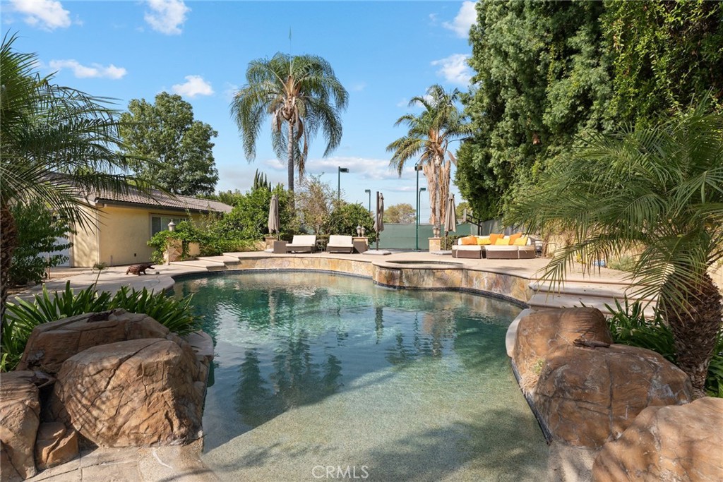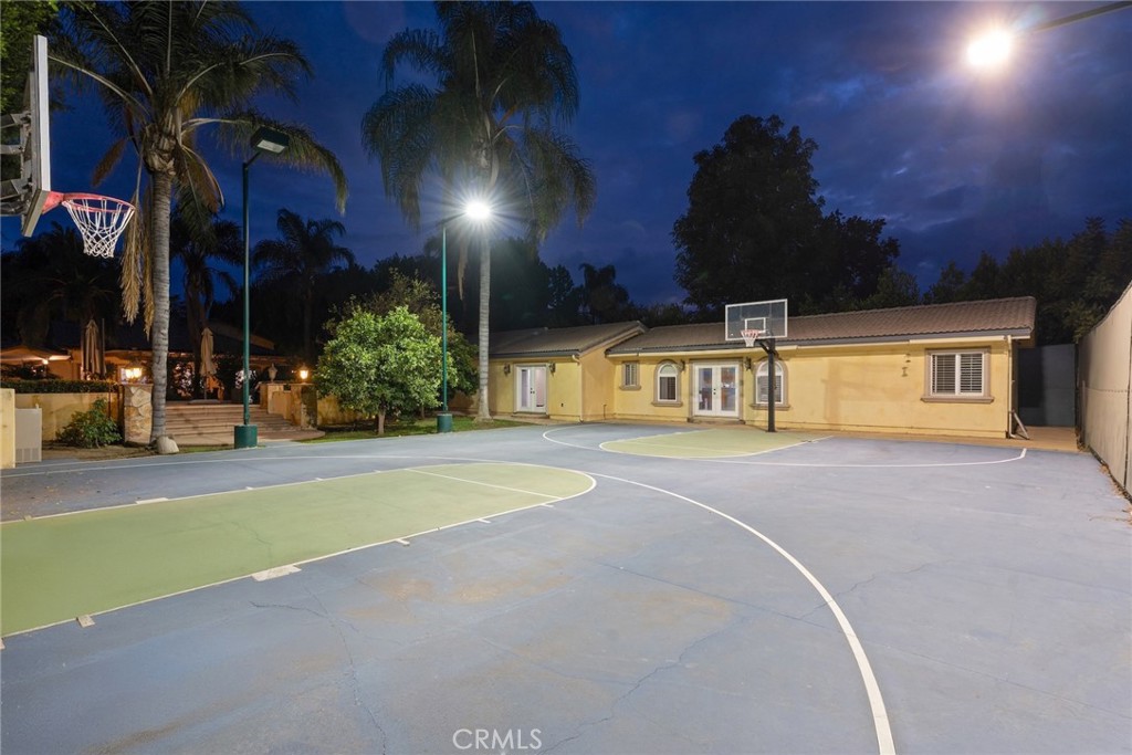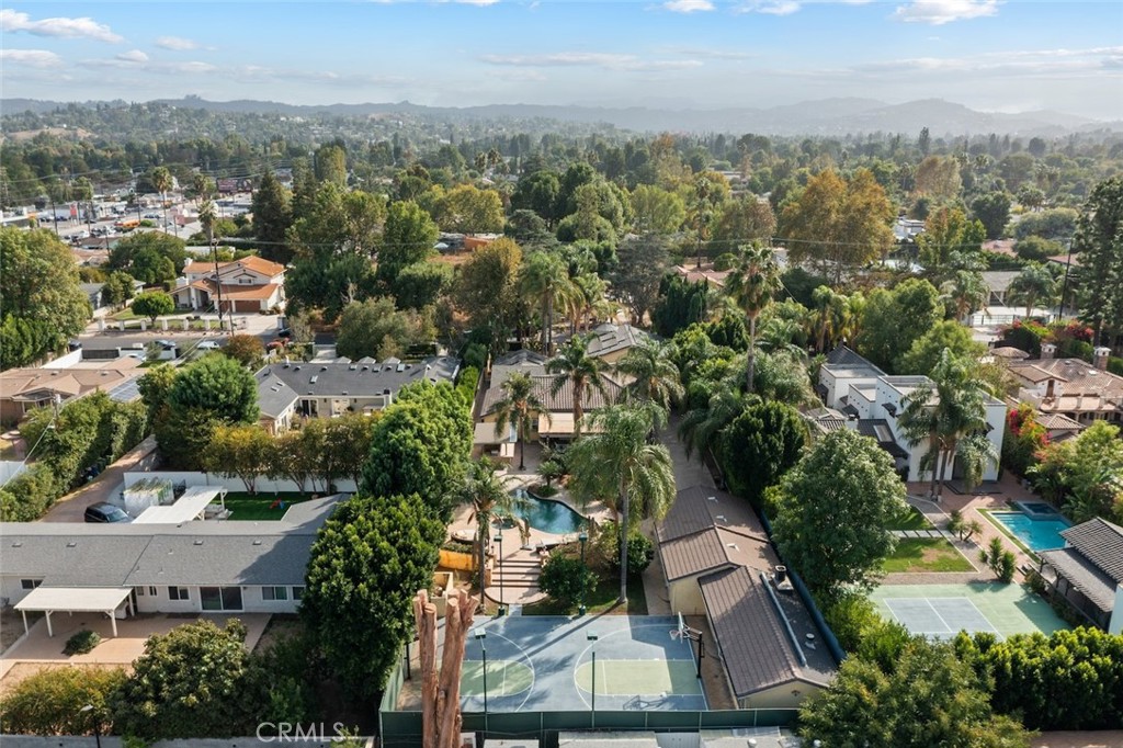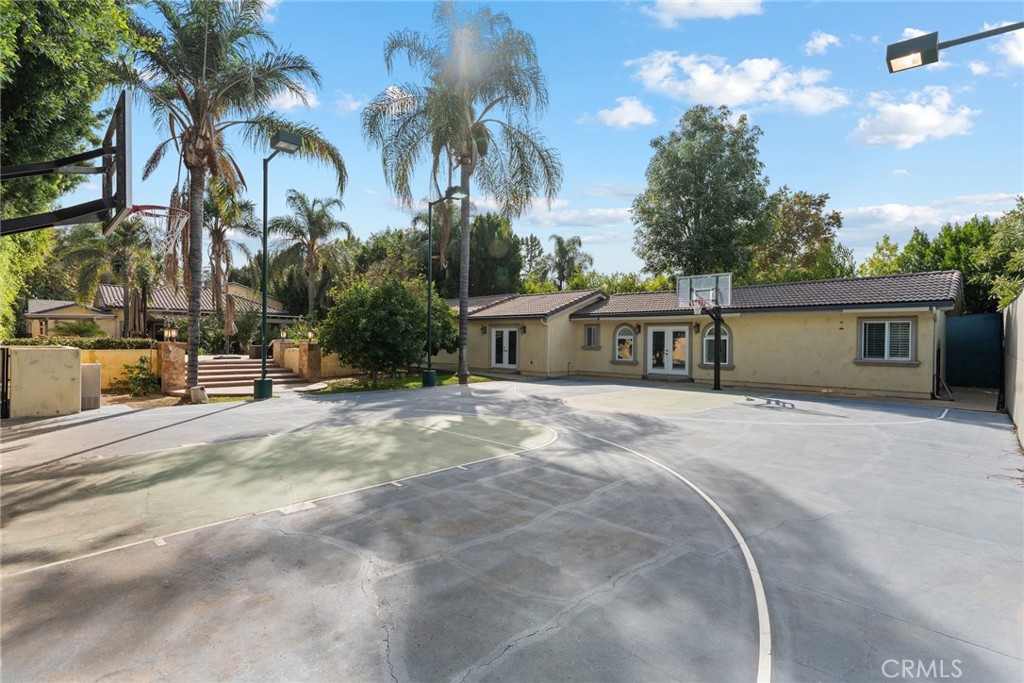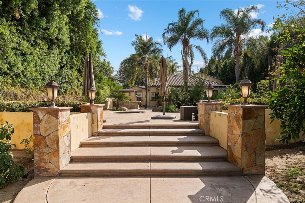 Custom gated Walnut Acres Italian Villa featuring a primarily one level main residence plus a detached oversized guest house situated on an expansive 26,000 SF flat lot. The private estate is secured behind an automatic security gate with separate pedestrian access and lush landscaping including full growth hedging and towering mature palms. The front yard features a sprawling driveway that can accommodate parking for large scale events and RVs/boats with a separate additional long gated driveway that leads to a covered carport and 2-car garage. Step inside to find a completely open concept floor plan with architectural design elements and designer finishes. A massive grand entry foyer with soaring ceiling and skylight basks the space with wonderful natural light. The foyer opens to a large great room with French doors that open to the backyard. Separate sitting and family rooms share a double-sided fireplace and wet bar. The vast chef’s kitchen is highlighted by a “sushi bar” inspired wraparound countertop peninsula and boasts Sub Zero 36” column fridge & freezer and Viking range with double ovens & 6-burner grill + griddle. The formal dining room has built-in storage cabinetry and French doors that open to the yard. A separate living room off the entry features fireplace, built-ins, and a second wet bar. The entire second level is dedicated to a luxurious primary suite featuring an enormous bedroom with sitting room/office, wet bar, fireplace, front & back balconies, large walk-in closet, storage room with laundry hookups, and spa-like bathroom with dual sinks, steam shower, spa tub, & toilet room. The home truly lives like a one story featuring 4 well appointed bedrooms downstairs including a first level primary suite with en-suite bathroom with walk-in shower and separate spa tub. First floor also has a guest powder bath and second laundry room. The entertainer’s backyard is a true oasis featuring beach entry pebble pool & spa, large covered patio with fire pit, separate outdoor kitchen with two BBQ grills, lighted sports court with two basketball hoops, and lushly landscaped grounds with lawns, fruit trees, & mature palms. The 1 bed, 1 bath guest house features living room with vaulted wood beamed ceiling and fireplace, full kitchen, and separate gym/bonus/game room. Total SF includes guest house. Paid off Solar panels! Adjacent to Westfield Mall/Village, Calabasas Commons, Warner Center & zoned for award-winning El Camino & Hale charter schools.