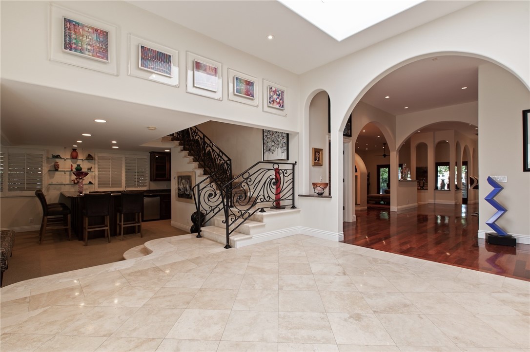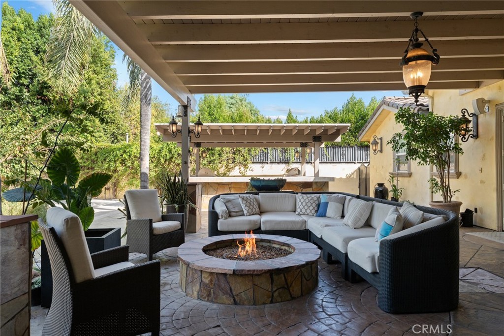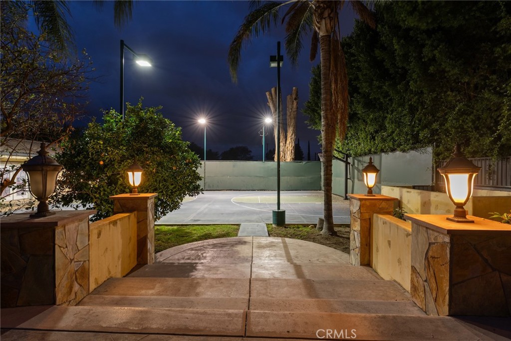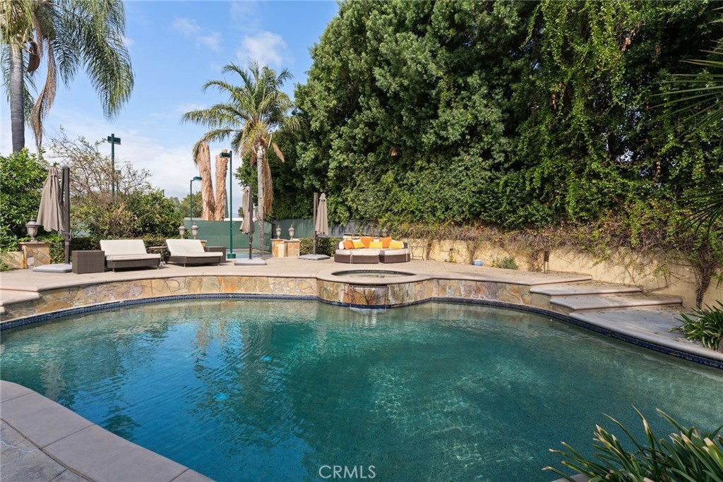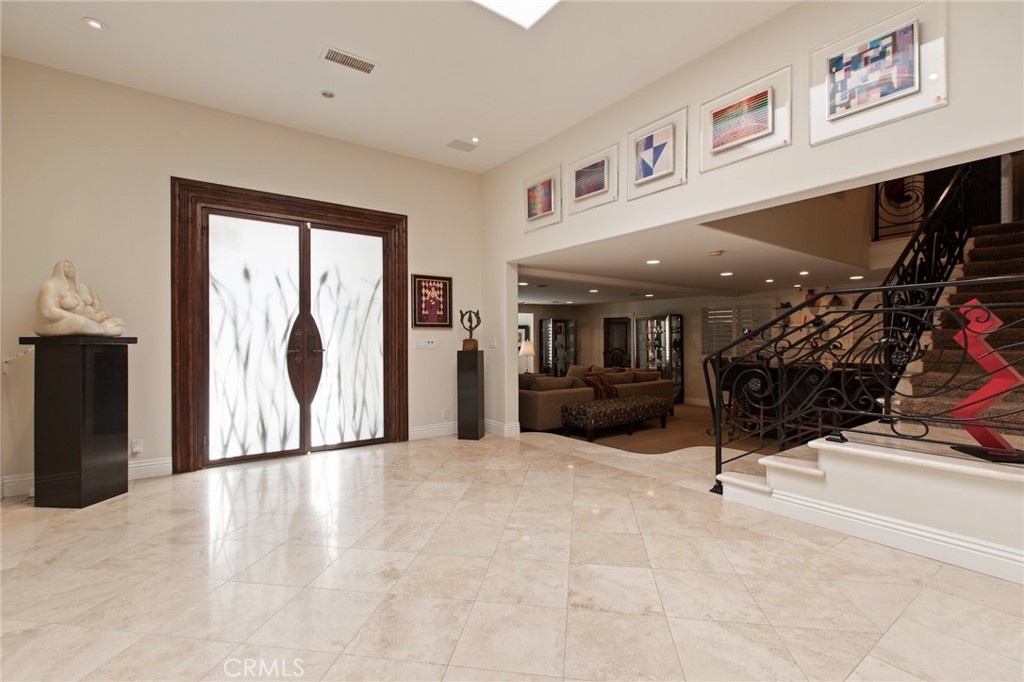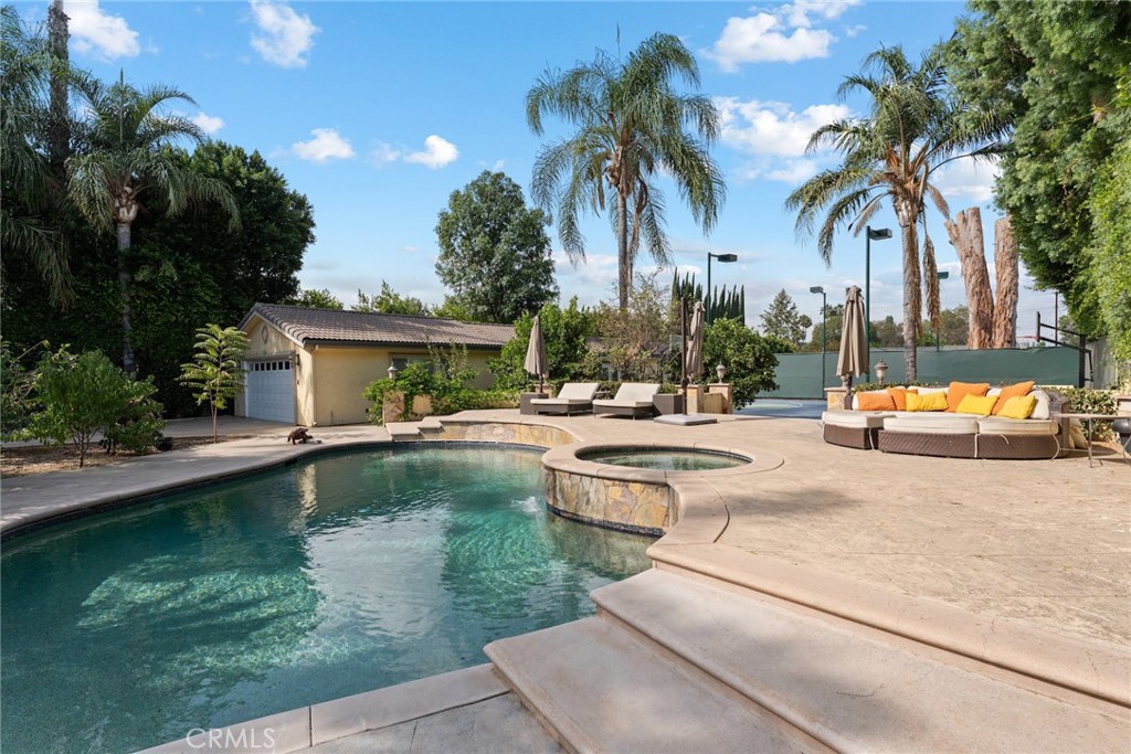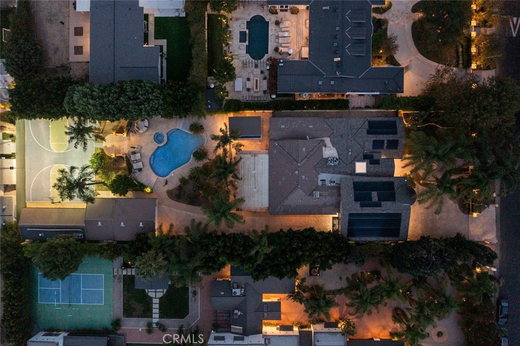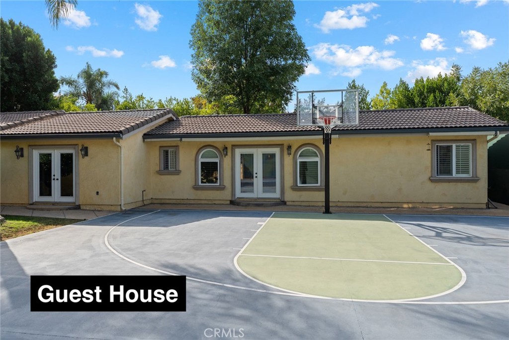 Custom gated Walnut Acres Italian Villa featuring a primarily one level main residence plus a detached oversized guest house situated on an expansive 26,000 SF flat lot. The private estate is secured behind an automatic security gate with separate pedestrian access and lush landscaping including full growth hedging and towering mature palms. The front yard features a sprawling driveway that can accommodate parking for large scale events and RVs/boats with a separate additional long gated driveway that leads to a covered carport and 2-car garage. Step inside to find a completely open concept floor plan with architectural design elements and designer finishes. A massive grand entry foyer with soaring ceiling and skylight basks the space with wonderful natural light. The foyer opens to a large great room with French doors that open to the backyard. Separate sitting and family rooms share a double-sided fireplace and wet bar. The vast chef’s kitchen is highlighted by a “sushi bar” inspired wraparound countertop peninsula and boasts Sub Zero 36” column fridge & freezer and Viking range with double ovens & 6-burner grill + griddle. The formal dining room has built-in storage cabinetry and French doors that open to the yard. A separate living room off the entry features fireplace, built-ins, and a second wet bar. The entire second level is dedicated to a luxurious primary suite featuring an enormous bedroom with sitting room/office, wet bar, fireplace, front & back balconies, large walk-in closet, storage room with laundry hookups, and spa-like bathroom with dual sinks, steam shower, spa tub, & toilet room. The home truly lives like a one story featuring 4 well appointed bedrooms downstairs including a first level primary suite with en-suite bathroom with walk-in shower and separate spa tub. First floor also has a guest powder bath and second laundry room. The entertainer’s backyard is a true oasis featuring beach entry pebble pool & spa, large covered patio with fire pit, separate outdoor kitchen with two BBQ grills, lighted sports court with two basketball hoops, and lushly landscaped grounds with lawns, fruit trees, & mature palms. The 1 bed, 1 bath guest house features living room with vaulted wood beamed ceiling and fireplace, full kitchen, and separate gym/bonus/game room. Total SF includes guest house. Paid off Solar panels! Adjacent to Westfield Mall/Village, Calabasas Commons, Warner Center & zoned for award-winning El Camino & Hale charter schools.