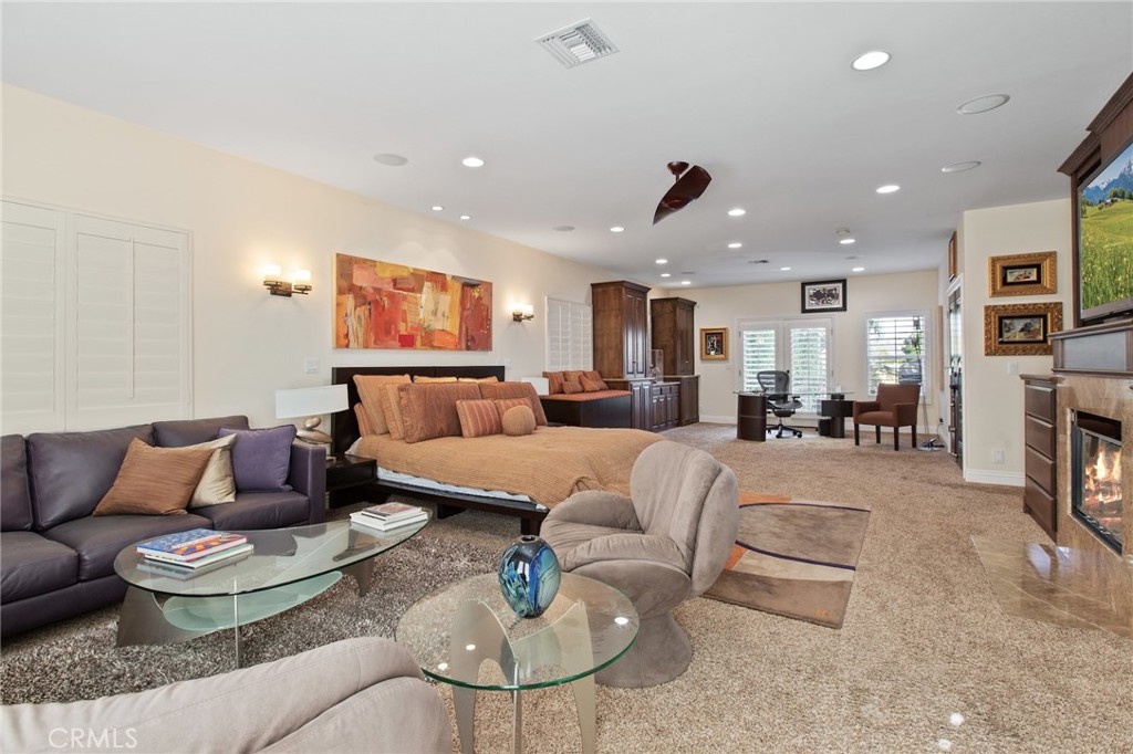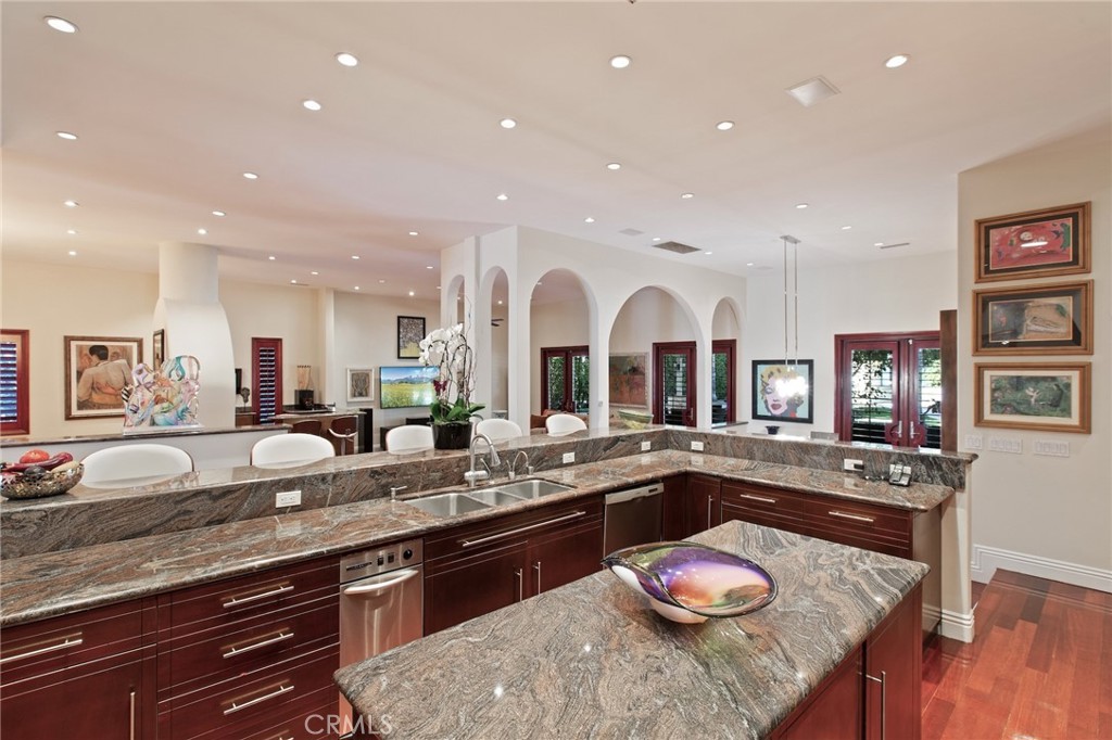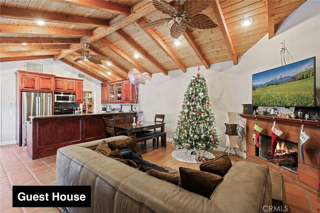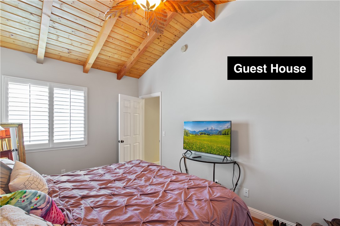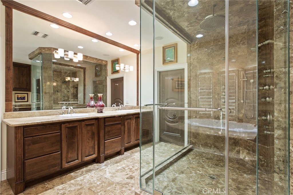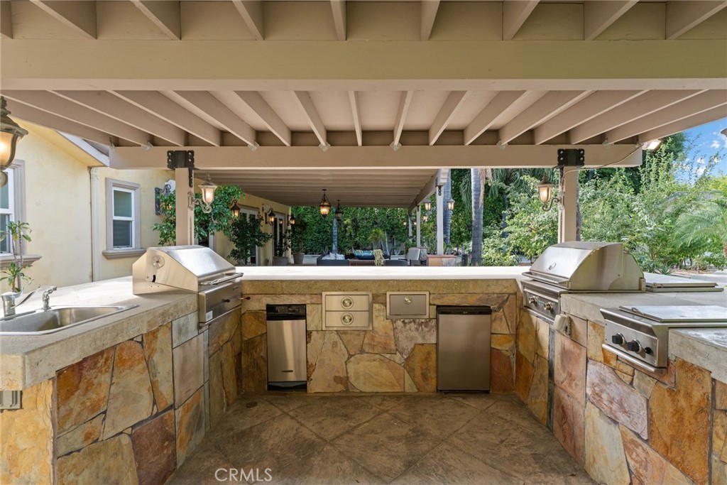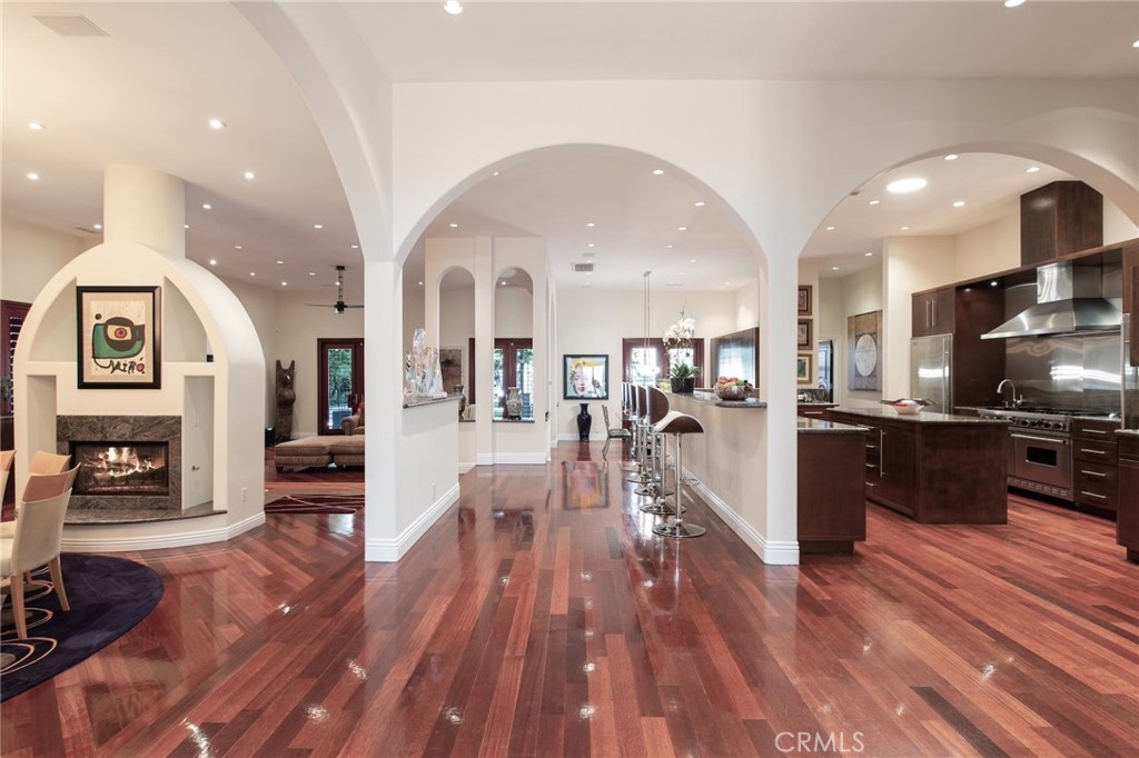 Custom gated Walnut Acres Italian Villa featuring a primarily one level main residence plus a detached oversized guest house situated on an expansive 26,000 SF flat lot. The private estate is secured behind an automatic security gate with separate pedestrian access and lush landscaping including full growth hedging and towering mature palms. The front yard features a sprawling driveway that can accommodate parking for large scale events and RVs/boats with a separate additional long gated driveway that leads to a covered carport and 2-car garage. Step inside to find a completely open concept floor plan with architectural design elements and designer finishes. A massive grand entry foyer with soaring ceiling and skylight basks the space with wonderful natural light. The foyer opens to a large great room with French doors that open to the backyard. Separate sitting and family rooms share a double-sided fireplace and wet bar. The vast chef’s kitchen is highlighted by a “sushi bar” inspired wraparound countertop peninsula and boasts Sub Zero 36” column fridge & freezer and Viking range with double ovens & 6-burner grill + griddle. The formal dining room has built-in storage cabinetry and French doors that open to the yard. A separate living room off the entry features fireplace, built-ins, and a second wet bar. The entire second level is dedicated to a luxurious primary suite featuring an enormous bedroom with sitting room/office, wet bar, fireplace, front & back balconies, large walk-in closet, storage room with laundry hookups, and spa-like bathroom with dual sinks, steam shower, spa tub, & toilet room. The home truly lives like a one story featuring 4 well appointed bedrooms downstairs including a first level primary suite with en-suite bathroom with walk-in shower and separate spa tub. First floor also has a guest powder bath and second laundry room. The entertainer’s backyard is a true oasis featuring beach entry pebble pool & spa, large covered patio with fire pit, separate outdoor kitchen with two BBQ grills, lighted sports court with two basketball hoops, and lushly landscaped grounds with lawns, fruit trees, & mature palms. The 1 bed, 1 bath guest house features living room with vaulted wood beamed ceiling and fireplace, full kitchen, and separate gym/bonus/game room. Total SF includes guest house. Paid off Solar panels! Adjacent to Westfield Mall/Village, Calabasas Commons, Warner Center & zoned for award-winning El Camino & Hale charter schools.