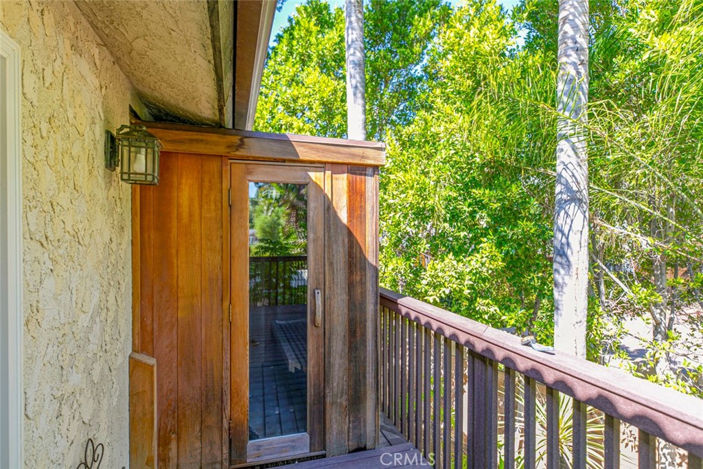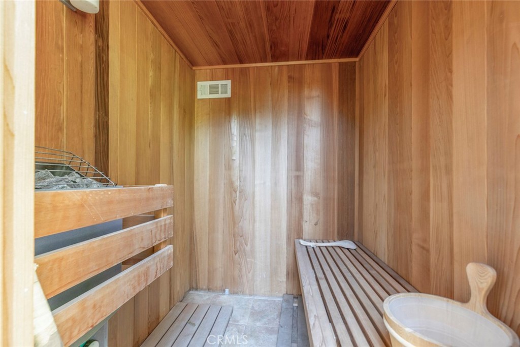 The house is (2925 sq. ft.) Upstairs, find four bedrooms and two bathrooms, including a primary suite with soaring ceilings, balcony, and a spa-like bath with sauna.