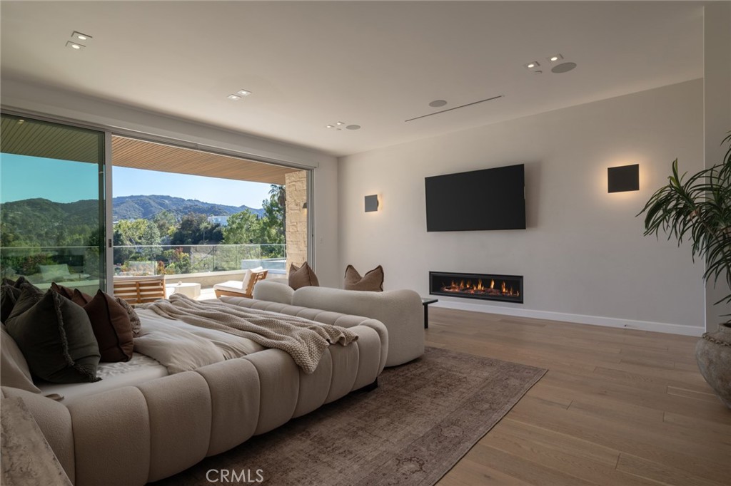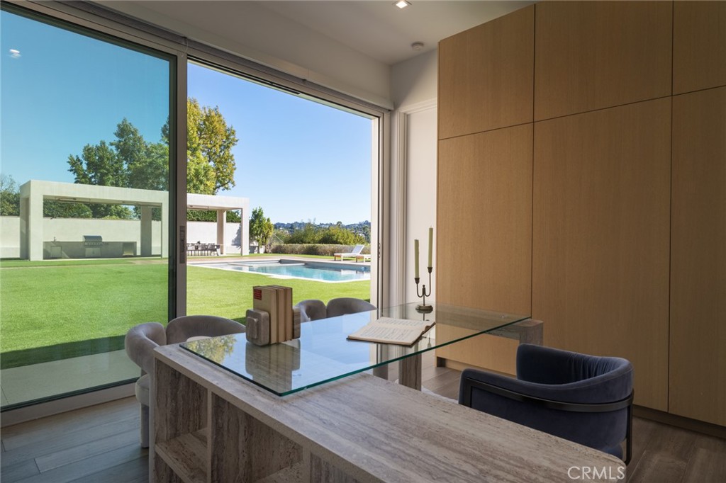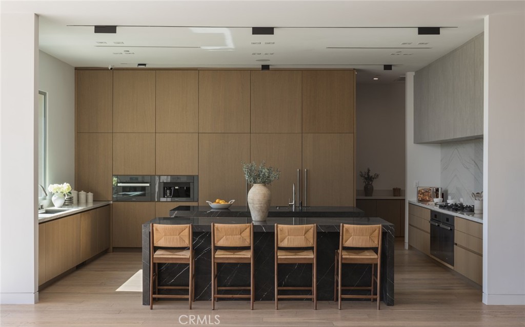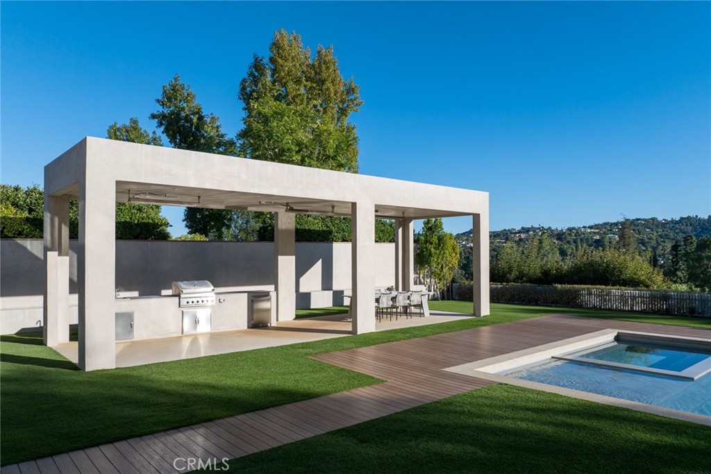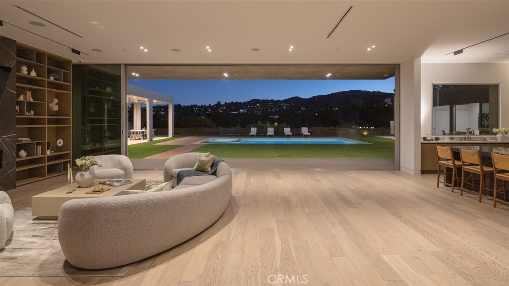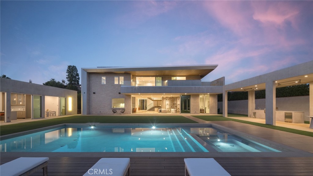 Perched in the coveted Encino Hills, this newly built architectural gem, designed by Dorothy Macik and architect Eran Gispan, blends modern design with organic serenity, framed by sweeping panoramic views. A grand pivoting glass door welcomes you into a world of refined luxury, where wide-plank white oak floors flow seamlessly, complemented by bespoke gray-smoke cabinetry. The gourmet kitchen is a masterpiece, featuring Quartzite countertops, honed marble finishes, Watermark fixtures, and custom cabinetry. Designed for effortless entertaining, the open-concept living spaces are anchored by a dramatic dual-sided fireplace, flanked by hand-forged steel shelving with smoke-tinted mirrors. Velvet wallpaper adds tactile luxury, while Fleetwood sliding doors dissolve indoor-outdoor boundaries. Ascend the floating staircase to four lavish en-suite bedrooms, each a private sanctuary. The primary suite offers a patio balcony with breathtaking views, a cozy fireplace, and a spa-inspired bath clad in travertine stone, complete with dual vanities, a soaking tub, and a glass-enclosed shower. A cinema-worthy movie theater ensures an immersive entertainment experience. The backyard epitomizes California living with a sparkling pool and spa, outdoor BBQ kitchen, and sports court, all set against the stunning unobstructed view of a hillside backdrop. A versatile ADU includes a gym and a bedroom—ideal for guests or extended stays. Additional highlights include a powder room with a handmade stone sink, modern drywall detailing, and Allied Maker light fixtures. Fully equipped with an automated smart home system and state-of-the-art sound, this estate offers unparalleled convenience and ambiance. Moments from Ventura Blvd, it’s a rare fusion of luxury, tranquility, and urban accessibility.