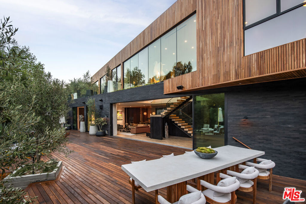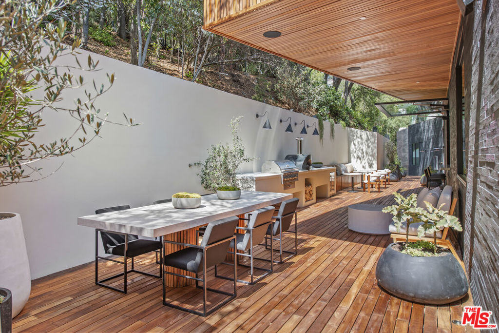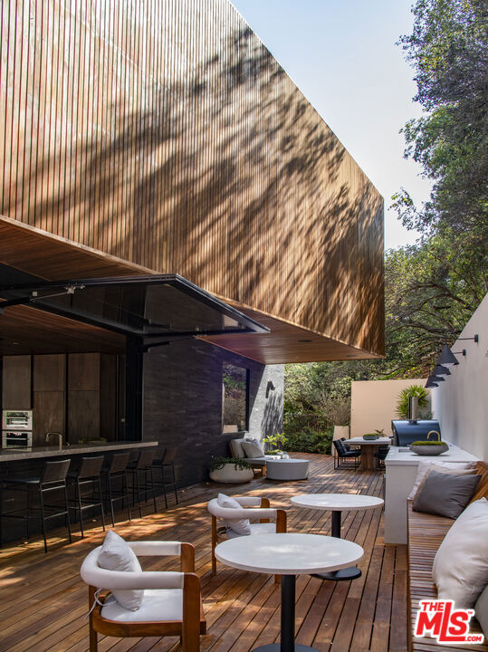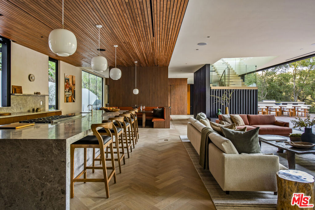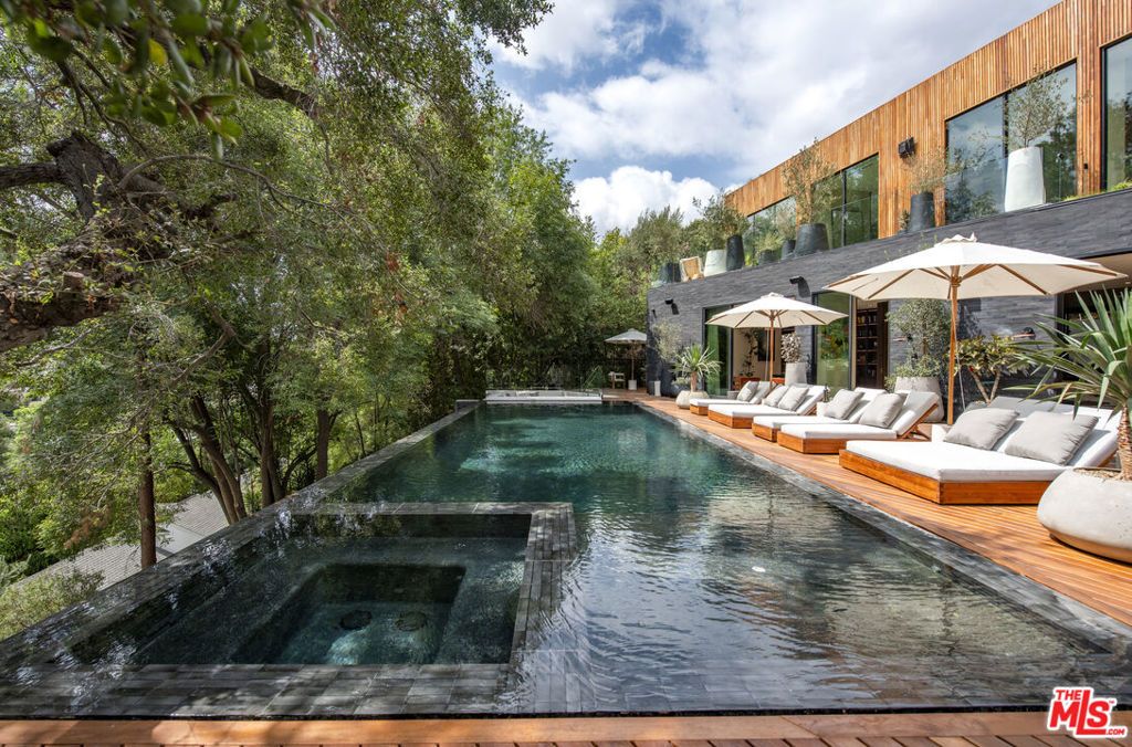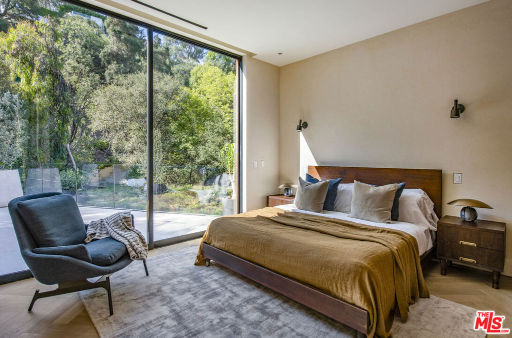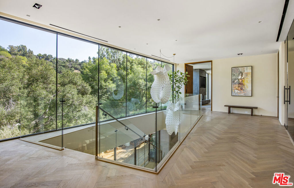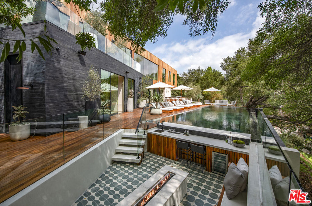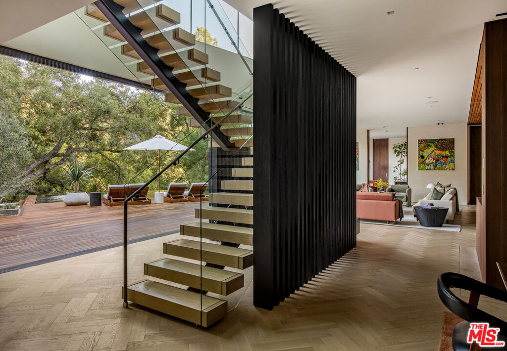 Welcome to a triumph of design and detail; a sanctuary of transitional Scandinavian modern design in the prestigious Beverly Hills neighborhood. This six-bed, nine and a half bath new construction home, with interior design by Abramson Architects, blends unparalleled craftsmanship with contemporary elegance and timeless sophistication. Nestled amidst majestic oak trees and serene canyon views, the estate invites you to immerse yourself in the ultimate luxury living experience.This architectural masterpiece is perched on a gated estate spanning almost an acre. Every detail has been thoughtfully curated, showcasing ultra-high-end materials, and organic bespoke finishes, resulting in a vacation-villa ambiance. The striking exterior, adorned with warm teak wood siding and black basalt stone, is both inviting and architecturally stunning, while mature hedges ensure maximum privacy.Inside, 10+ foot ceilings and expansive Fleetwood pocket doors create a seamless indoor-outdoor flow, flooding the main living spaces with natural light, and a sense of effortless grandeur. A chef's dream, the large professional kitchen features a striking 15-foot custom stone island, top-of-the-line Miele appliances, a charming breakfast nook, and a large automated pop-up window that transforms the space for effortless al fresco entertaining. Transitioning upstairs, the substantial primary suite impresses with a serene ambiance, complete with dual custom closets, a striking plastered floating fireplace, a secluded deck overlooking verdant canyon vistas, and a spa-like bathroom featuring a steam rain shower and a custom birchwood sauna. An expansive 50+ foot skylight floods the upper level with natural light, where four bedrooms extend to private outdoor decks, further enhancing the home's connection to nature. The piece de resistance is the floating staircase, complimented by a one-of-a-kind chandelier art piece that hangs; a true showpiece. The backyard is a seamless extension of the home's main living spaces, and are equally captivating with a zero-edge infinity pool and spa with swim-up bar, multiple fire pit lounges, pergolas, and fully equipped outdoor kitchensperfect for entertaining or peaceful relaxation. The lower level is a haven for recreation and entertainment, and is thoughtfully and artistically curated highlighting a pickleball court with stadium-like seating, pergola, grassy knoll with lush landscaping and hand-made fountains, all framed by the breathtaking beauty of the surrounding nature.Additional amenities include a secondary chef's kitchen, tiered private theatre, state-of-the-art home gym, office with custom cabinetry, temperature-controlled wine storage, showcase 3-car garage, parking up to 10 cars, two well-appointed laundry rooms, and Savant-powered smart home technology for modern convenience. The home is accompanied by custom-made indoor and outdoor furniture specifically deigned to fit within the Mid-Century Scandinavian design.The Hutton House is a private oasis of luxury and serenity where thoughtful design meets understated elegance. Every element reflects a commitment to quality and comfort, offering every conceivable amenity to those who demand nothing less than perfection. A rare opportunity to own a truly exceptional home in one of the world's most coveted locations.