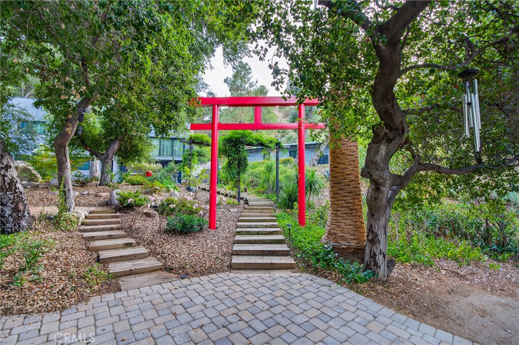 At the center is a Japanese garden by designer Tomoyuki Nakamura, featuring a 12-foot Torii gate, picnic area, and rare imported glass greenhouse. Artistic details include custom faux bois by Terence Eagon, stone hardscaping, and a fully irrigated hillside.