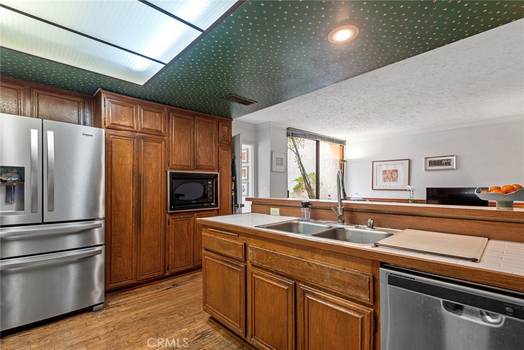 Fantastic Opportunity to own one of the largest Townhouse in Encino, over 2,400 Sqft is as big as a house. Unique end corner unit located in cul-de-sac with inside gated courtyard entry, quiet inner location with large front patio and second level balcony off master suite w/views. Light and bright open floorplan with high ceiling, fireplace, large dining room & bar. The kitchen open up to a cozy family room that features sliders to a private large atrium. The atrium allows an abundance of natural light into the Living, Dining and Den. Upstairs is comprised of 3 well sized bedrooms and 2 full baths plus laundry room. The Master suite has sliders to a rooftop deck with Mountain views, a spacious walk-in closet, updated dual sink vanity and separate soaking tub & shower. The community features a heated pool and spa, secured entry and gated side by side parking spaces. All this while being close to freeway access, convenient shopping, Trader Joe's, Gelson's, Sepulveda Dam recreation area and much more.