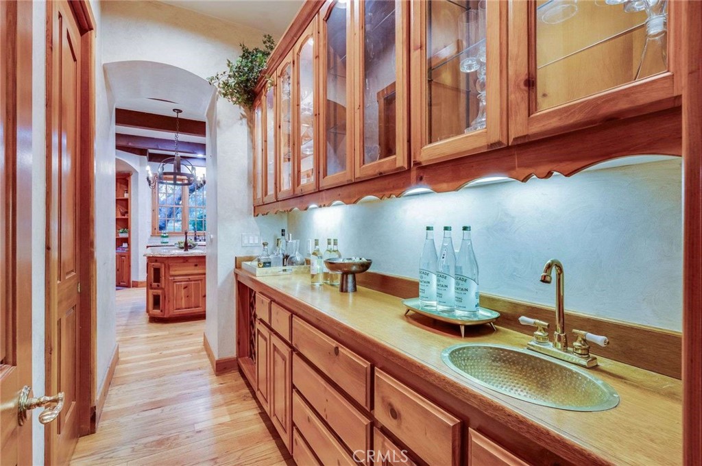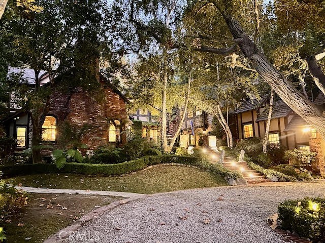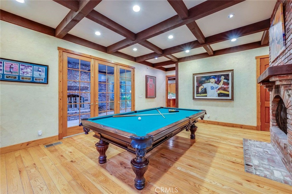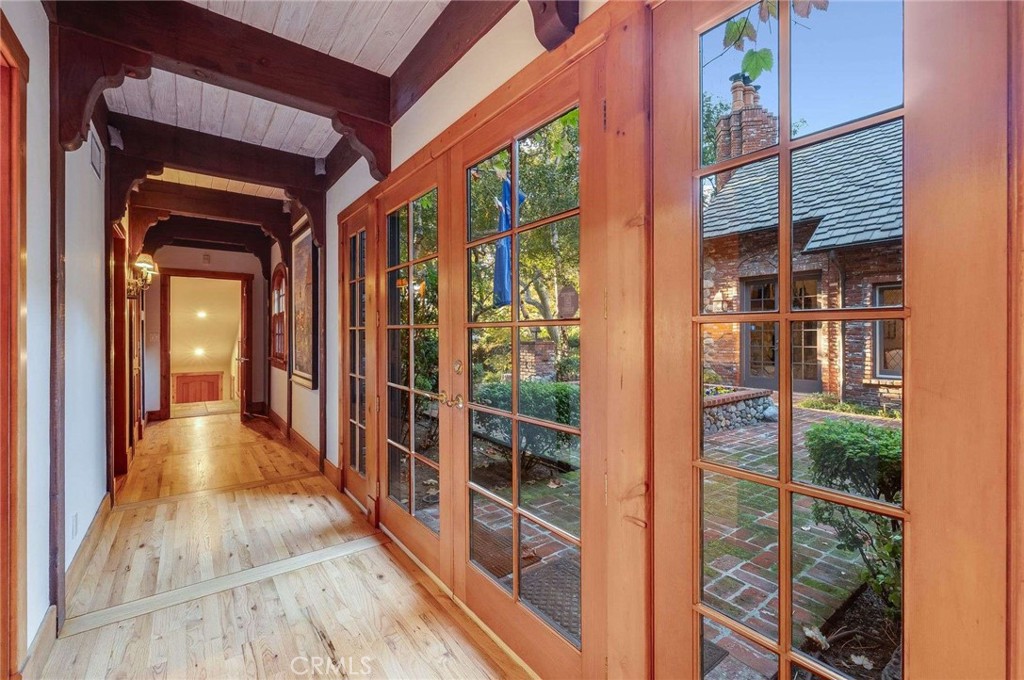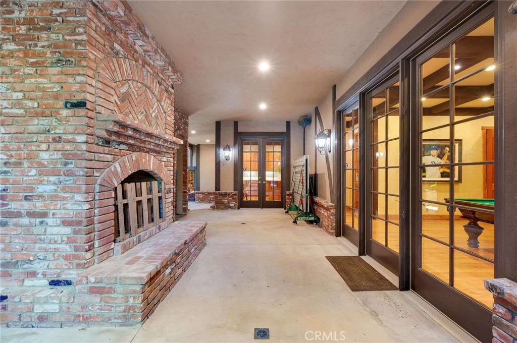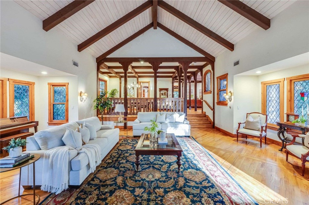 Nestled behind private gates on approximately two acres of beautifully manicured, park-like grounds, this stunning English Tudor estate offers 7,516 sq ft of timeless craftsmanship and refined elegance. From its classic timber-beamed and brick exterior, to its intricate interior woodwork, open vaulted ceilings with exposed wood beams, and stained and beveled glass windows, every detail reflects the character and grace of a bygone era—perfectly blended with modern luxury. A grand formal entry welcomes you into a two-story foyer that opens to an expansive floor plan featuring a step-down living room with a dramatic floor-to-ceiling stone fireplace, a large formal dining room, and multiple gathering spaces ideal for entertaining. The gourmet kitchen is complemented by granite countertops with custom cabinets, island with prep sink, a butler’s pantry with wet bar, walk-in pantry, and premium appliances including Sub-Zero, Thermador, and KitchenAid. Unique spaces such as a charming potting room, large craft room, upstairs bonus/play room, separate office/library, and a game room with pool table add character and versatility. There is truly plenty of space for everyone!