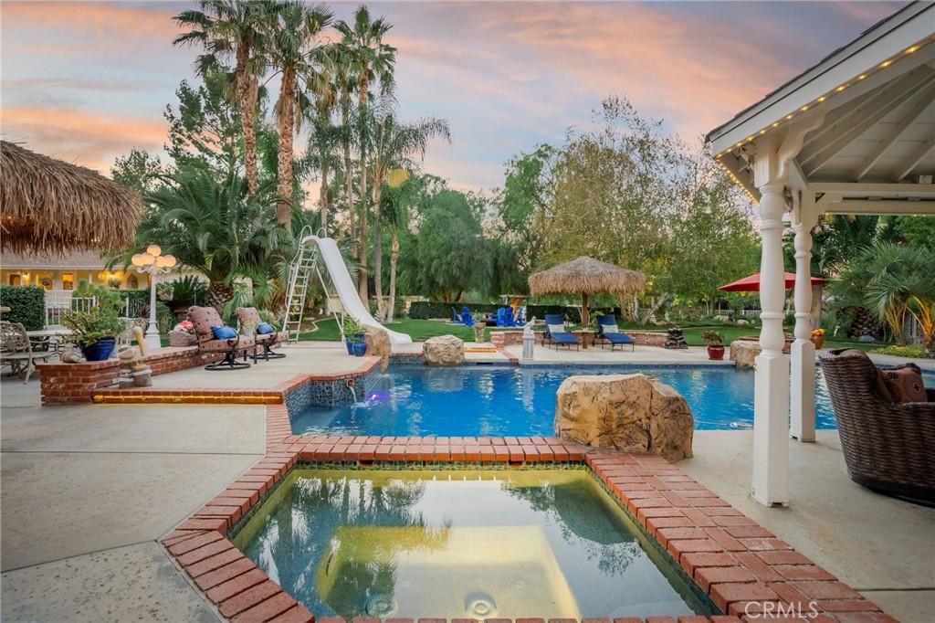 Tucked away on 3.8 completely flat, usable acres, this private Sand Canyon estate is unlike anything you’ve seen before. The main home spans nearly 3,200 sq ft with 4 bedrooms, 3 bathrooms, and 5-car garages—all designed to live like a single story. Every inch has been beautifully updated and meticulously maintained, with an upstairs retreat featuring a full bar, office, and an 800-bottle wine cellar. Built for entertaining, the home includes indoor/outdoor speakers and opens to a Tommy Bahama–inspired resort backyard—a true showstopper with a massive rock waterfall, fire features, 11-foot slide, sparkling pool, fire pit, gazebo, and outdoor kitchen surrounded by lush, tropical landscaping. In addition to the main residence, the property features THREE FULLY PERMITTED GUEST HOUSES.