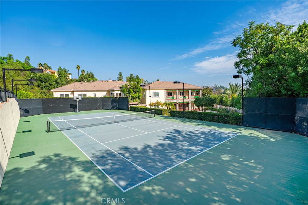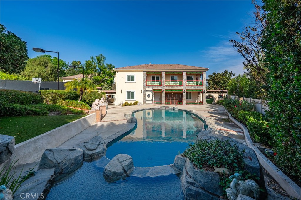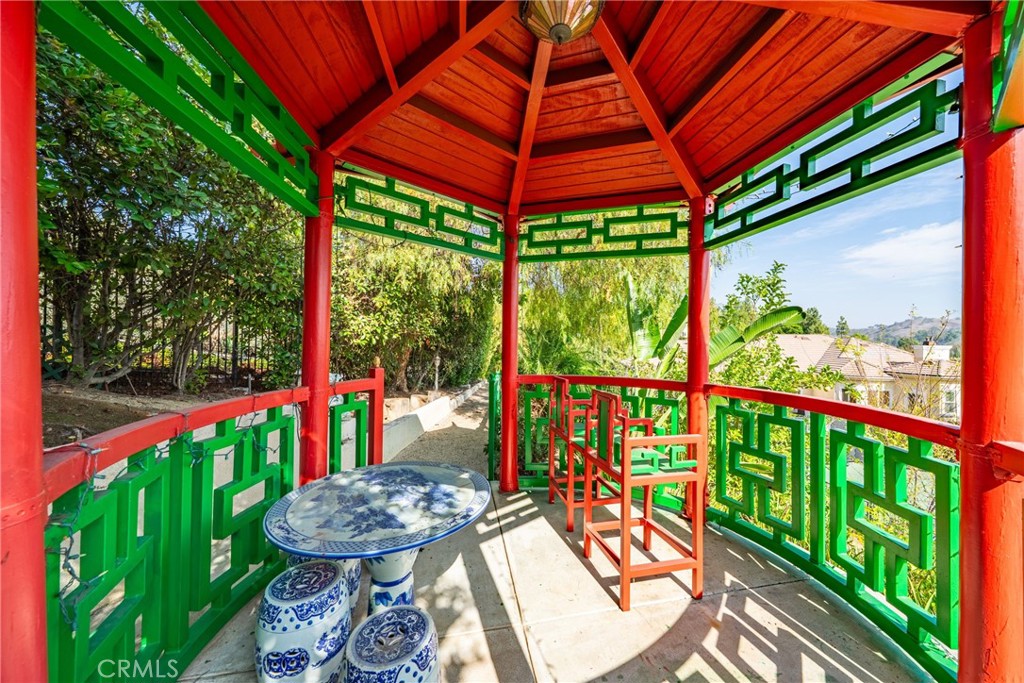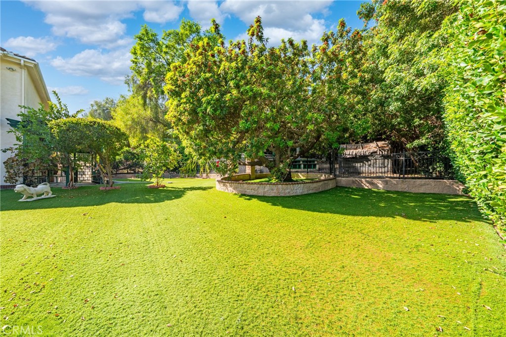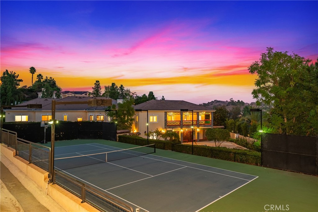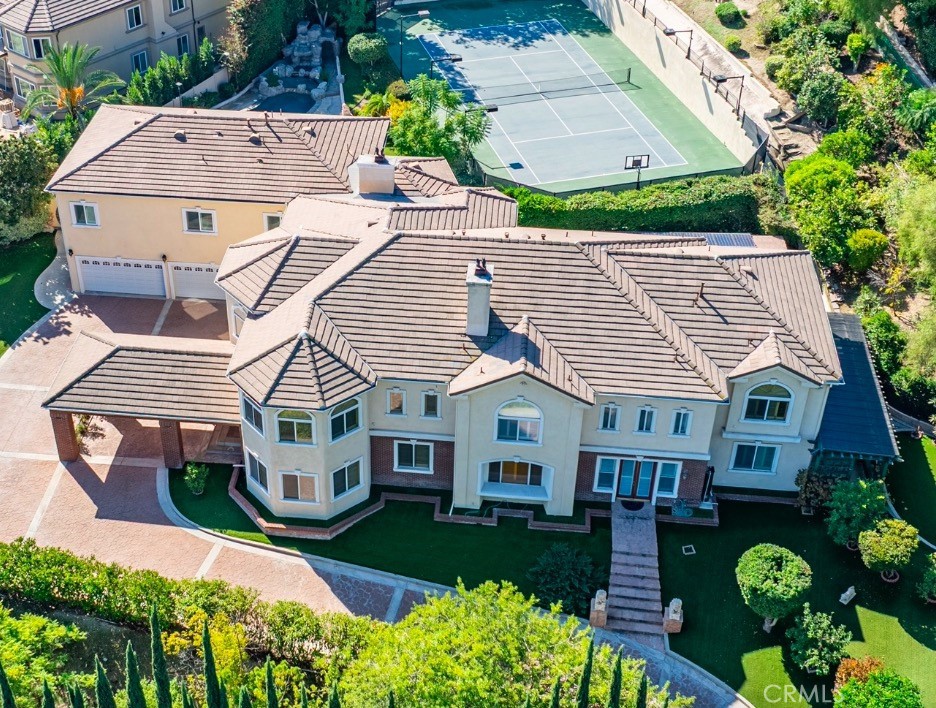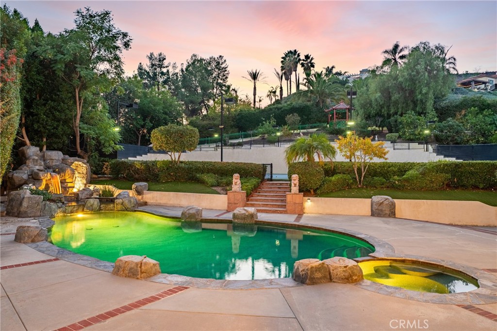 The resort-style backyard is a true sanctuary—complete with a sparkling pool and spa, waterfall feature, full-size tennis court with lighted, outdoor BBQ pavilion, gazebo, and a tranquil Chinese-style garden surrounded by fruit trees and lush landscaping.