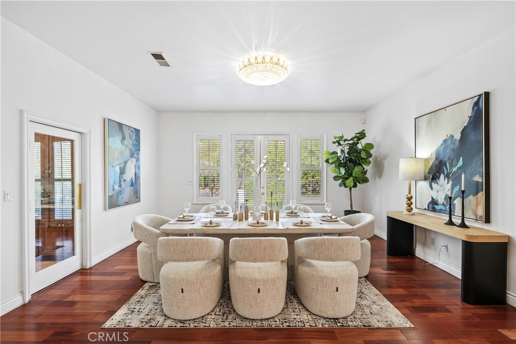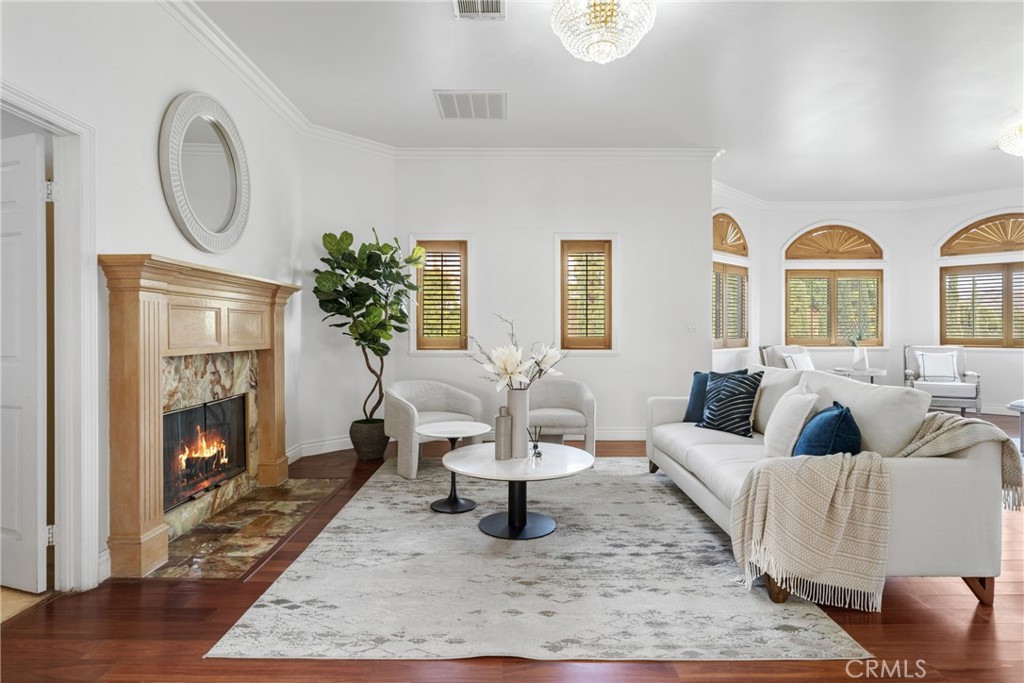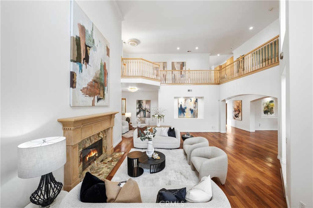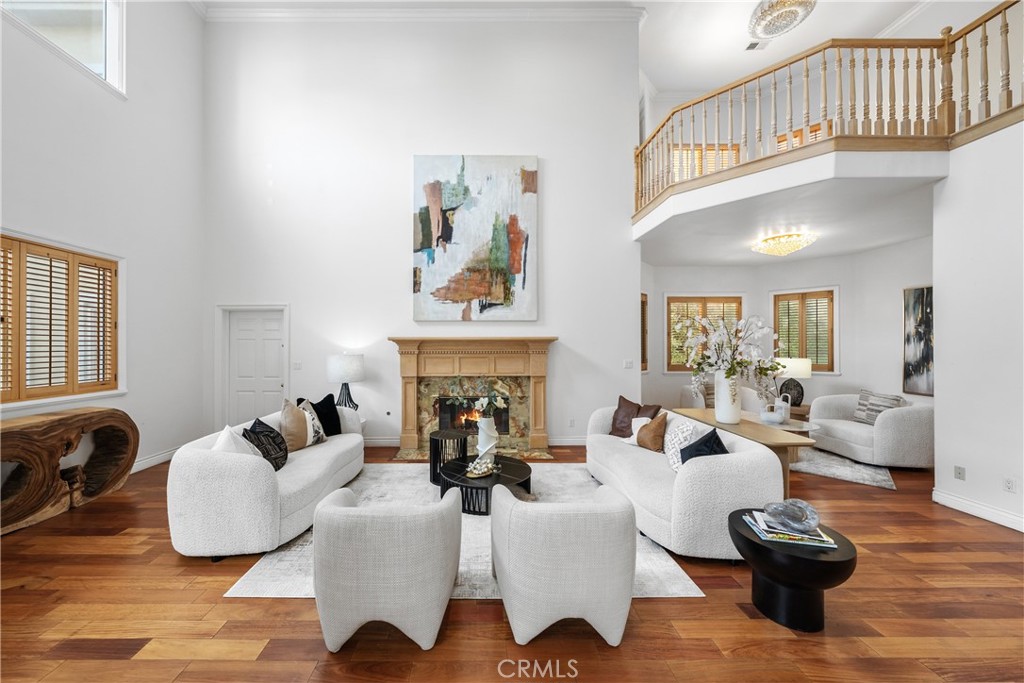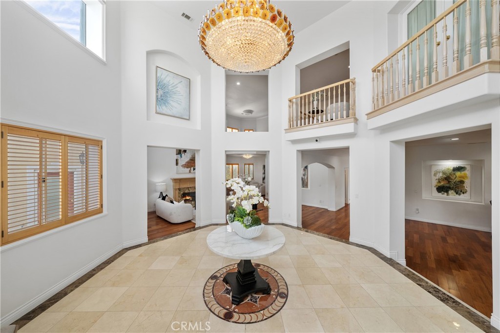Grand Interiors. Step through the double doors into an impressive foyer crowned with a dazzling crystal chandelier and soaring ceilings that immediately evoke a sense of grandeur. The formal living room exudes warmth and elegance with its cathedral ceiling and fireplace, while the formal dining room provides an exquisite setting for hosting lavish gatherings.