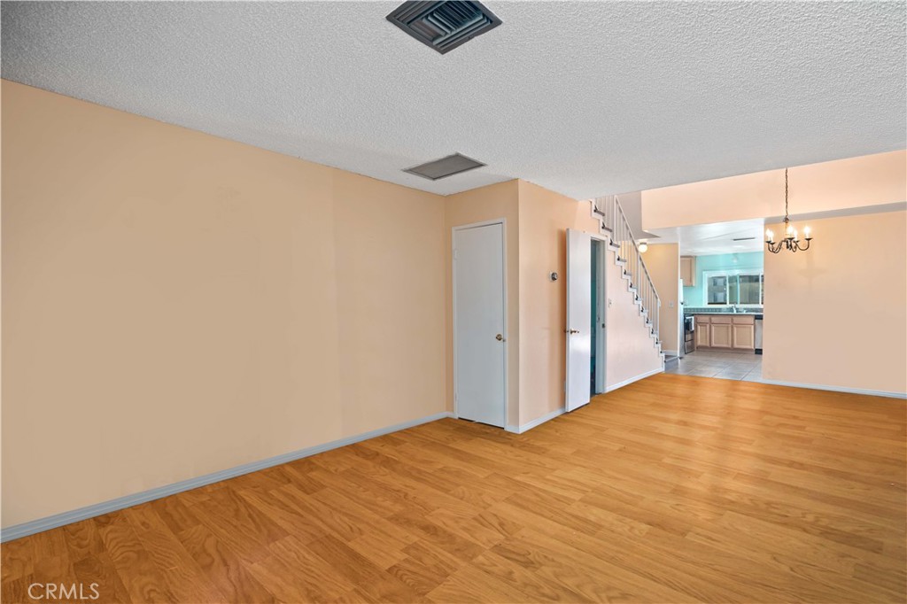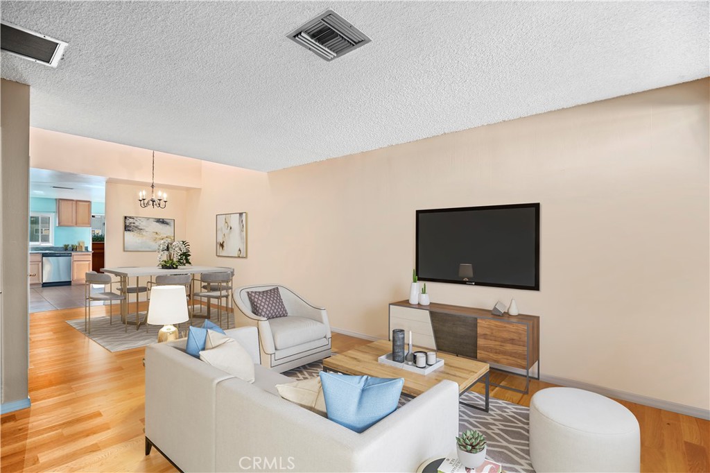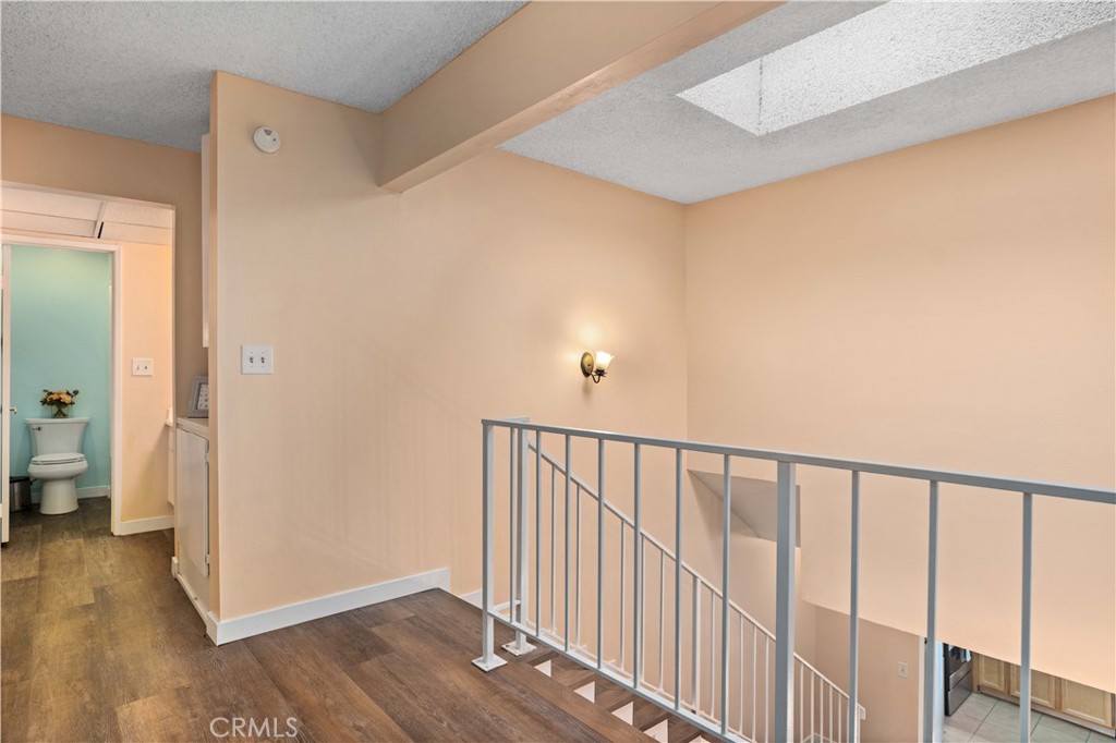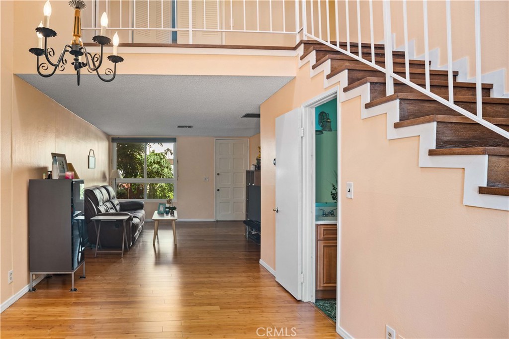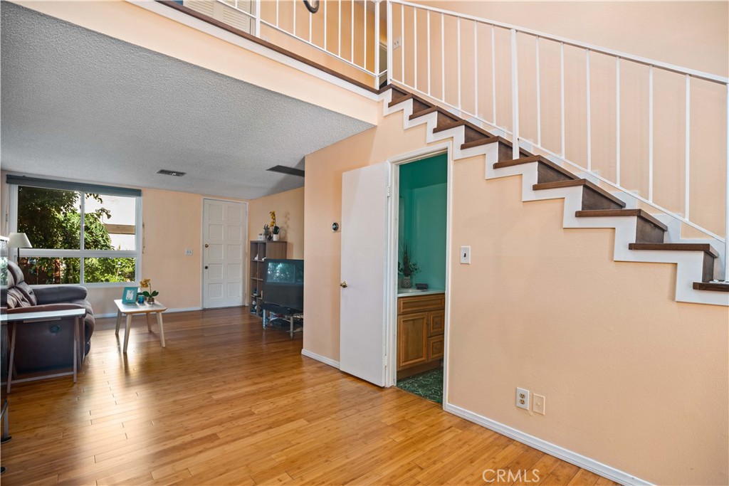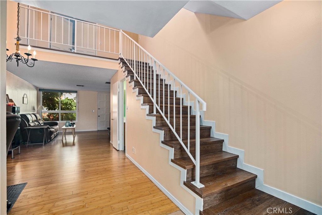 Great location! Perfect starter home! In front of the home you have your own garden area to plant seasonal flowers and a tree that brings shade to the front of the home. Through the front door this home has an open floor plan with beautiful bamboo wood floors as you enter that extend from the living room to the dining room area, a quaint half bathroom downstairs for your guests, spacious kitchen with granite counter tops, tile floors and room for a kitchen table or maybe a kitchen island for extra counter space. Just through the kitchen is a balcony area to enjoy a cup of coffee or just relax. Upstairs their is a small loft and closet for extra storage, the 1st bedroom has French doors and dual closets, 2nd bedroom is slightly larger with sliding closet doors and a vaulted beam ceiling which gives the room a cozy space to create your retreat. The hallway has linen cabinets, a shared bathroom area with sink, more storage space, and a shower/tub with an upstairs commode. The home has been updated with a new HVAC system and energy efficient windows to keep the temperature in the home comfortable during the hot or cooler days. Close to schools, shopping centers, restaurants, and close freeway access. A must see.