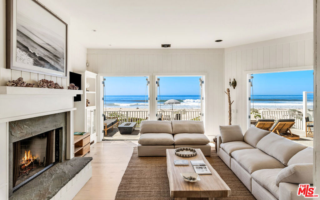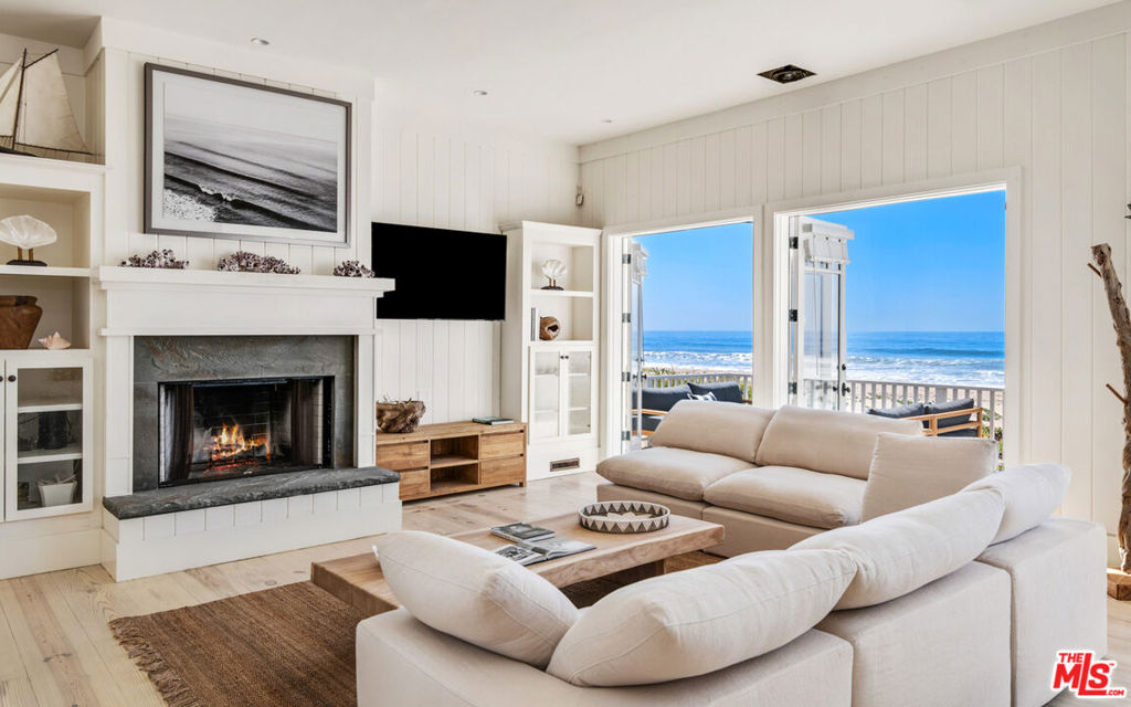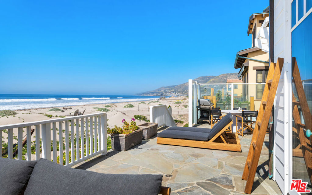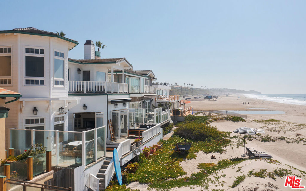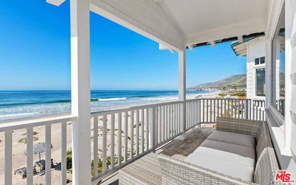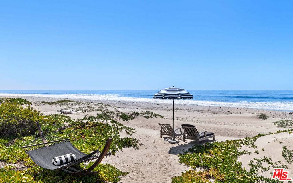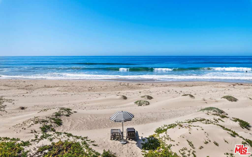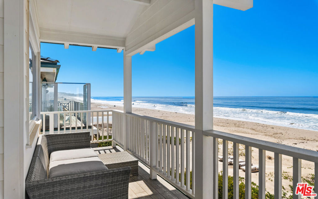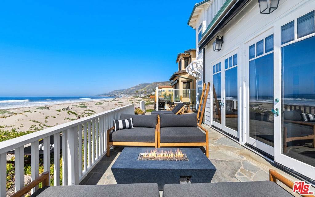 Malibu coastline and Cape Code-style combine for easy living on wide, flat Trancas Beach, with ocean views, sandy shoreline, and plenty of room for indoor-outdoor living and entertaining. A gated entry opens to a fountain breezeway and a spacious private courtyard complete with a flagstone fireplace, lounge seating, and a covered Jacuzzi with a waterfall. Freshly updated inside and out, the home has a two-bedroom, one-bath guesthouse with a full kitchen, gym area, living room with fireplace, loads of natural light, and access from inside the home or by way of a separate entrance off the courtyard. The main house, with lovely light-toned wood floors, has ocean views on display from the moment you walk through the door. Off the entry, a bonus/media room is equipped with a pool table, Stewart projection screen, en-suite bathroom, a hallway to the laundry room, and French doors to the courtyard. The entry hall continues past a powder room to butler doors that swing open to reveal a huge country kitchen complete with fireplace, table and chairs, stone counters, top-quality appliances, and generous cabinet and counter space. One end of the kitchen opens to the family room, which in turn opens to the courtyard. The other end of the kitchen steps down to the living room, with ocean views, a fireplace, and three sets of French doors opening onto a heated beachfront deck with dining area, seating, Weber barbecue, firepit, sensational views, and steps to the sand, where there is a hammock and additional chairs for stargazing and dolphin-watching. The living room has an additional bar-lounge. Off the main hallway is the formal dining room, with fireplace, flatscreen, beautiful handcrafted table, ocean views, and a large double-sided fish tank also visible from the hallway. On the upper floor, there are three bedrooms, each with balcony access. The primary suite features vaulted ceilings, a fireplace, a sitting area with gorgeous ocean views, huge custom closets, a lovely spa-style bath, and an oceanfront balcony with seating. Both the main house and the guest house have air conditioning. There is an outdoor shower in the side yard and three garages face the street. Trancas Country Market, with shops and dining, is a very short walk from this lovely oceanfront getaway.