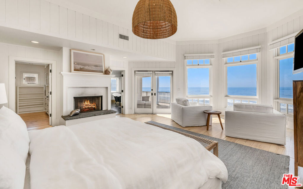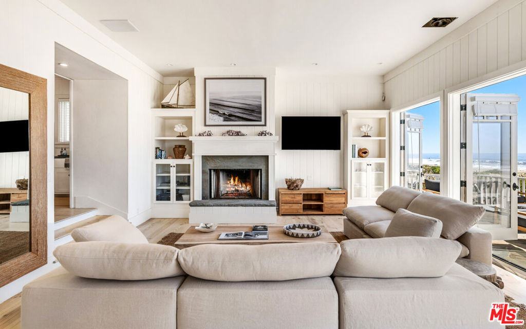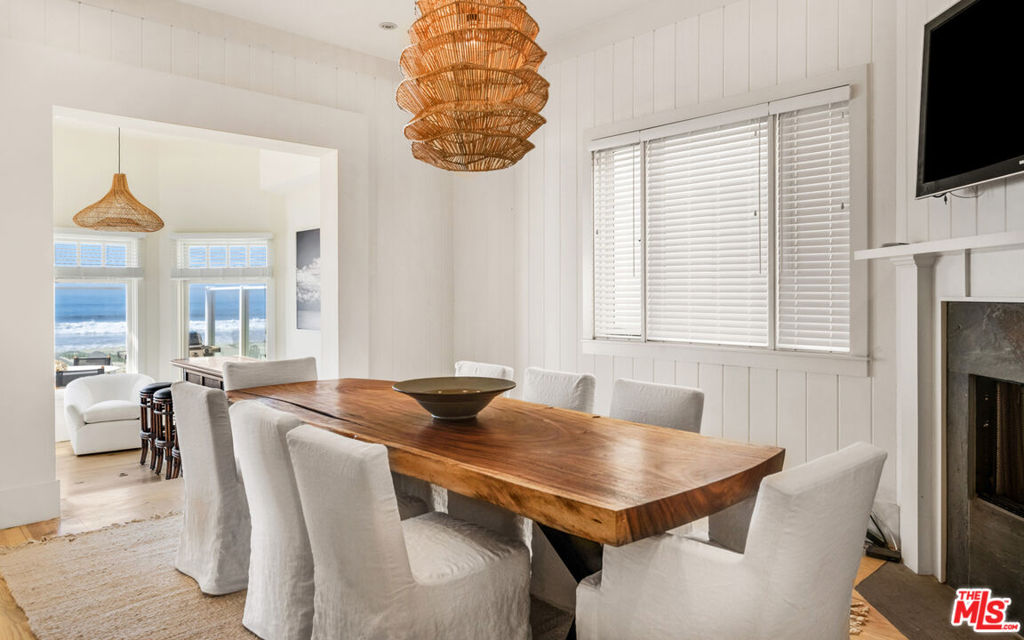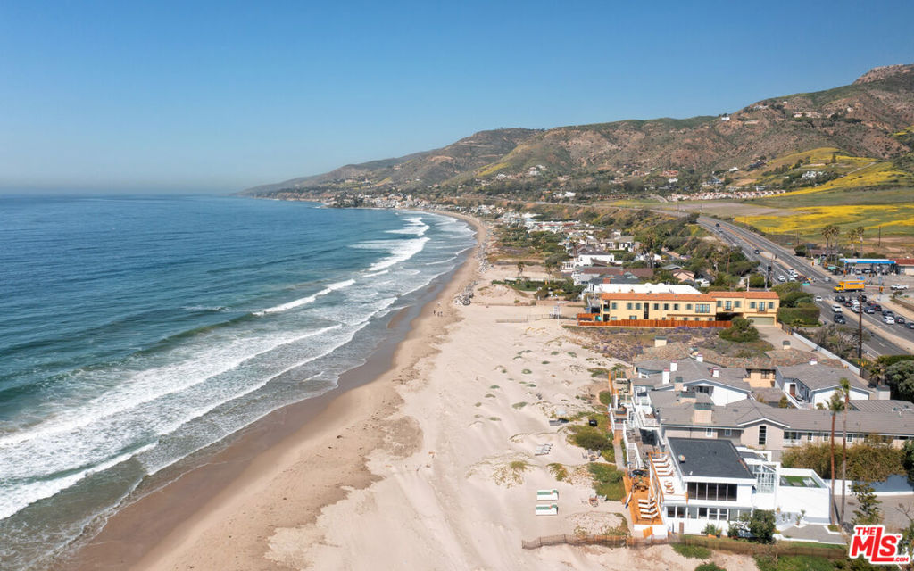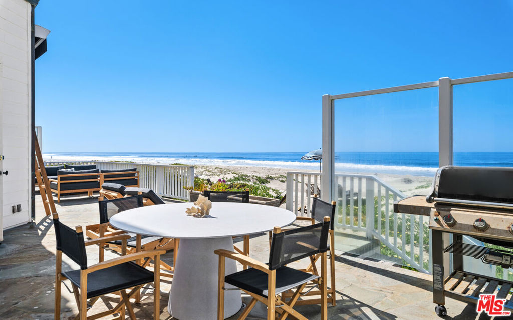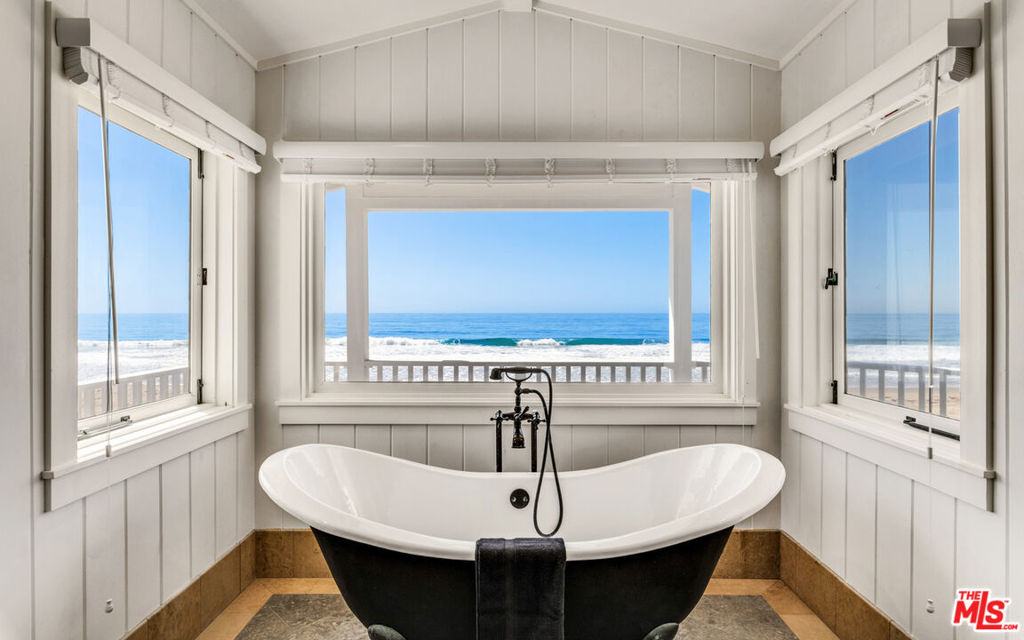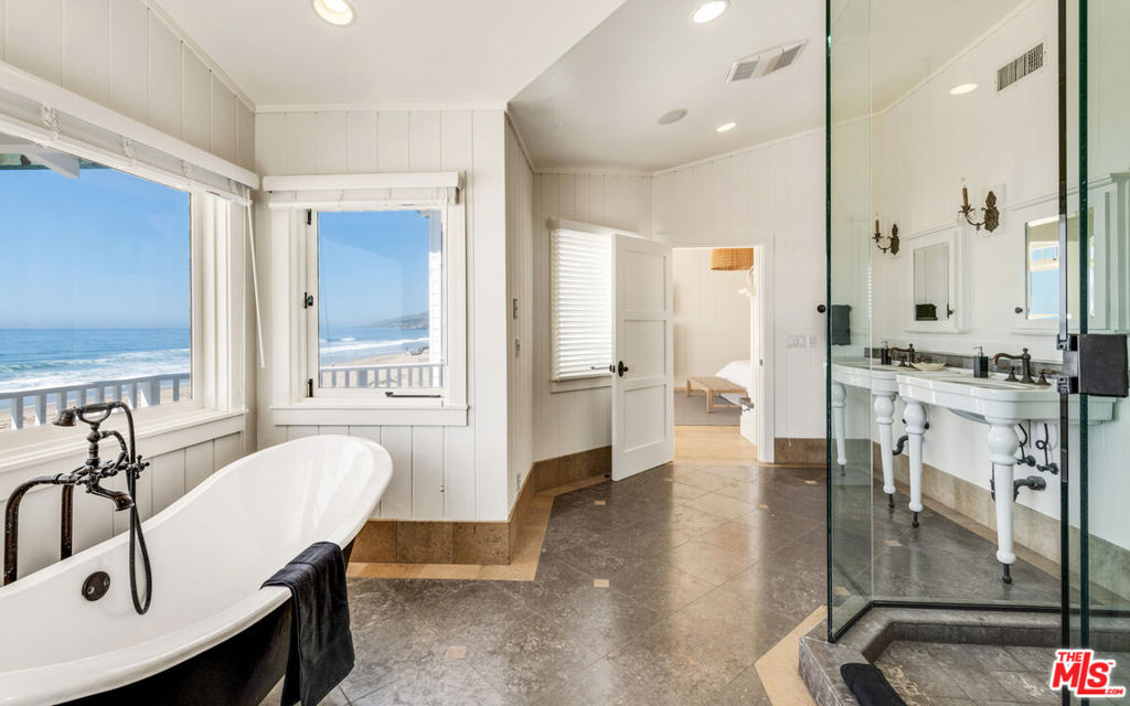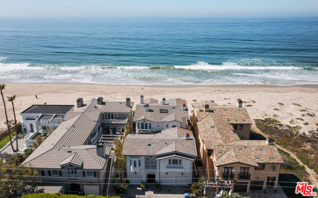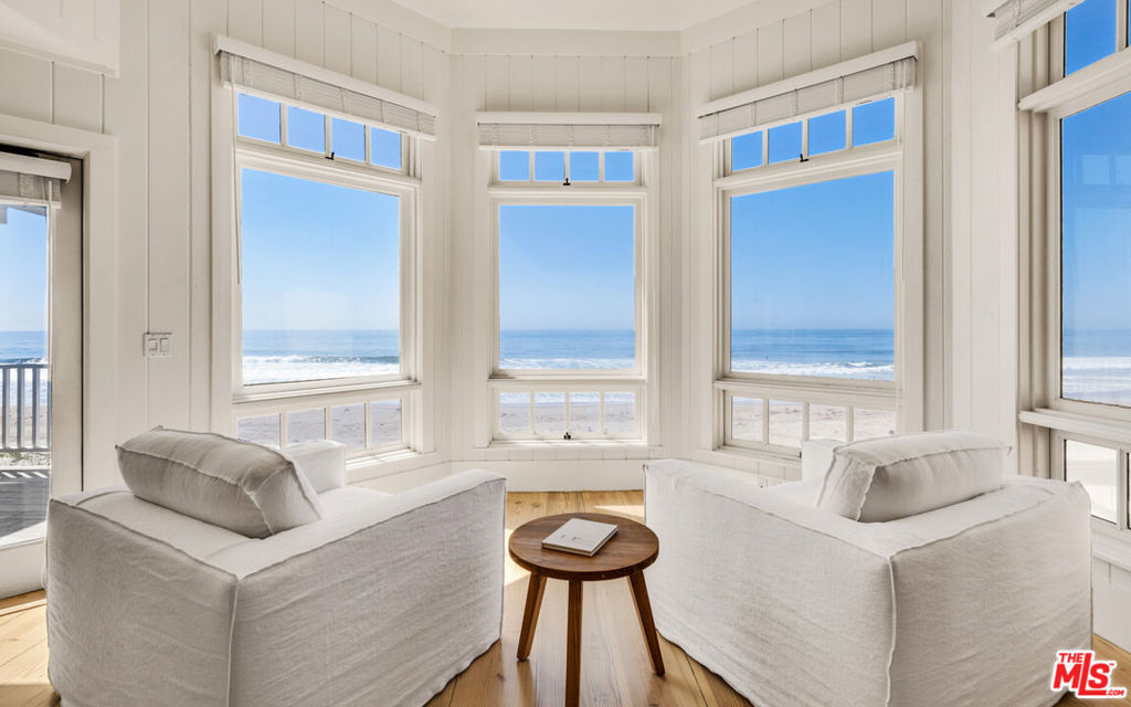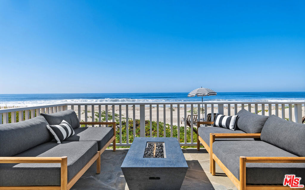 Malibu coastline and Cape Code-style combine for easy living on wide, flat Trancas Beach, with ocean views, sandy shoreline, and plenty of room for indoor-outdoor living and entertaining. A gated entry opens to a fountain breezeway and a spacious private courtyard complete with a flagstone fireplace, lounge seating, and a covered Jacuzzi with a waterfall. Freshly updated inside and out, the home has a two-bedroom, one-bath guesthouse with a full kitchen, gym area, living room with fireplace, loads of natural light, and access from inside the home or by way of a separate entrance off the courtyard. The main house, with lovely light-toned wood floors, has ocean views on display from the moment you walk through the door. Off the entry, a bonus/media room is equipped with a pool table, Stewart projection screen, en-suite bathroom, a hallway to the laundry room, and French doors to the courtyard. The entry hall continues past a powder room to butler doors that swing open to reveal a huge country kitchen complete with fireplace, table and chairs, stone counters, top-quality appliances, and generous cabinet and counter space. One end of the kitchen opens to the family room, which in turn opens to the courtyard. The other end of the kitchen steps down to the living room, with ocean views, a fireplace, and three sets of French doors opening onto a heated beachfront deck with dining area, seating, Weber barbecue, firepit, sensational views, and steps to the sand, where there is a hammock and additional chairs for stargazing and dolphin-watching. The living room has an additional bar-lounge. Off the main hallway is the formal dining room, with fireplace, flatscreen, beautiful handcrafted table, ocean views, and a large double-sided fish tank also visible from the hallway. On the upper floor, there are three bedrooms, each with balcony access. The primary suite features vaulted ceilings, a fireplace, a sitting area with gorgeous ocean views, huge custom closets, a lovely spa-style bath, and an oceanfront balcony with seating. Both the main house and the guest house have air conditioning. There is an outdoor shower in the side yard and three garages face the street. Trancas Country Market, with shops and dining, is a very short walk from this lovely oceanfront getaway.