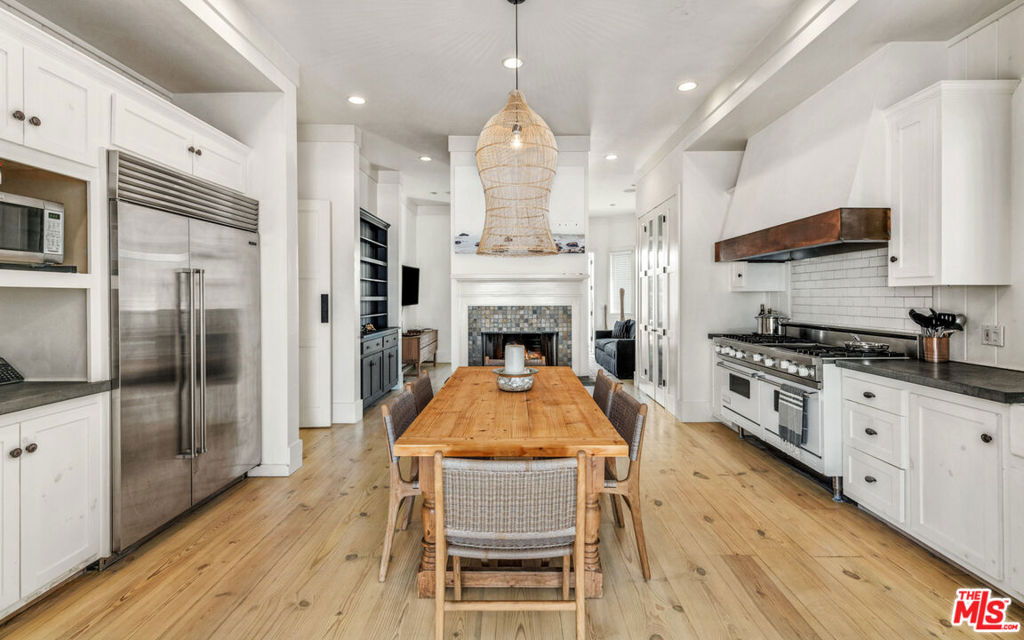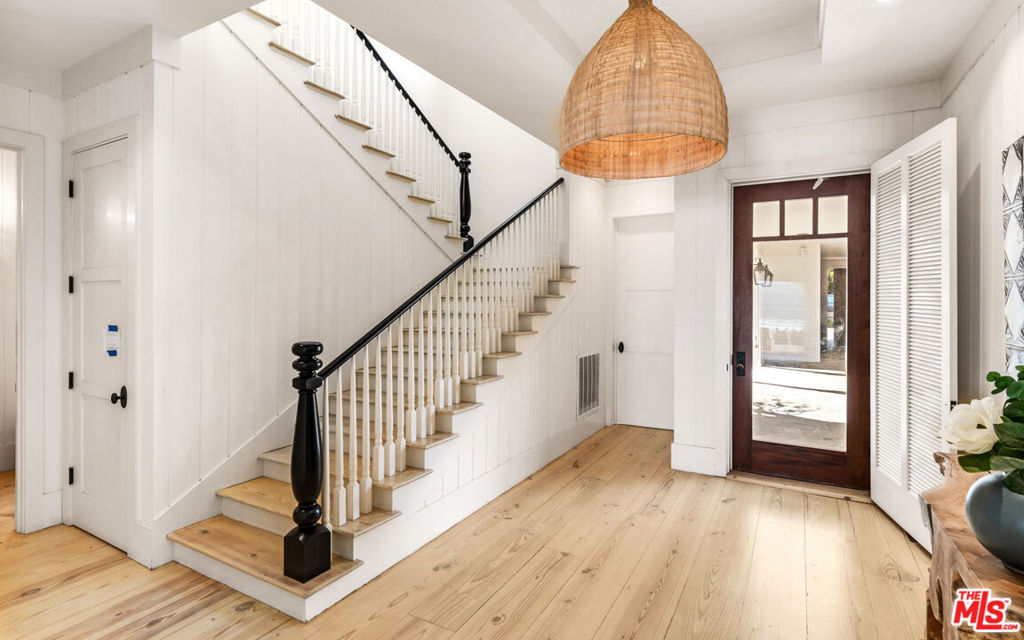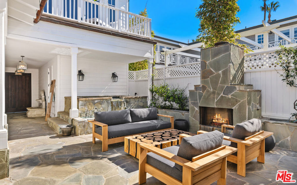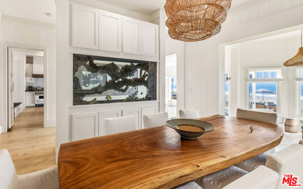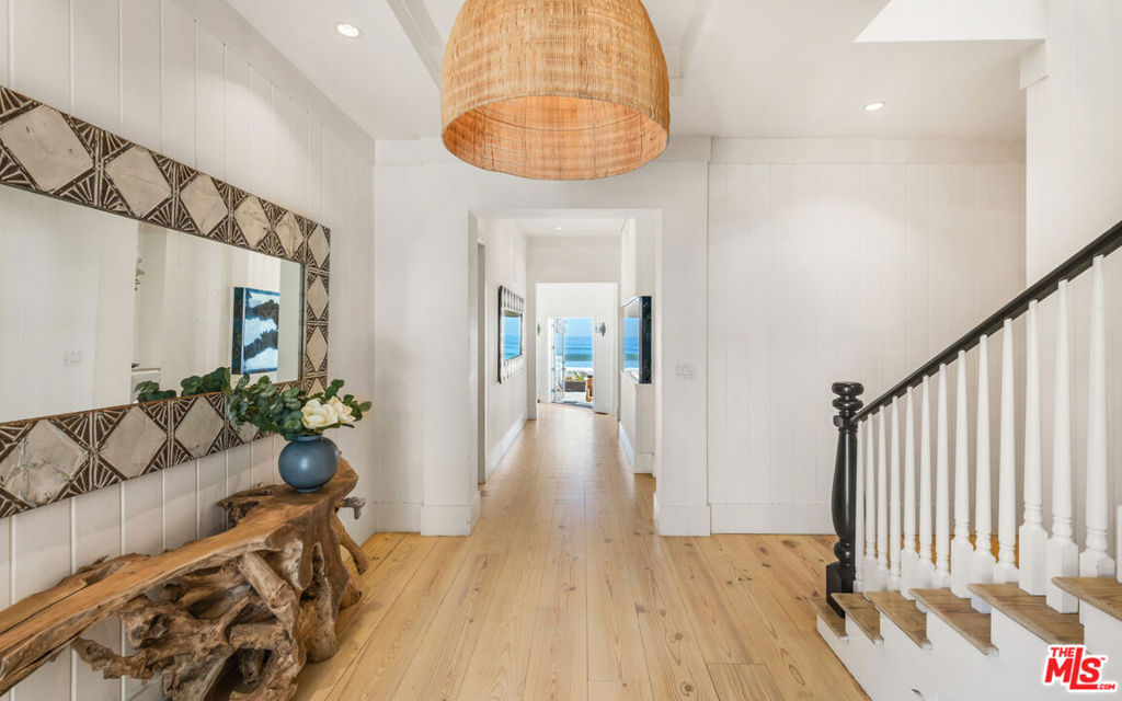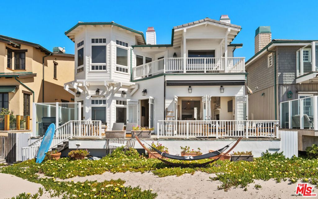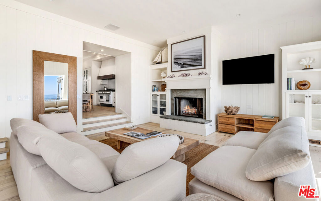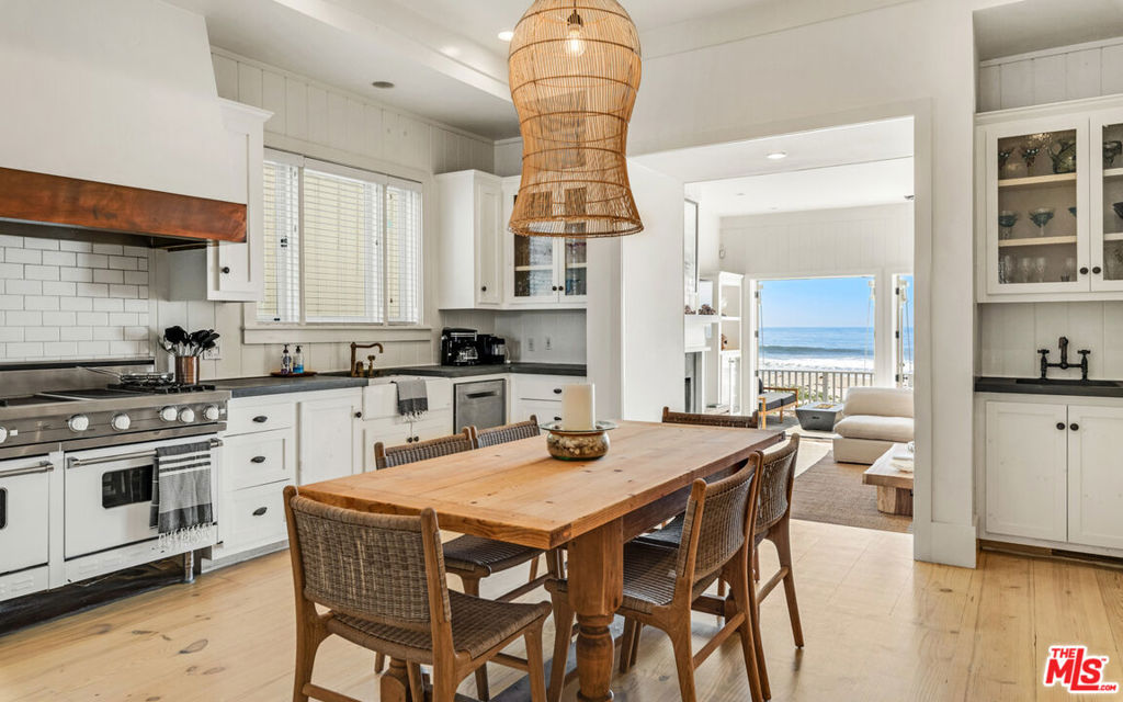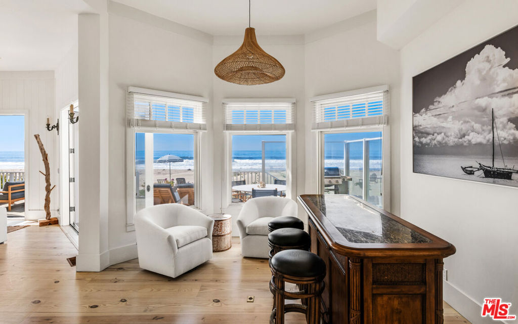 Malibu coastline and Cape Code-style combine for easy living on wide, flat Trancas Beach, with ocean views, sandy shoreline, and plenty of room for indoor-outdoor living and entertaining. A gated entry opens to a fountain breezeway and a spacious private courtyard complete with a flagstone fireplace, lounge seating, and a covered Jacuzzi with a waterfall. Freshly updated inside and out, the home has a two-bedroom, one-bath guesthouse with a full kitchen, gym area, living room with fireplace, loads of natural light, and access from inside the home or by way of a separate entrance off the courtyard. The main house, with lovely light-toned wood floors, has ocean views on display from the moment you walk through the door. Off the entry, a bonus/media room is equipped with a pool table, Stewart projection screen, en-suite bathroom, a hallway to the laundry room, and French doors to the courtyard. The entry hall continues past a powder room to butler doors that swing open to reveal a huge country kitchen complete with fireplace, table and chairs, stone counters, top-quality appliances, and generous cabinet and counter space. One end of the kitchen opens to the family room, which in turn opens to the courtyard. The other end of the kitchen steps down to the living room, with ocean views, a fireplace, and three sets of French doors opening onto a heated beachfront deck with dining area, seating, Weber barbecue, firepit, sensational views, and steps to the sand, where there is a hammock and additional chairs for stargazing and dolphin-watching. The living room has an additional bar-lounge. Off the main hallway is the formal dining room, with fireplace, flatscreen, beautiful handcrafted table, ocean views, and a large double-sided fish tank also visible from the hallway. On the upper floor, there are three bedrooms, each with balcony access. The primary suite features vaulted ceilings, a fireplace, a sitting area with gorgeous ocean views, huge custom closets, a lovely spa-style bath, and an oceanfront balcony with seating. Both the main house and the guest house have air conditioning. There is an outdoor shower in the side yard and three garages face the street. Trancas Country Market, with shops and dining, is a very short walk from this lovely oceanfront getaway.