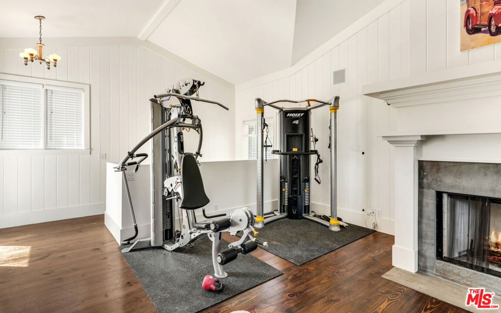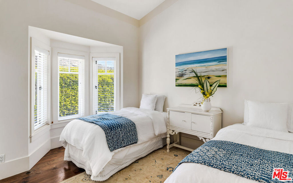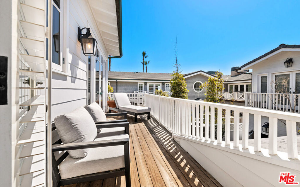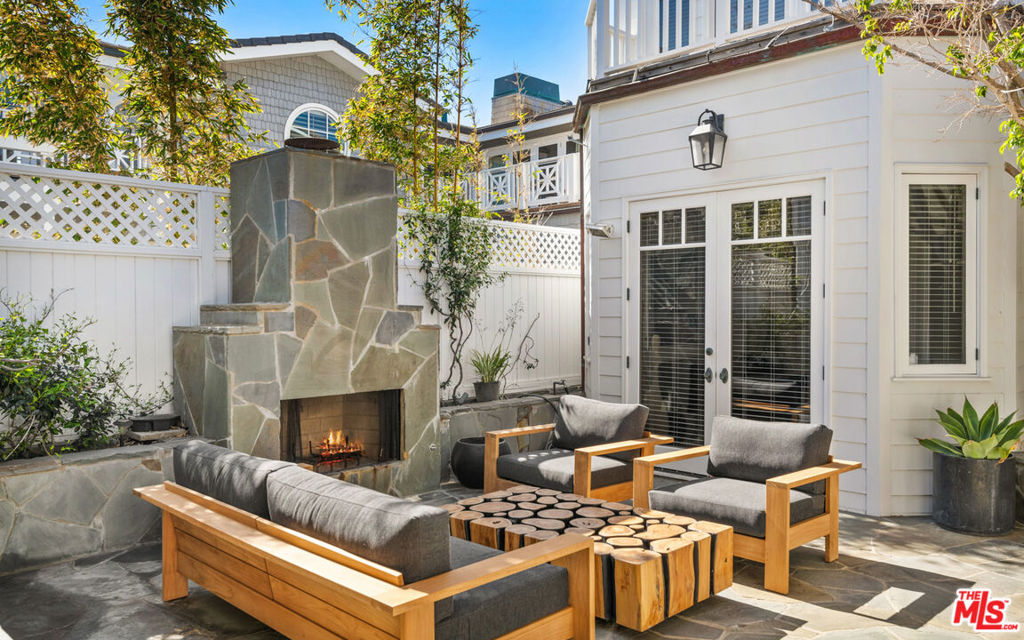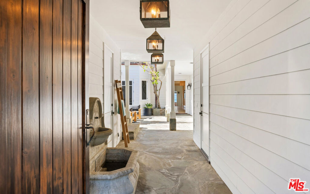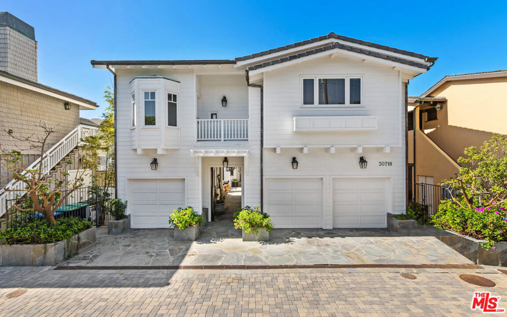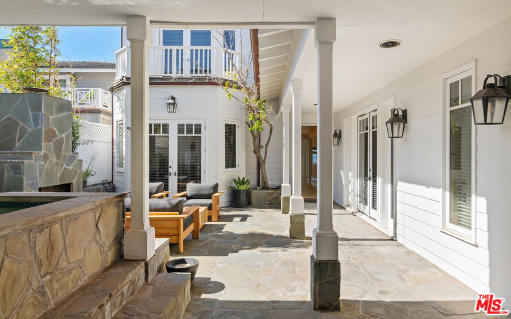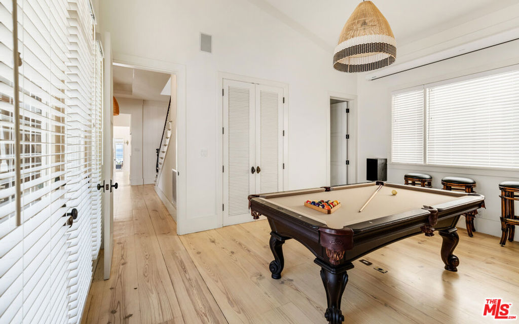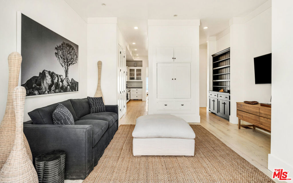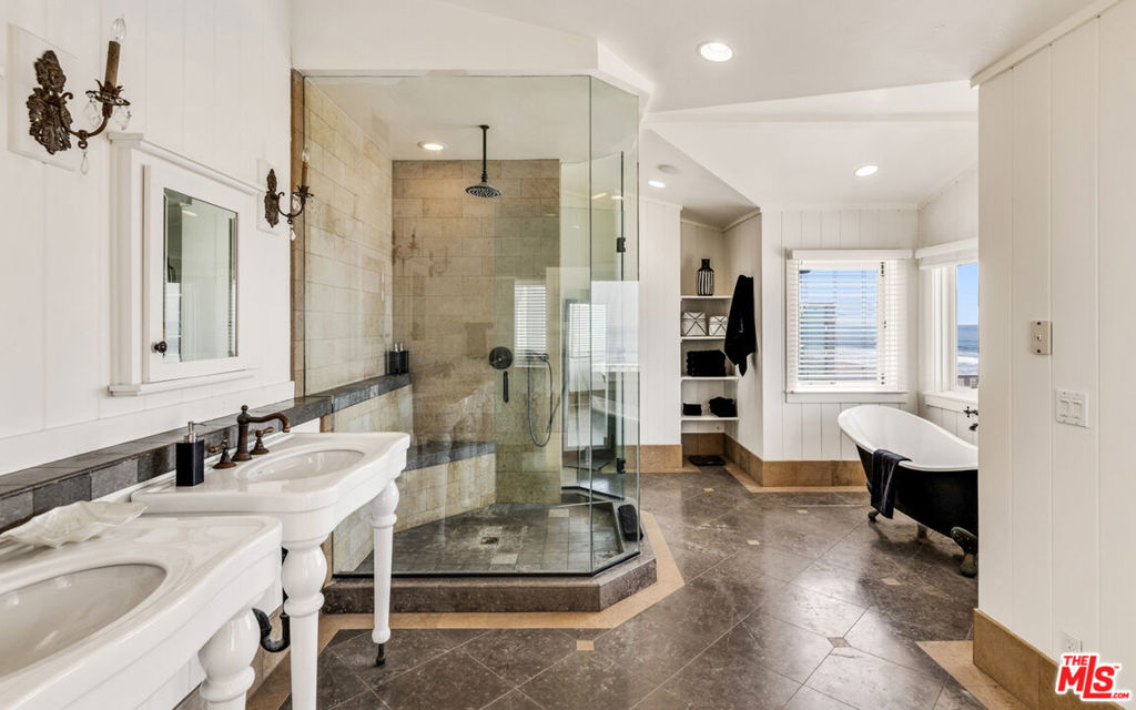 Malibu coastline and Cape Code-style combine for easy living on wide, flat Trancas Beach, with ocean views, sandy shoreline, and plenty of room for indoor-outdoor living and entertaining. A gated entry opens to a fountain breezeway and a spacious private courtyard complete with a flagstone fireplace, lounge seating, and a covered Jacuzzi with a waterfall. Freshly updated inside and out, the home has a two-bedroom, one-bath guesthouse with a full kitchen, gym area, living room with fireplace, loads of natural light, and access from inside the home or by way of a separate entrance off the courtyard. The main house, with lovely light-toned wood floors, has ocean views on display from the moment you walk through the door. Off the entry, a bonus/media room is equipped with a pool table, Stewart projection screen, en-suite bathroom, a hallway to the laundry room, and French doors to the courtyard. The entry hall continues past a powder room to butler doors that swing open to reveal a huge country kitchen complete with fireplace, table and chairs, stone counters, top-quality appliances, and generous cabinet and counter space. One end of the kitchen opens to the family room, which in turn opens to the courtyard. The other end of the kitchen steps down to the living room, with ocean views, a fireplace, and three sets of French doors opening onto a heated beachfront deck with dining area, seating, Weber barbecue, firepit, sensational views, and steps to the sand, where there is a hammock and additional chairs for stargazing and dolphin-watching. The living room has an additional bar-lounge. Off the main hallway is the formal dining room, with fireplace, flatscreen, beautiful handcrafted table, ocean views, and a large double-sided fish tank also visible from the hallway. On the upper floor, there are three bedrooms, each with balcony access. The primary suite features vaulted ceilings, a fireplace, a sitting area with gorgeous ocean views, huge custom closets, a lovely spa-style bath, and an oceanfront balcony with seating. Both the main house and the guest house have air conditioning. There is an outdoor shower in the side yard and three garages face the street. Trancas Country Market, with shops and dining, is a very short walk from this lovely oceanfront getaway.