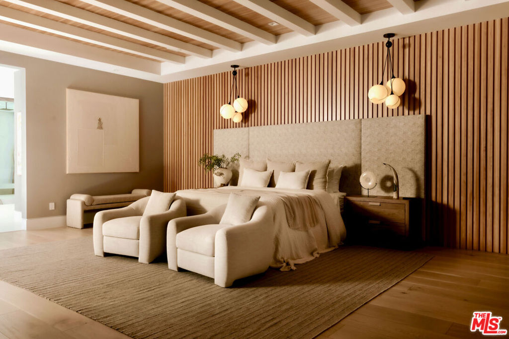 Indulge in an effortless resort-quality lifestyle from this extremely private entertainer's compound surrounded by natural greenery with sumptuous canyon views, showcasing a variety of premier amenities on 1.3 acres of mostly flat usable land. An absolute dream for recreational enthusiasts, growing families, and sports professionals alike, this exquisite haven includes a dedicated pickleball court, a professional-size basketball/sports court, and putting green, all enveloped by a flourishing leafy paradise. An expansive gated motor court provides parking for ten cars, and a striking entry calms the senses with soft organic tones complementing the lush hillside beyond. A gourmet chef's kitchen is outfitted with bookmatched stone slabs, triple waterfall island, and Miele appliances as well as a commercial-grade walk-in refrigerator in the caterer's prep galley. Both bar and wine room are showpiece standouts, and the theatre is expertly configured to match a true cinema experience. Upstairs, the primary wing alone spans 3,000 square feet and offers a lounge, two-sided fireplace, and a marvelous spa-worthy imported European stone-clad bathroom plus dual closet changing rooms, one of which features a walk-out balcony with fire pit overlooking the grounds below. Other amenities include an office, gym, sauna, and mud room. Enjoy a casual, fun-filled lifestyle at this private, family-friendly luxury resort that features a cabana with outdoor kitchen and rainfall curtain, relaxation loggia, a 16-person sunken fire pit with glass view to pool, numerous sitting areas, organic gardens, and 3,000-square-foot rooftop deck optimized for entertaining under California skies. Secluded in a park-like setting with no immediate neighbors, this ideal estate promises joyful existence and enduring, uninterrupted leisure from one of the most highly sought-after locales in the world. Welcome to the peak of contemporary luxury.