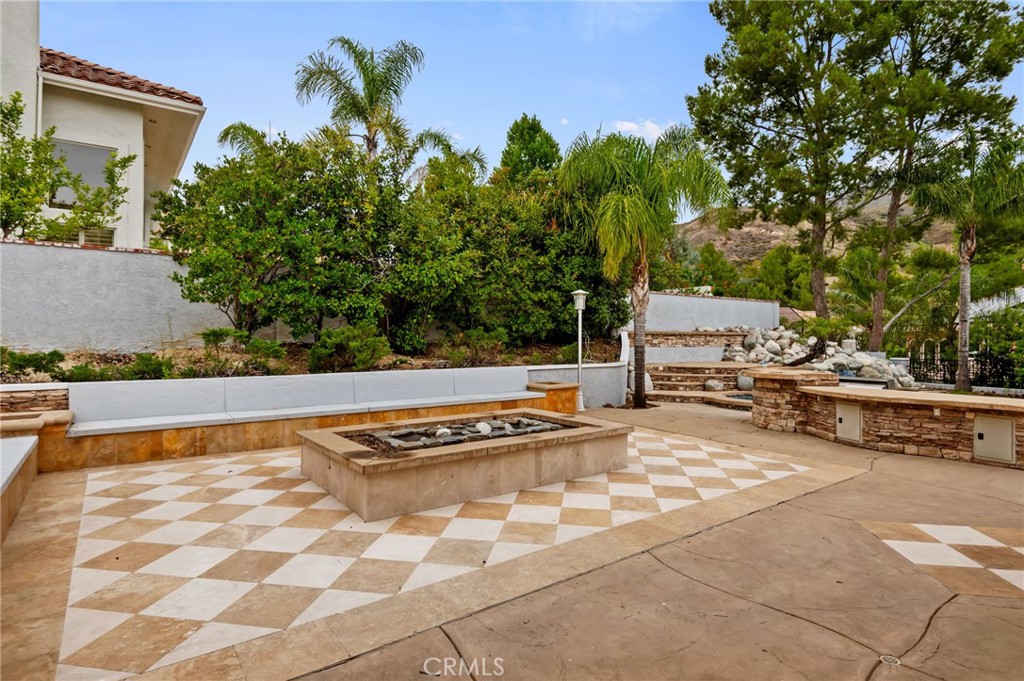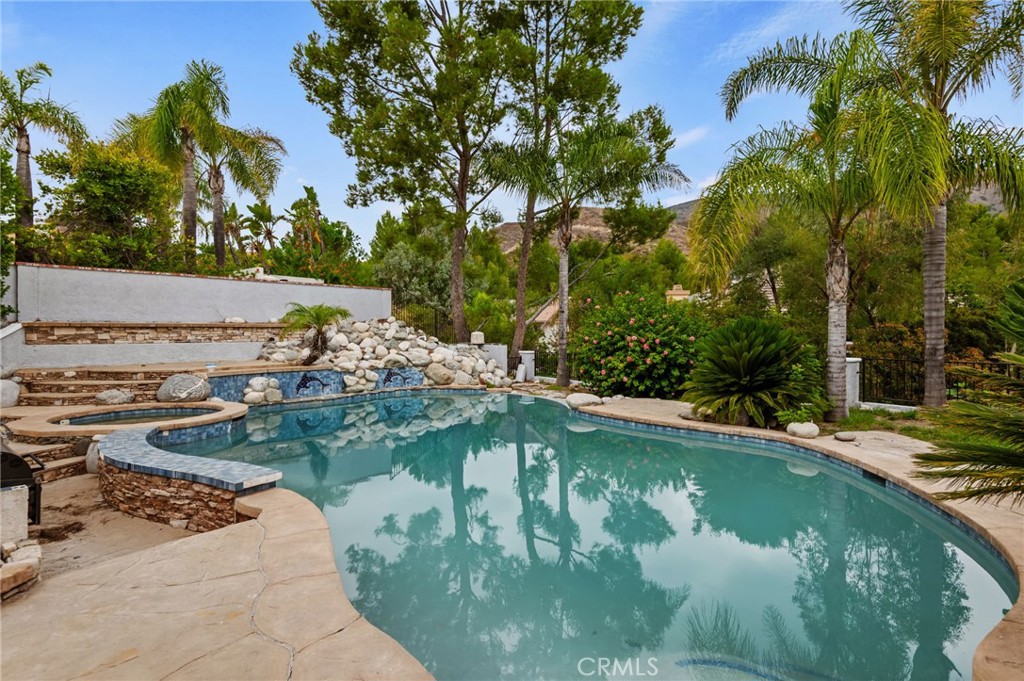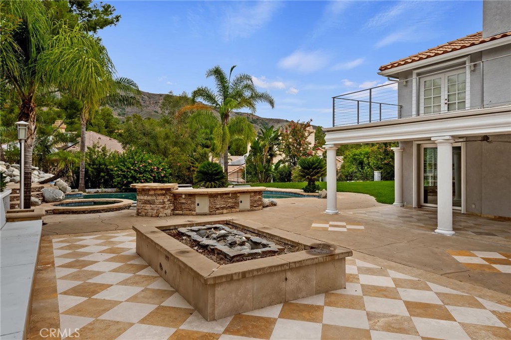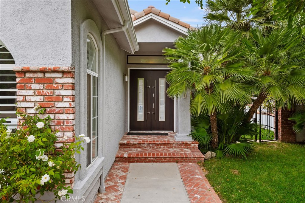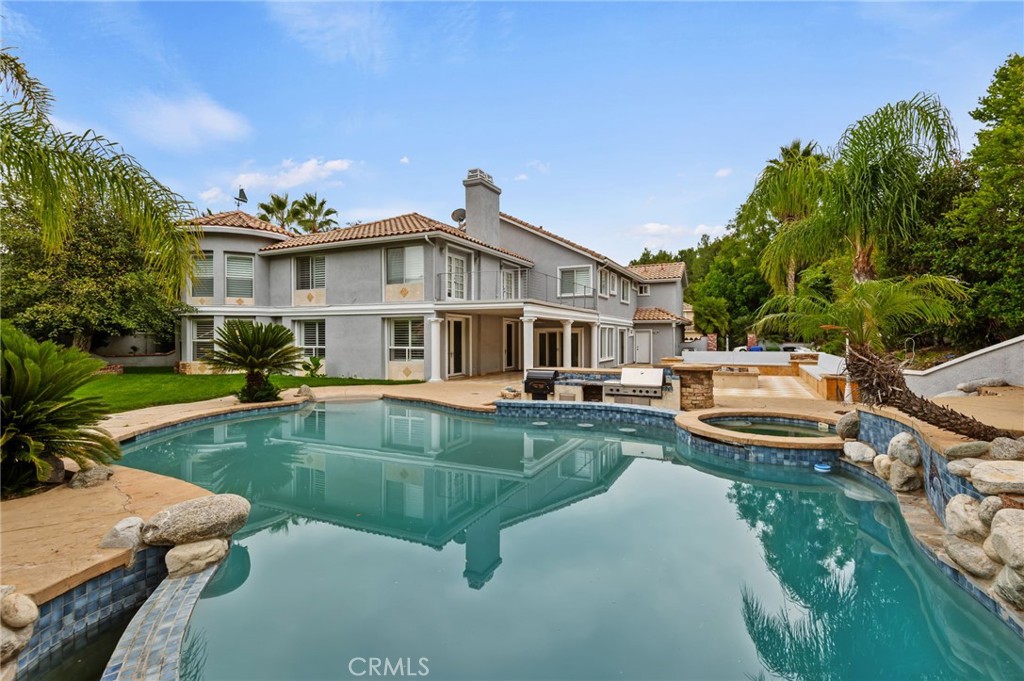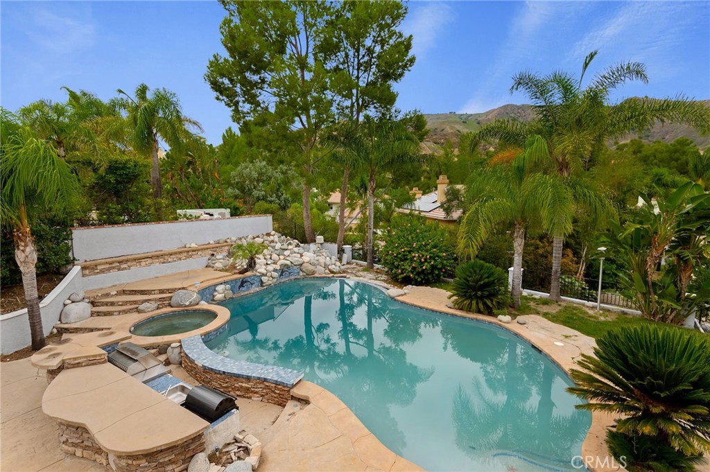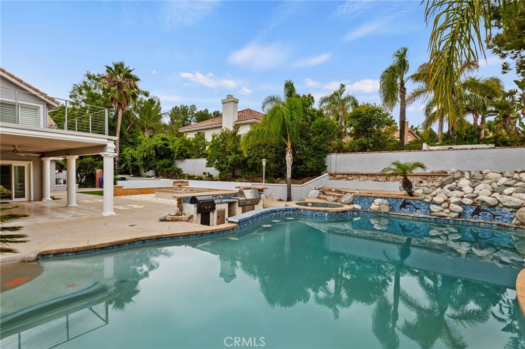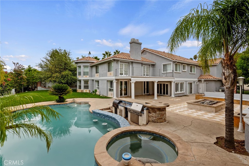 Located in the prestigious gated community of The Classics. This stunningly remodeled & expanded home boasts over 5,200 sqft of an open & light floor-plan! Extensive use of brick for home fascia, planter accents & front porch. New double door entry leads into the grand foyer w/ vaulted ceiling. This amazing home features an open concept redesigned center island kitchen w/ stainless steel Jennar double oven, gas stove & dishwasher. The huge family room w/ custom ceiling includes a wet bar with wine fridge, four sets of floor to ceiling French doors & stone fireplace. Elegant step-down living room w/ vaulted ceiling & mirror accented gas fireplace. Dining options include a separate formal dining room, spacious breakfast nook & secondary dining room off kitchen. Spectacular primary suite features its own staircase for entry, private lounge, volume ceilings, magnificent fireplace, French doors to balcony & a walk-in closet with skylight & hideaway. The primary suite bathroom features a jetted tub, double sinks & glass shower. Ensuite bedroom upstairs w/ private full bathroom. Remodeled upstairs full hall bath w/ double vanities. Bluetooth speaker placed in light fixture of fourth bedroom upstairs. Perfect loft upstairs for a home office. Downstairs ensuite bedroom includes its own remodeled bathroom w/ shower. Guest bathroom located downstairs near the stone accented wall has been beautifully remodeled. In-door laundry room w/ built-in linen cabinets, sink & utility closet. Additional highlights include split air conditioning units, custom front staircase w/ horizontal steel stringer design, window shutters, upgraded light fixtures, two smart Eco thermostats, white porcelain tile & upgraded wood flooring. 2023 upgrades include a new roof, new solar panel for backyard planter wall sprinklers & new spa pump. Upgraded driveway lights. Massive lot of over 20,000 sqft has an entertainer’s dream yard w/ excellent privacy & mountain views. Features include a beach entry infinity pool w/ boulder waterfall, spa, covered patio with recessed lights & new ceiling fan, large grass area, flagstone accented BBQ center w/ sink and built-in bench seating around oversized rectangular fire-pit. The side yard offers additional entertaining space w/ a beautiful fountain. Patio w/ turf has space for a sport court. Additionally you’ll find a dog run w/ fruit trees behind the pool. Make your musical dreams come true in the sound studio which occupies a portion of the 4 car garage.