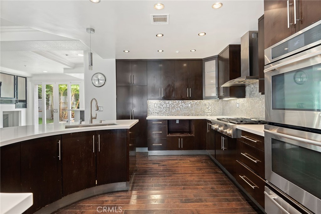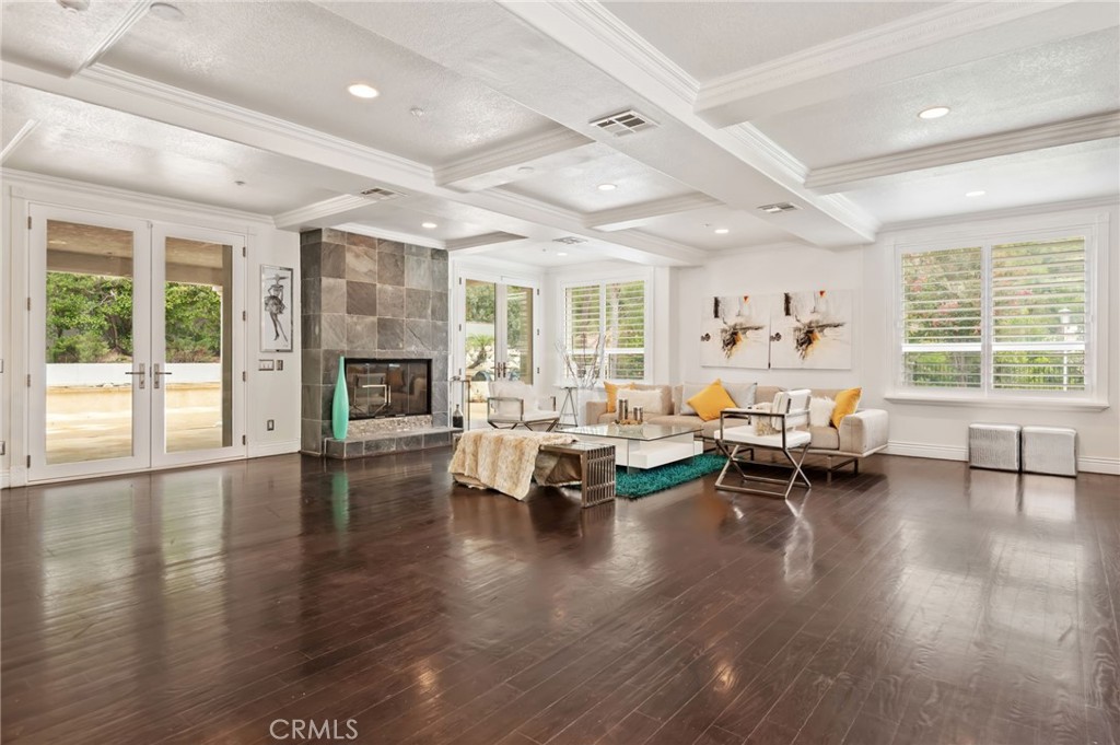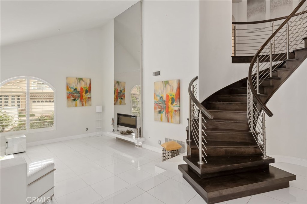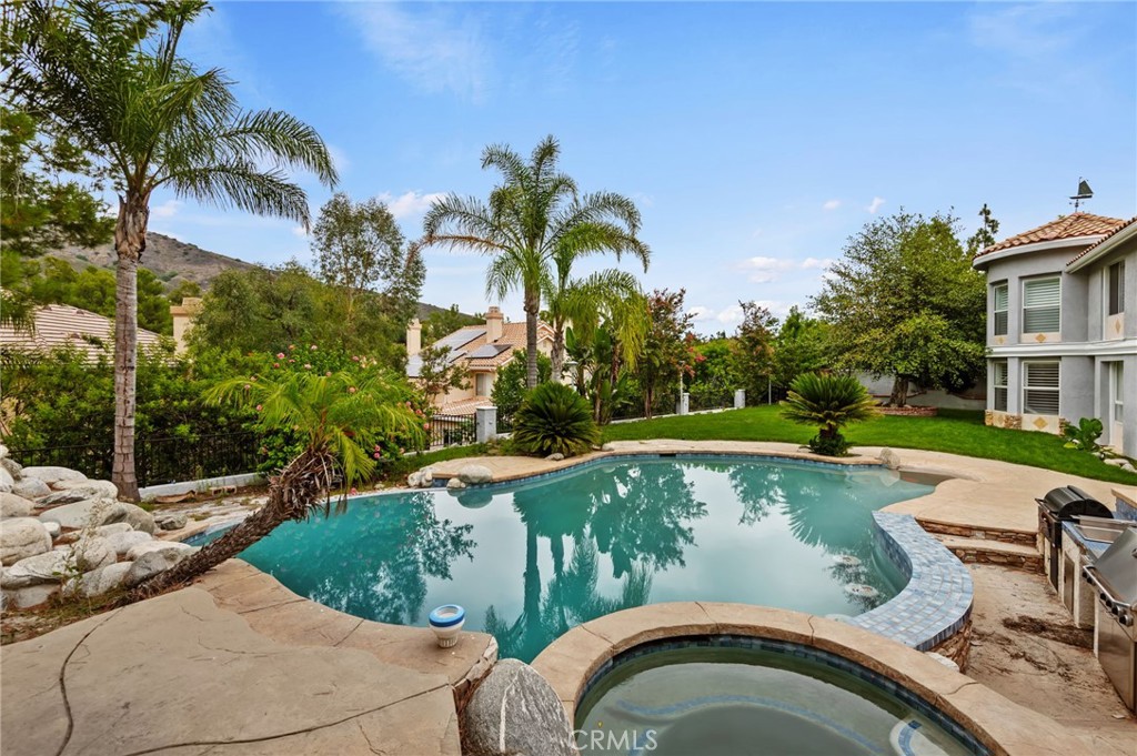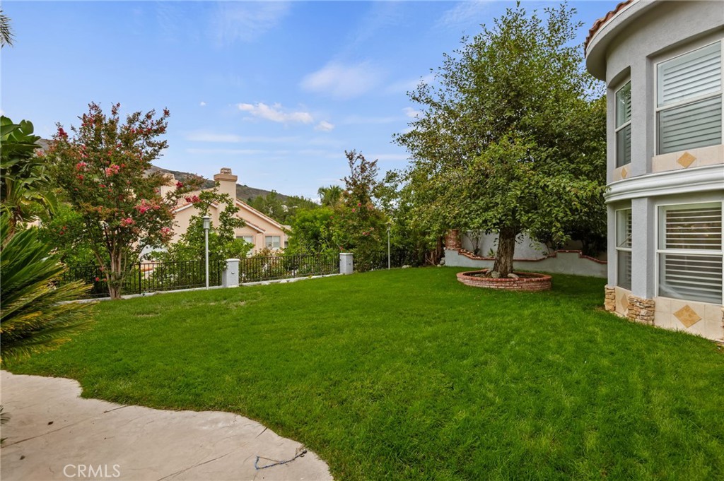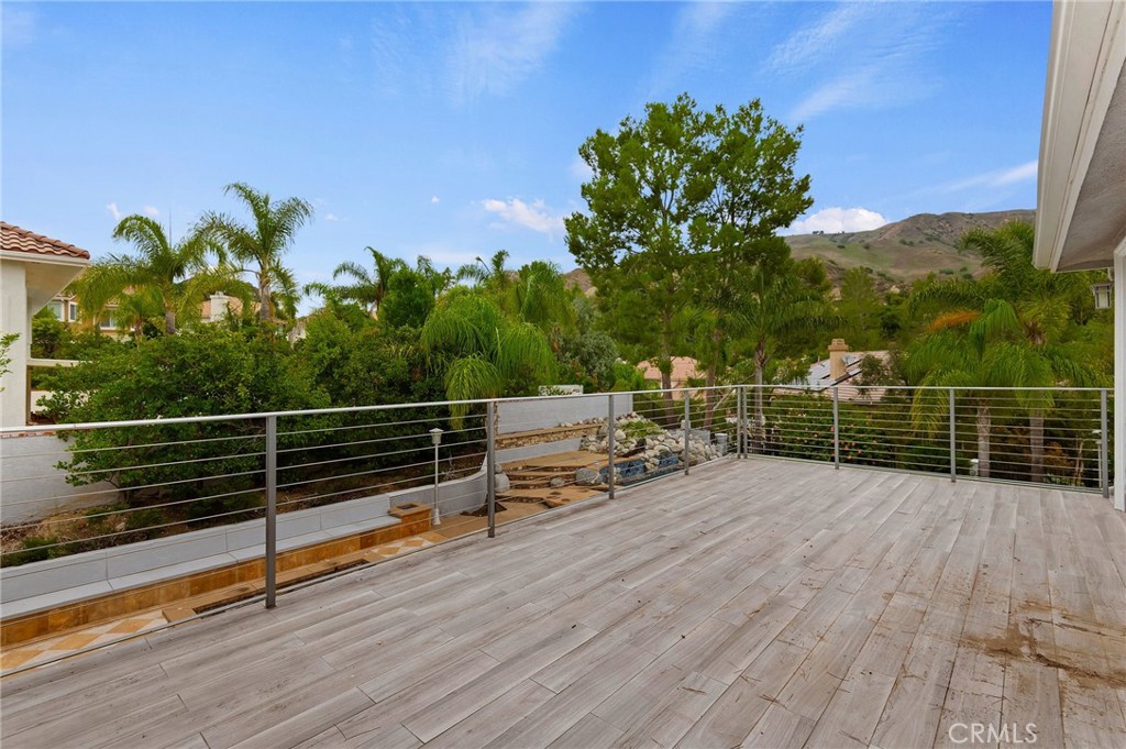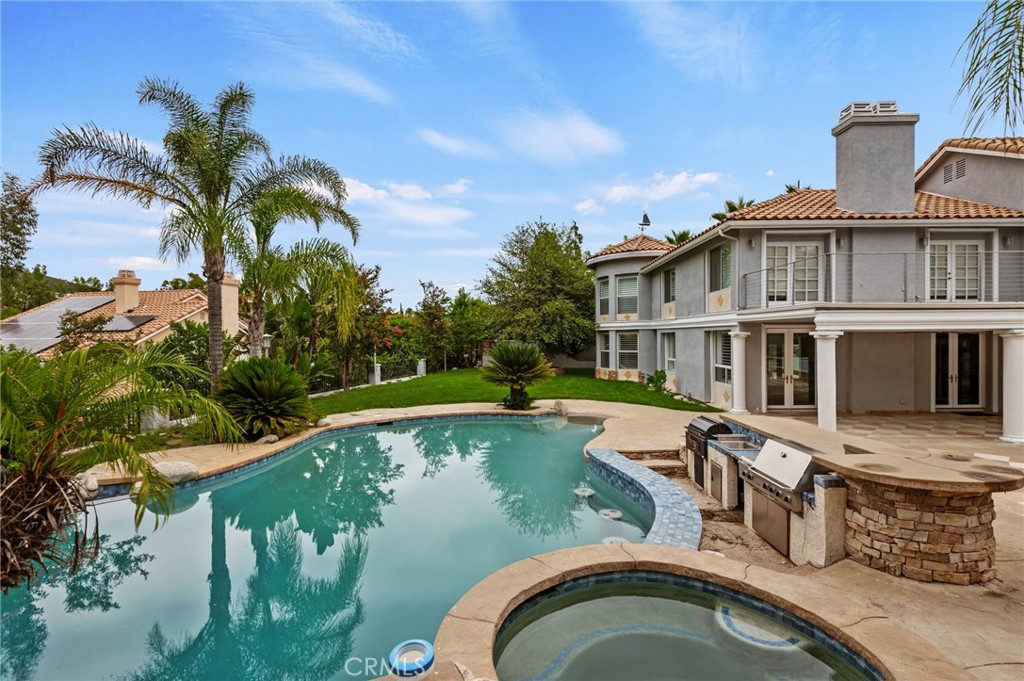 Located in the prestigious gated community of The Classics. This stunningly remodeled & expanded home boasts over 5,200 sqft of an open & light floor-plan! Extensive use of brick for home fascia, planter accents & front porch. New double door entry leads into the grand foyer w/ vaulted ceiling. This amazing home features an open concept redesigned center island kitchen w/ stainless steel Jennar double oven, gas stove & dishwasher. The huge family room w/ custom ceiling includes a wet bar with wine fridge, four sets of floor to ceiling French doors & stone fireplace. Elegant step-down living room w/ vaulted ceiling & mirror accented gas fireplace. Dining options include a separate formal dining room, spacious breakfast nook & secondary dining room off kitchen. Spectacular primary suite features its own staircase for entry, private lounge, volume ceilings, magnificent fireplace, French doors to balcony & a walk-in closet with skylight & hideaway. The primary suite bathroom features a jetted tub, double sinks & glass shower. Ensuite bedroom upstairs w/ private full bathroom. Remodeled upstairs full hall bath w/ double vanities. Bluetooth speaker placed in light fixture of fourth bedroom upstairs. Perfect loft upstairs for a home office. Downstairs ensuite bedroom includes its own remodeled bathroom w/ shower. Guest bathroom located downstairs near the stone accented wall has been beautifully remodeled. In-door laundry room w/ built-in linen cabinets, sink & utility closet. Additional highlights include split air conditioning units, custom front staircase w/ horizontal steel stringer design, window shutters, upgraded light fixtures, two smart Eco thermostats, white porcelain tile & upgraded wood flooring. 2023 upgrades include a new roof, new solar panel for backyard planter wall sprinklers & new spa pump. Upgraded driveway lights. Massive lot of over 20,000 sqft has an entertainer’s dream yard w/ excellent privacy & mountain views. Features include a beach entry infinity pool w/ boulder waterfall, spa, covered patio with recessed lights & new ceiling fan, large grass area, flagstone accented BBQ center w/ sink and built-in bench seating around oversized rectangular fire-pit. The side yard offers additional entertaining space w/ a beautiful fountain. Patio w/ turf has space for a sport court. Additionally you’ll find a dog run w/ fruit trees behind the pool. Make your musical dreams come true in the sound studio which occupies a portion of the 4 car garage.