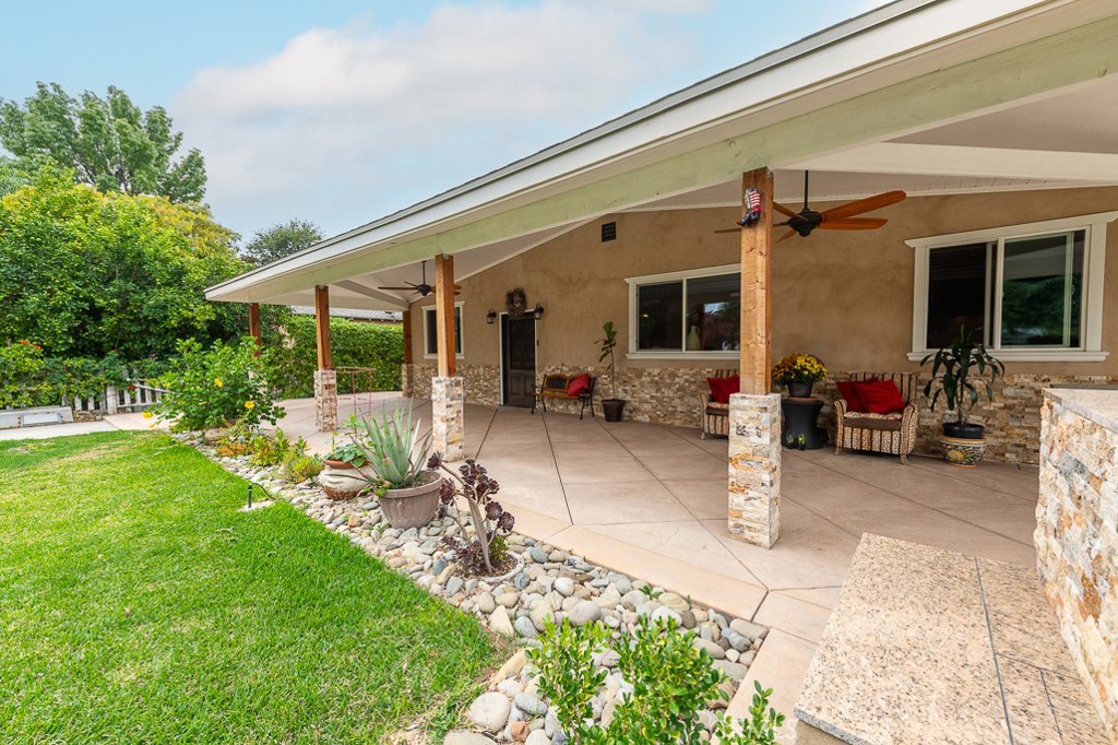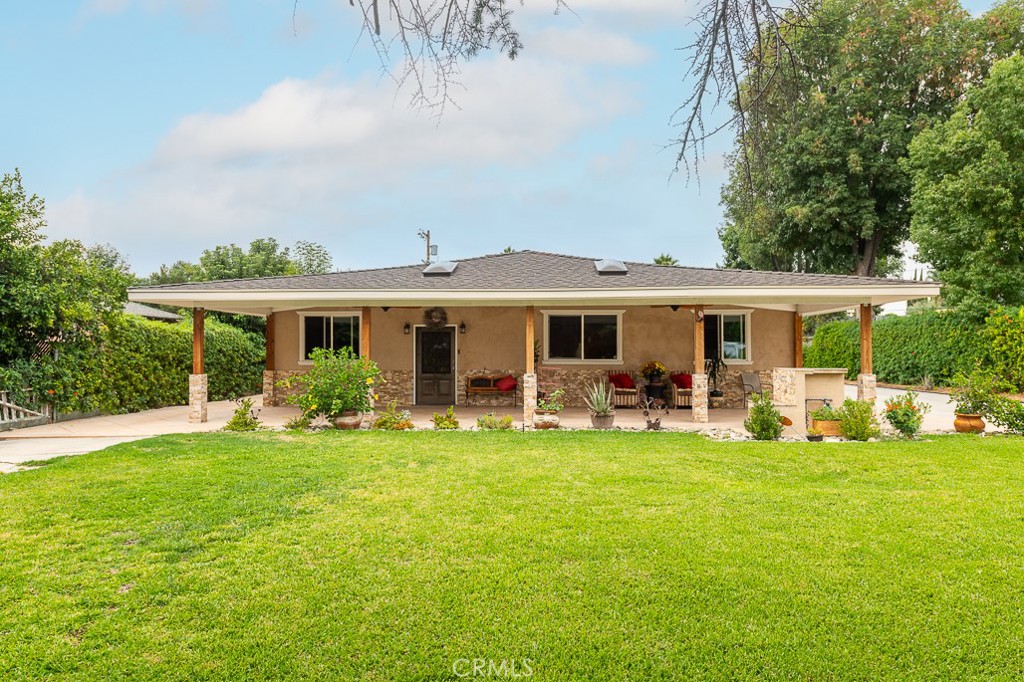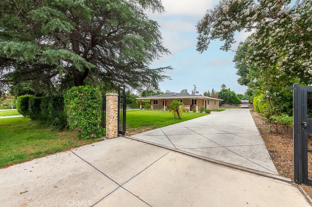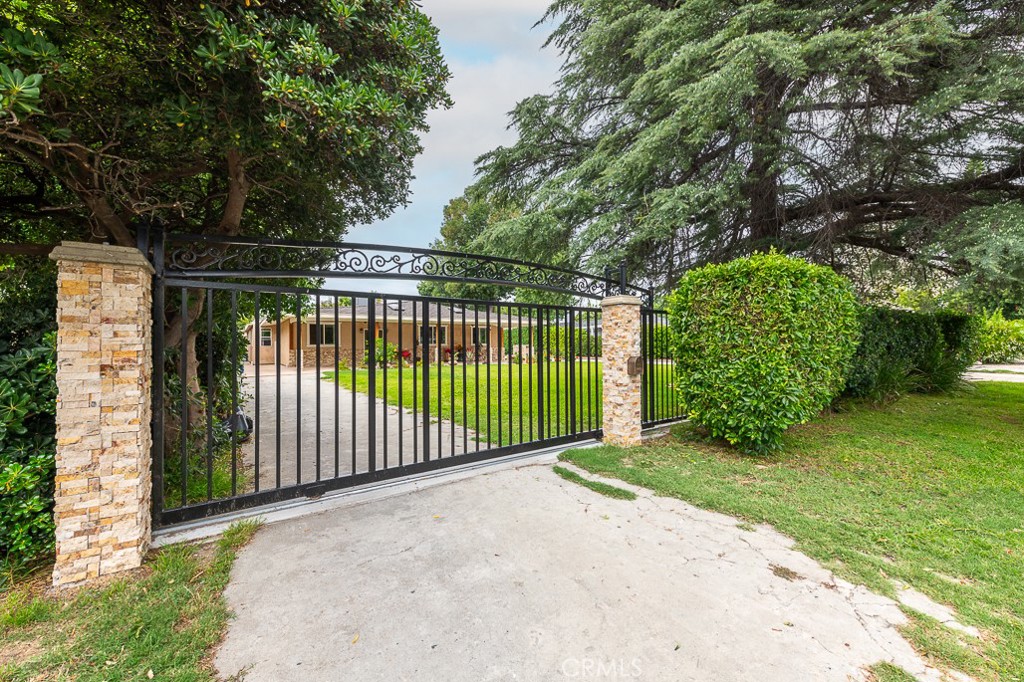 This single level remodeled residence is set behind impressive gates on an expansive lot of landscaped parklike grounds with a stunning towering cedar tree that greets as you enter the gated double entry motor court to a sweeping grass filled front yard that sets the tone for this magical property. Set far back from the street, a unique covered front patio with skylights and ceilings fans is the perfect backdrop to enjoy the beautiful grounds and creates a special entry into this unique home. Porcelain tile, hardwood flooring and high ceilings throughout converge as you enter the great room that leads to the dining area and a chef’s gourmet-styled kitchen with customized dark wood cabinets, granite counter tops, glass tiled backsplash and a center island with seating and storage. All secondary bedrooms are ensuite with ceiling fans and walk-in closets, the perfect complement to the primary suite that features an alcove area perfect for an office, a walk-in closet behind frosted glass wood framed doors and a 2-person shower with dual shower heads and dual sinks. The direct access oversized 2-car garage also contains entry into an ensuite bonus room. A built-in Spanish tiled grill station overlooks lush green grassy areas filled with lemon and orange trees and a garden growing tomatoes, bell peppers, watermelon, and cantaloupe. Additional amenities include designer fixtures, recessed lighting, crown moldings, indoor laundry, and gated parking galore at the front and rear of the property. Close to restaurants, shopping, and all the valley has to offer. Truly a must see!