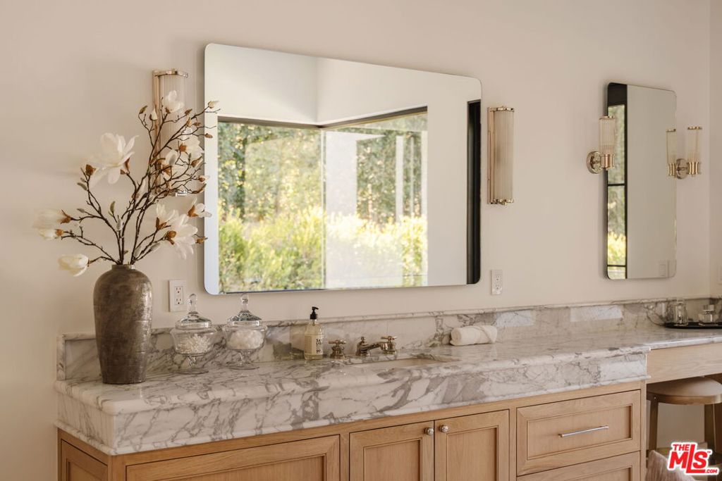 Poised behind gates on an expansive and secluded three-quarter-acre parcel, this newly completed Traditional estate is a triumph of scale, craftsmanship, and refined architectural vision. Set within one of Brentwood's most sought-after enclaves, the residence spans nearly 11,000 square feet of exquisitely tailored living space, comprising a grand main residence and a fully detached, two-story guest house -- each executed with an exacting standard of design and finish. A dramatic double-height foyer introduces interiors of quiet grandeur, where custom millwork, hand-selected natural stone, and a gallery-like flow elevate both form and function. The formal living room is anchored by a marble fireplace and sculptural wine bar, while the adjoining dining room opens entirely to the outdoors via a retractable glass wall, creating seamless flow to the estate's lush grounds. At the center of the home, a marble-clad chef's kitchen combines striking aesthetics with professional-grade performance, featuring Sub-Zero and Wolf appliances, an artisan coffee bar, and bespoke cabinetry. A sunlit breakfast area opens to a gracious family room, while a lounge and seated wet bar, dedicated office, guest suite, and two powder rooms complete the main level. An elevator and dual staircases ascend to the private quarters above, where five ensuite bedrooms are thoughtfully arranged, including an extraordinary primary retreat with soaring beamed ceilings and glass doors opening to a private terrace. Two couture-inspired dressing rooms and a spa-caliber bath, complete with a dual steam shower and sunlit soaking tub, offer a daily ritual of serenity. An upper-level screening room, wet bar, gym, and additional family room provide flexible spaces for recreation and relaxation. Outside, the resort-style grounds unfold with effortless sophistication: a sparkling pool and spa with Baja shelf and auto cover, a covered and heated entertaining pavilion, outdoor kitchen, firepit lounge, sport court, and vast emerald lawn, all surrounded by mature hedging that ensures privacy and tranquility. The two-story guest house offers unparalleled versatility, featuring a living room, kitchenette, powder room, and an upper-level bedroom suite with a private balcony, ideal for a pool house, accommodating extended stays, or a studio. Additional highlights include a fully integrated home automation system, dual laundry rooms, and a 3-car EV-ready garage accessed via a cobblestone motor court. More than a home this is a rare architectural statement, exquisitely composed and beautifully aligned with the timeless spirit of the Westside.