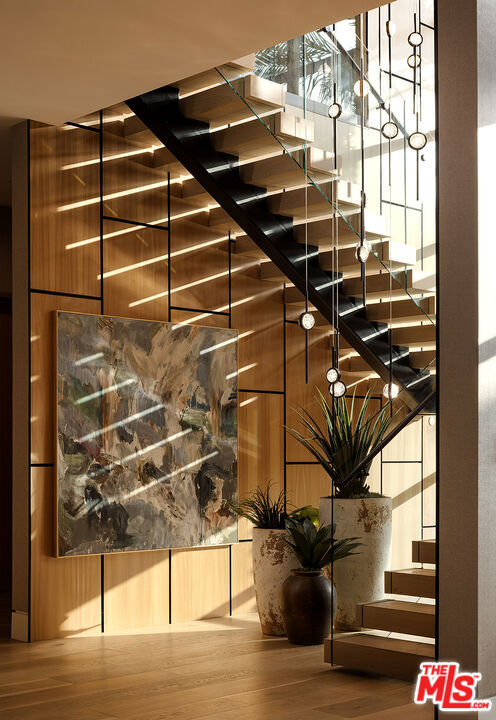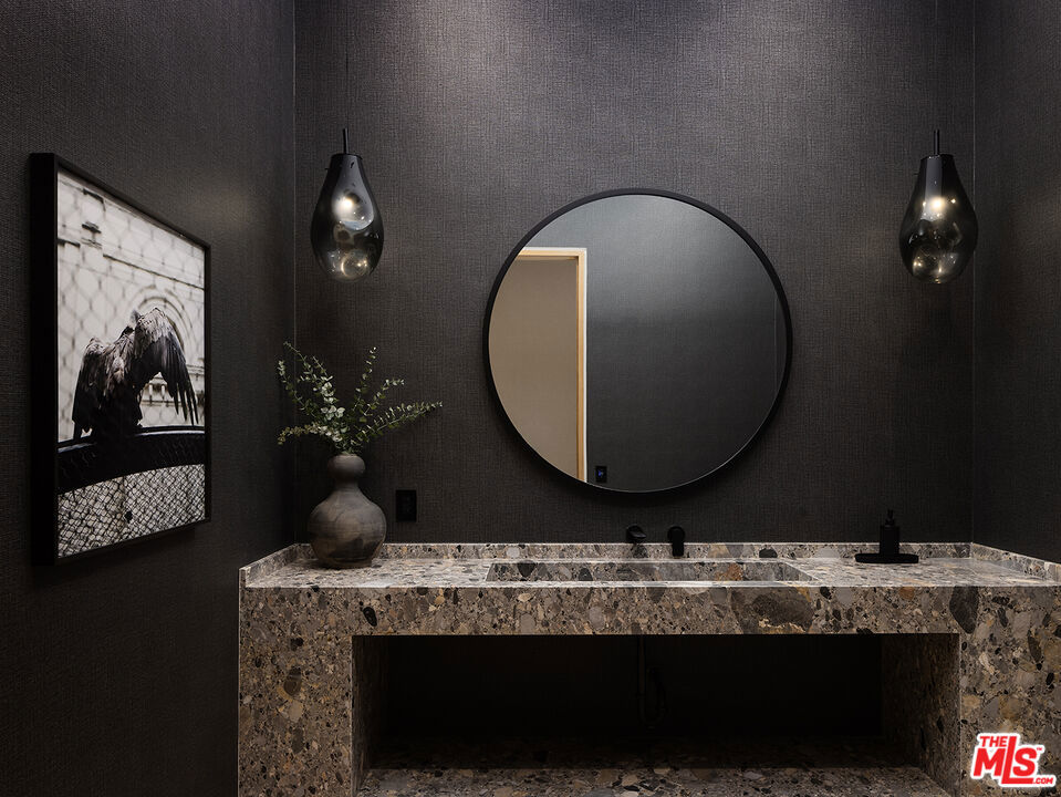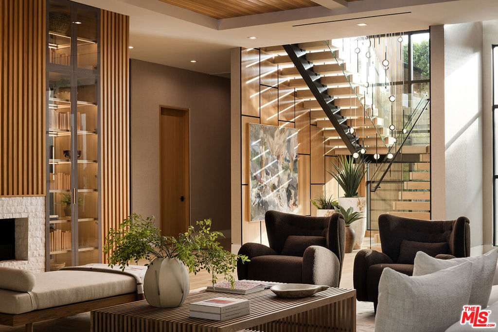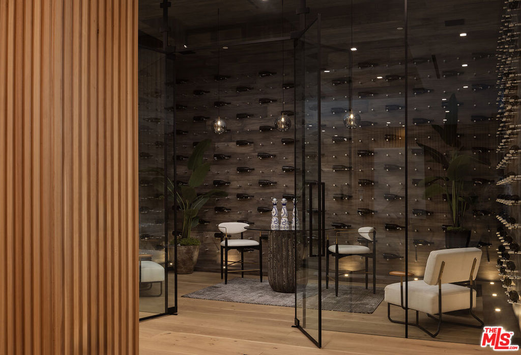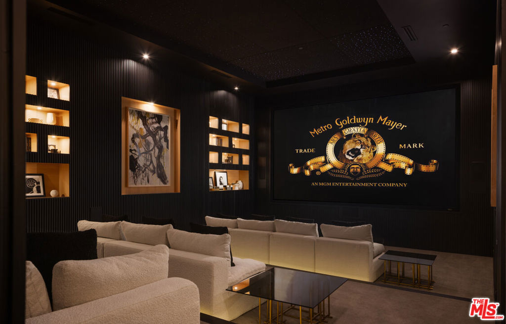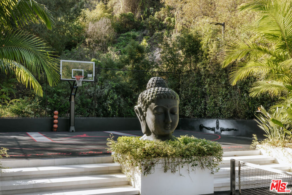An absolute dream for recreational enthusiasts, growing families, and lovers of the al-fresco way of life, this exquisite haven includes a tropical open-air dining room, dedicated pickleball court, a professional-size basketball/sports court, and putting green, all enveloped by a flourishing leafy paradise. Enjoy a casual, fun-filled lifestyle at this private, family-friendly luxury resort that also features a cabana with outdoor kitchen and rainfall curtain, relaxation loggia, a 16-person sunken fire pit with glass view to pool, numerous sitting areas, organic gardens, and 3,000-square-foot rooftop deck optimized for entertaining under California skies. An expansive gated motor court provides parking for ten cars, and a striking entry calms the senses with soft organic tones complementing the lush hillside beyond. A gourmet chef's kitchen is outfitted with bookmatched stone slabs, triple waterfall island, and Miele appliances as well as a commercial-grade walk-in refrigerator in the caterer's prep galley. Both bar and wine room are showpiece standouts, and the theatre is expertly configured to match a true cinema experience. Upstairs, the primary wing alone spans 3,000 square feet and offers a lounge, two-sided fireplace, and a marvelous spa-worthy imported European stone-clad bathroom plus dual closet changing rooms, one of which features a walk-out balcony with fire pit overlooking the grounds below. Other amenities include an office, gym, sauna, and mud room. Indulge in an effortless resort-quality lifestyle from this extremely private entertainer's compound surrounded by natural greenery with sumptuous canyon views, showcasing a variety of premier amenities on 1.3 acres of mostly flat usable land. Secluded in a park-like setting with no immediate neighbors, this ideal estate promises joyful existence and enduring, uninterrupted leisure from one of the most highly sought-after locales in the world. Welcome to the peak of contemporary luxury.