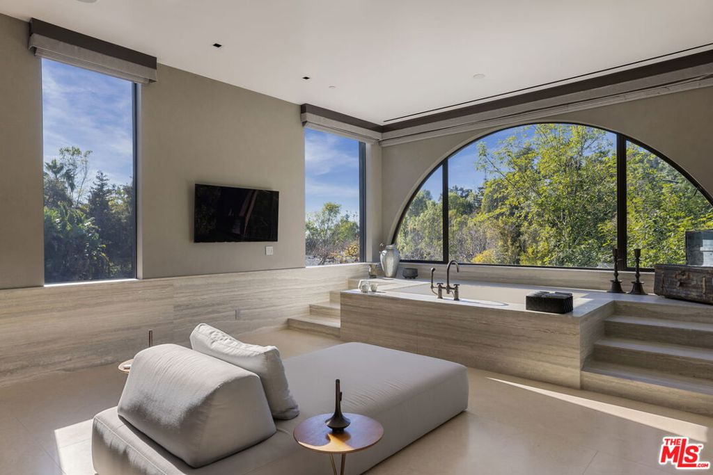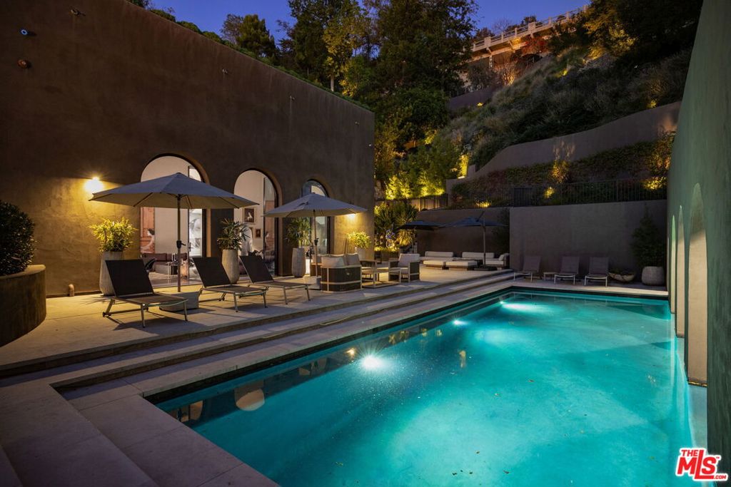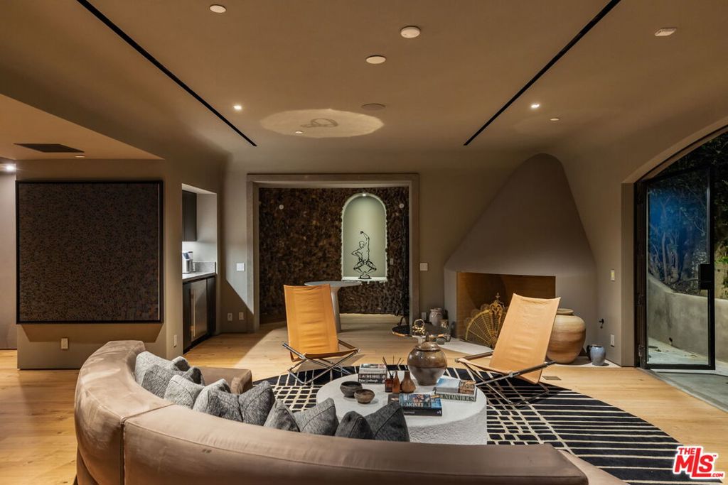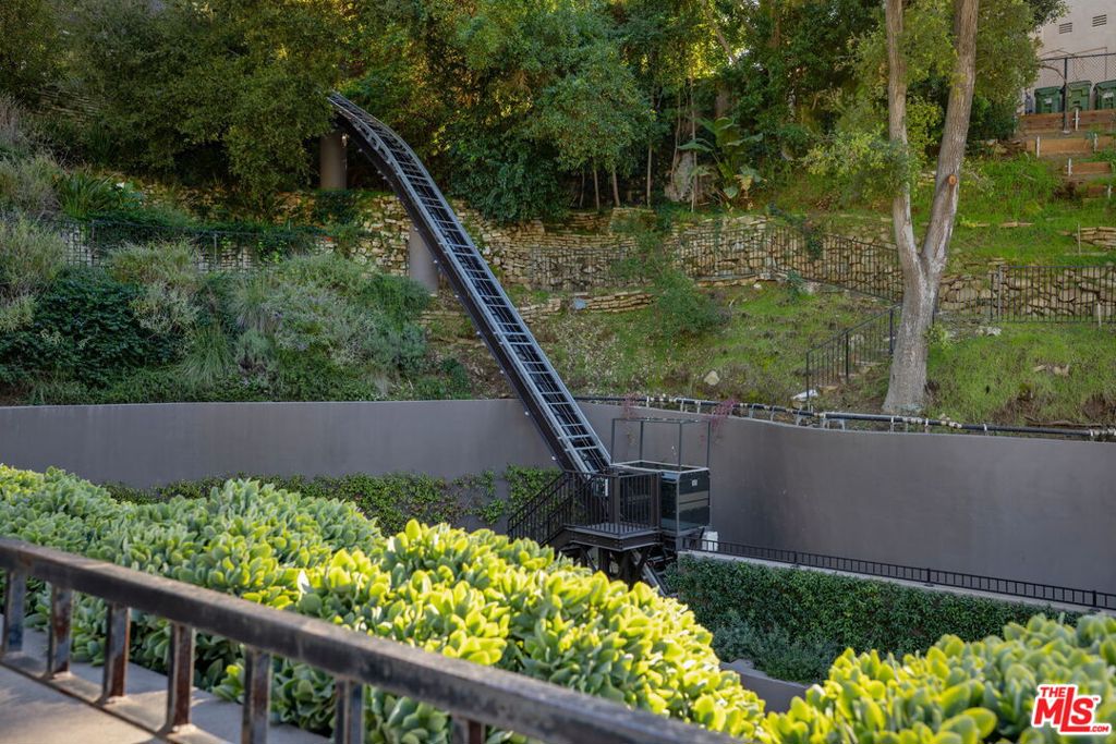 A rare architectural estate of exceptional privacy and design pedigree, tucked within a gated Brentwood enclave moments from The Getty. Completed in 2024 by AD100 designers Studio Shamshiri, this one-of-a-kind residence sits on a 1.2-acre gated lot offering exceptional privacy. Controlled gates open to an expansive motor court and an underground garage for six automobiles, leading to a dramatic entry anchored by sculptural curves and a soaring helical staircase that defines the home's bold signature. The main residence offers five bedrooms, complemented by a separate one-bedroom guest house. Four bedrooms are located on the second level, while the top-floor primary suite is a private sanctuary with a spa-like bath, large closets, and a spacious rooftop terrace with a fireplace. Outdoors, The grounds evoke a resort-like atmosphere, anchored by a Moroccan-influenced pool, multiple lounging and entertaining terraces, and manicured landscaping. The signature experience is a private funicular that ascends from the main grounds to two separate luxury yurts perched high above the estate, each complete with bathrooms, power, and water, revealing panoramic canyon and ocean views at the summit, while a walking path offers an equally scenic route to the top. Designed for large-scale entertaining and refined daily living, the home features seamless indoor-outdoor flow, high ceilings, hand-troweled plaster walls, bronze accents, and seven fireplaces throughout. The Wolf and Miele kitchen with bespoke millwork flows seamlessly into a temperature-controlled wine vault, professional bar, and formal dining spaces. With whole-home Control4 automation and surround sound, this exceptional property delivers unparalleled privacy, design pedigree, and a truly unforgettable living experience.