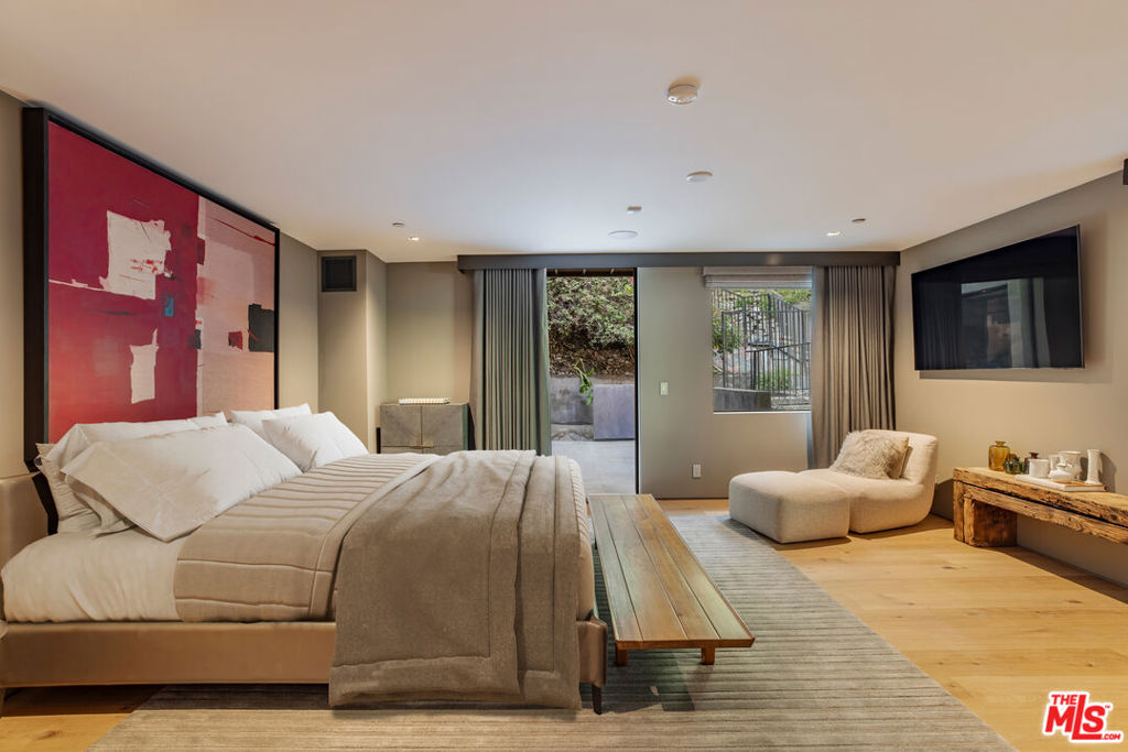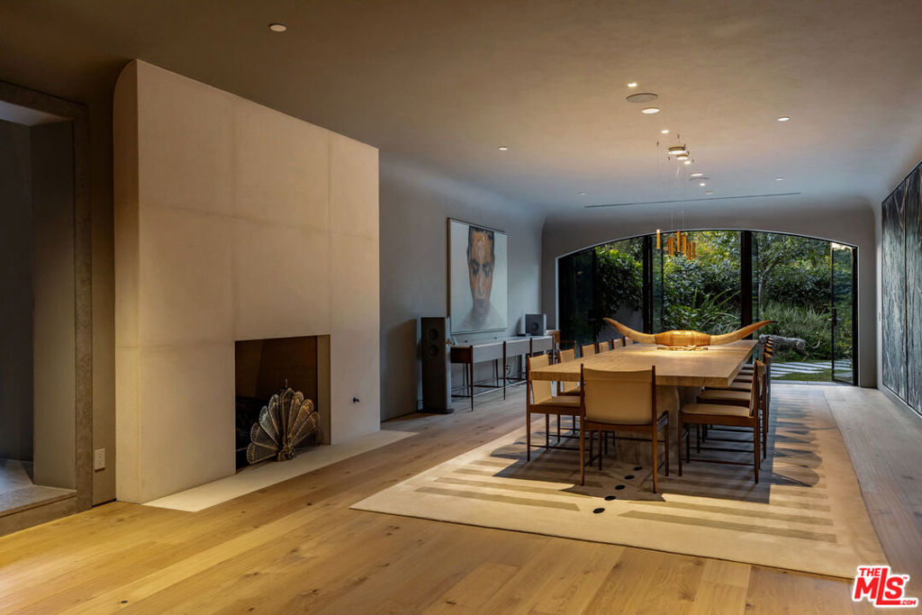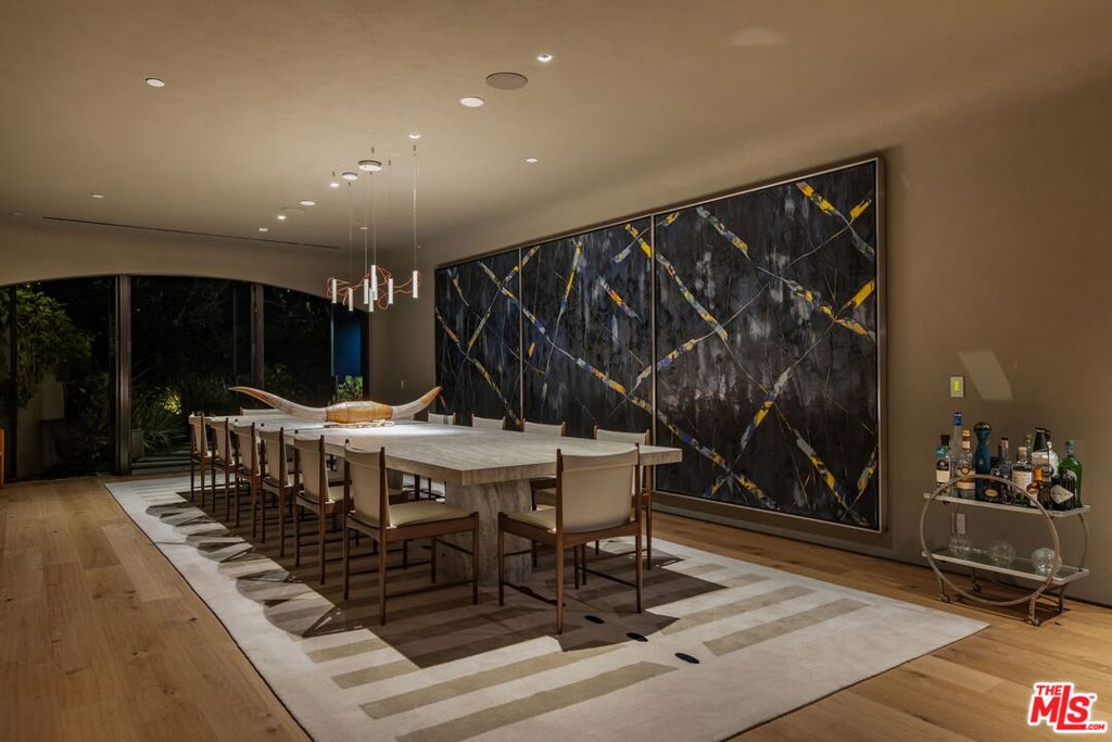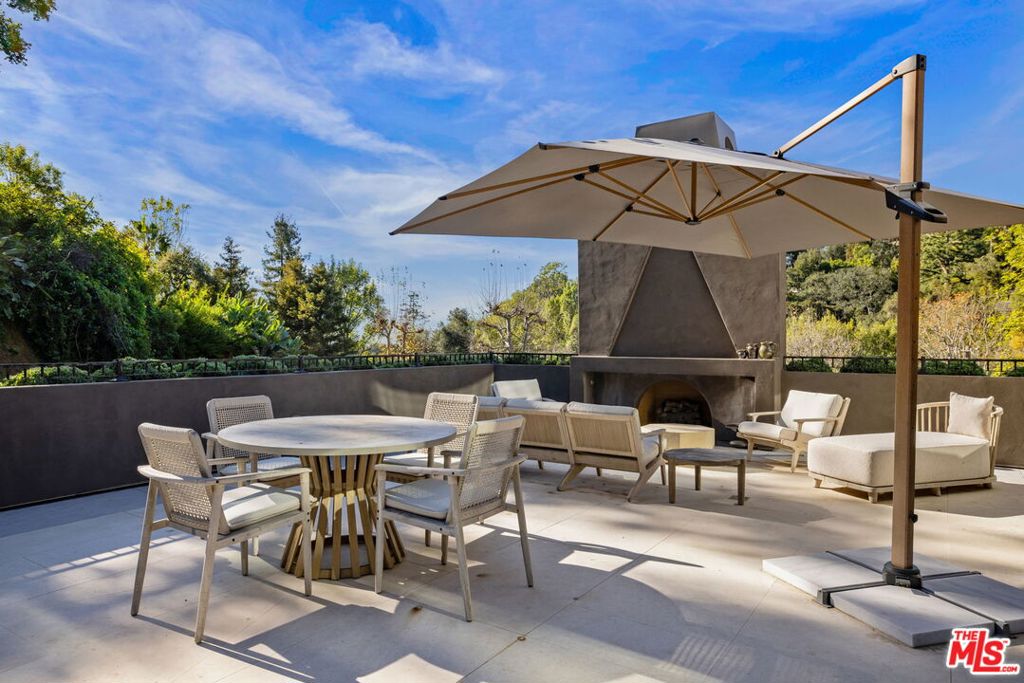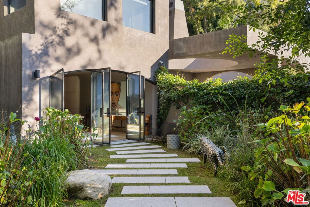 A rare architectural estate of exceptional privacy and design pedigree, tucked within a gated Brentwood enclave moments from The Getty. Completed in 2024 by AD100 designers Studio Shamshiri, this one-of-a-kind residence sits on a 1.2-acre gated lot offering exceptional privacy. Controlled gates open to an expansive motor court and an underground garage for six automobiles, leading to a dramatic entry anchored by sculptural curves and a soaring helical staircase that defines the home's bold signature. The main residence offers five bedrooms, complemented by a separate one-bedroom guest house. Four bedrooms are located on the second level, while the top-floor primary suite is a private sanctuary with a spa-like bath, large closets, and a spacious rooftop terrace with a fireplace. Outdoors, The grounds evoke a resort-like atmosphere, anchored by a Moroccan-influenced pool, multiple lounging and entertaining terraces, and manicured landscaping. The signature experience is a private funicular that ascends from the main grounds to two separate luxury yurts perched high above the estate, each complete with bathrooms, power, and water, revealing panoramic canyon and ocean views at the summit, while a walking path offers an equally scenic route to the top. Designed for large-scale entertaining and refined daily living, the home features seamless indoor-outdoor flow, high ceilings, hand-troweled plaster walls, bronze accents, and seven fireplaces throughout. The Wolf and Miele kitchen with bespoke millwork flows seamlessly into a temperature-controlled wine vault, professional bar, and formal dining spaces. With whole-home Control4 automation and surround sound, this exceptional property delivers unparalleled privacy, design pedigree, and a truly unforgettable living experience.