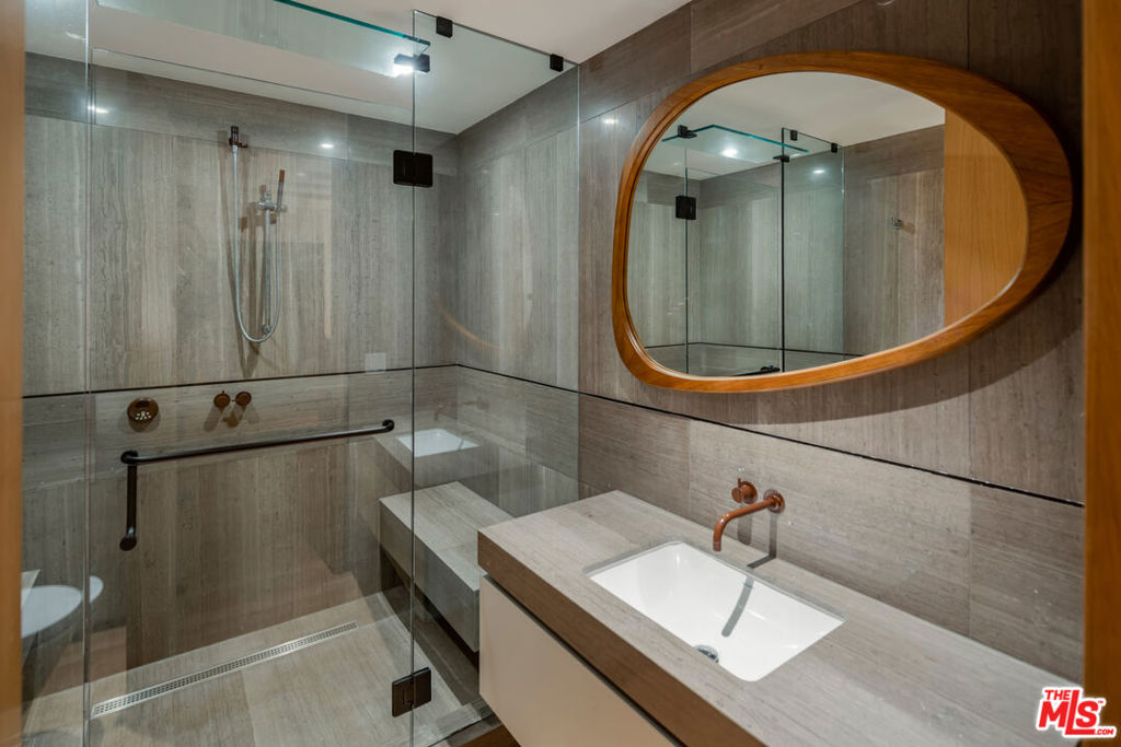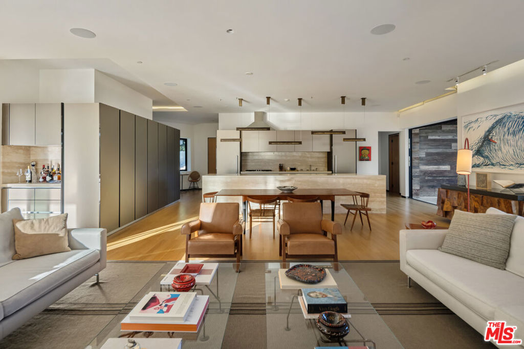 Crafted in 1957 for MGM's legendary General Manager Eddie Mannix, this Beverly Hills estate carries a cinematic lineage that has only been elevated over time. In 2010, the property underwent a meticulous reinvention - an almost complete rebuild that expanded the home from 5,000 to over 8,000 square feet - guided by a team of architects formerly with Pritzker Prize-winning David Chipperfield. Their influence is unmistakable in the restrained geometry, the Roman travertine detailing, and an intentional restraint that elevates simplicity into a statement. Clad entirely in reclaimed Montana oak, the facade sets the tone for interiors defined by natural materials, clean lines, and bespoke detailing. A private, gated drive leads to the entry gallery, setting up sight lines that capture Century City and ocean views on one end, and Downtown's skyline on the other. Enveloped by mature landscaping and sited on approx. 3/4 acres, this home feels like a rustic retreat while being moments from all the City has to offer. The main living area revolves around an open kitchen and a seamless indoor-outdoor flow created by pocketing glass doors that extend to the infinity pool, fire pit lounge, grassy yard, and a full outdoor entertaining sequence complete with bar, barbecue, and an expansive, shaded lower terrace. Inside, the west wing of the property offers two primary suites which each feature their own fireplaces, large dressing rooms, and spa-level baths with steam showers. One additional bedroom suite completes the first level. The second level offers an office, gym and three additional bedrooms. Seven total baths, including two luxuriously-appointed powder rooms, continue the home's palette of oak, stone, and bronze. Additional amenities include a fully soundproofed theater designed with the warmth of a living room with adjacent bar and glass-enclosed wine display. Convenient Crestron automation runs throughout, and storage is abundant, including attic access from both the garage and the primary closet. Gallery spaces, excellent wall space for art, and adjustable art lighting reflect the eye of the current owner, a notable collector with works placed in institutions such as LACMA and Tate Modern. Positioned within one of Beverly Hills' most discreet and desirable pockets, north of Sunset Blvd., this estate pairs architectural intention with privacy, views, and a timeless material vocabulary - an understated yet commanding retreat above the city.
