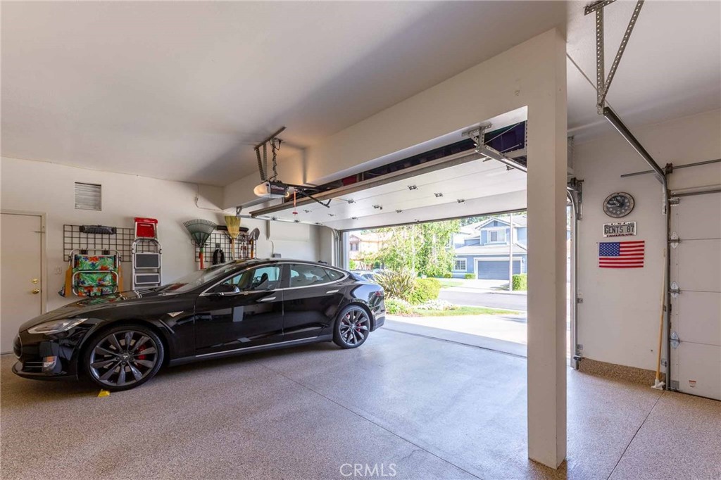 Additional upgrades include new garage doors, epoxy-coated floors, built-in garage cabinets with overhead storage, equipped with EV charging point.