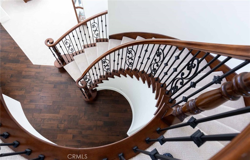 From the moment you arrive, a beautifully landscaped and hardscaped entry, featuring stamped concrete and a custom stone wall, sets the stage. Step inside to soaring ceilings, wood-like flooring, custom paint, crown molding, upgraded lighting, and a remodeled staircase with elegant wrought iron balusters, creating an inviting yet refined atmosphere.