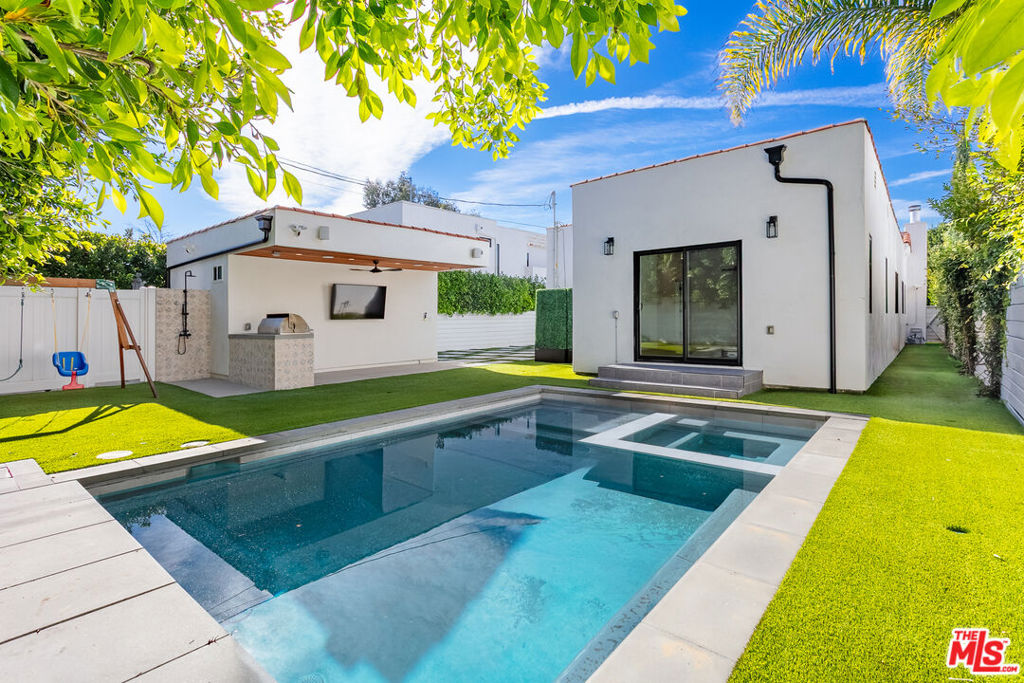 Stunning updated 5BD/4BA home with pool, ADU & privacy. Behind a gated, fully fenced driveway, this light-filled residence offers an open floor plan with high ceilings, designer finishes, and a chef's kitchen with oversized island and premium appliances. The Primary suite features a spa-like bath and two walk-in closets, while additional bedrooms provide flexibility for family, guests or home offices. A recently completed and detached ADU provides flexible space for income potential, guests, work, or family. The backyard is an entertainer's dream with a sparkling pool, Baja shelf, cabana, bbq, TV area, yard space, and outdoor shower. Recent upgrades include paid-off solar, battery backup, and natural gas generator. Centrally located near top dining, shopping, and studios.
