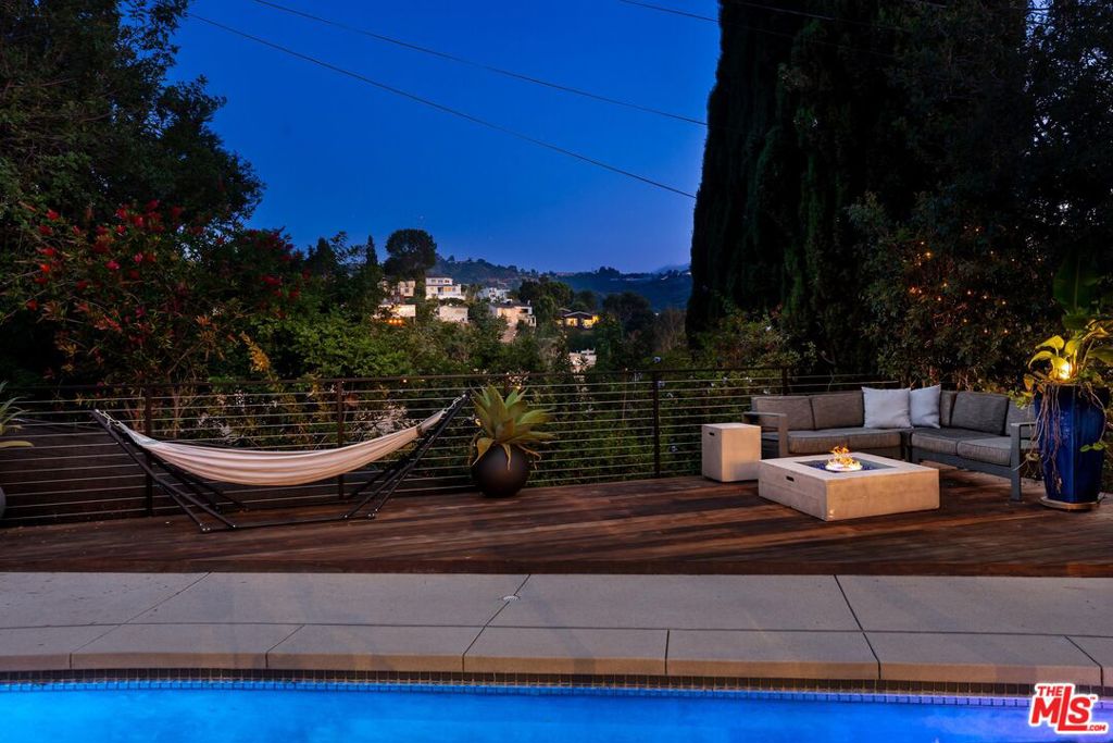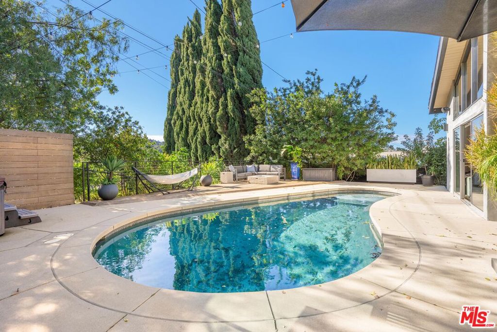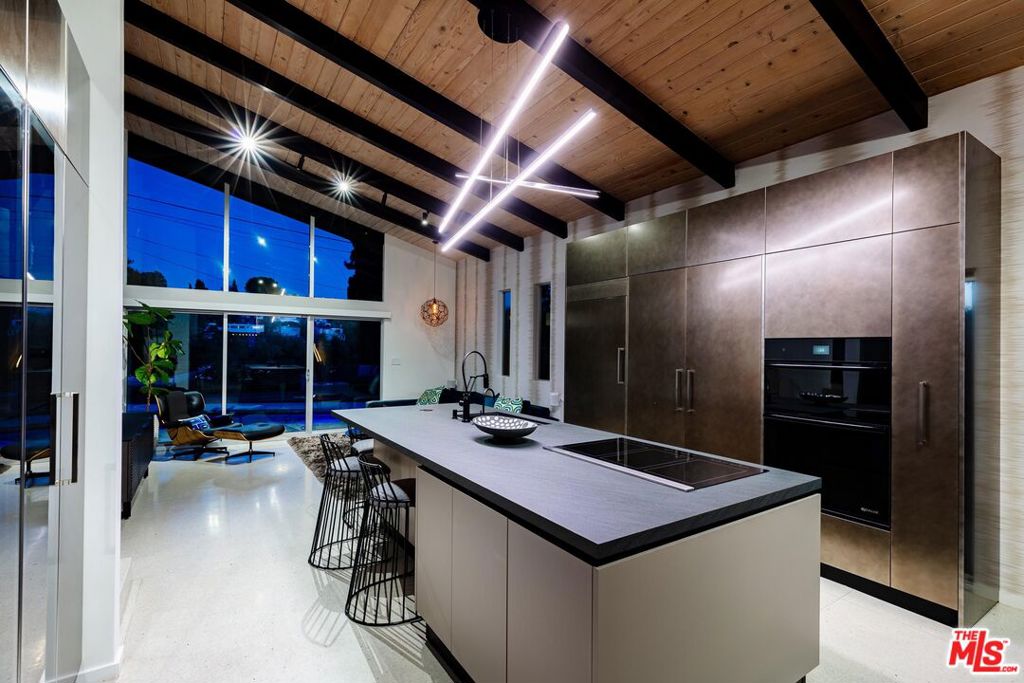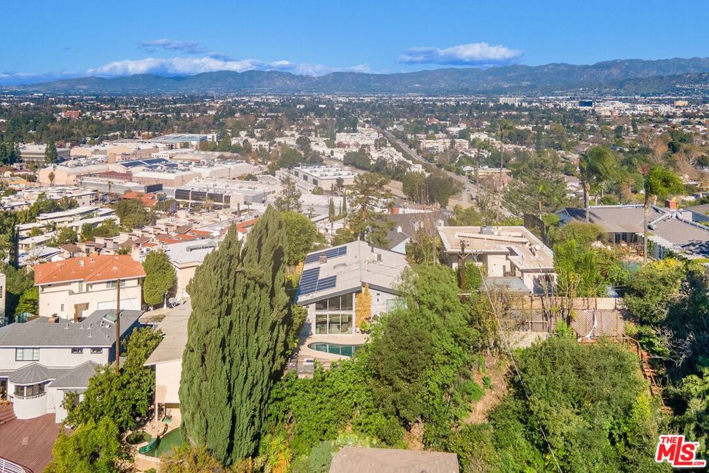 Introducing a mid-century modern residence nestled in the hills above Studio City, offering breathtaking vistas of the mountains and valley. This home is expertly crafted to provide the ultimate luxury living experience. Enter through the grand double door entry to find an open-concept floor plan with natural light pouring in from every angle.Custom poured terrazzo floors and 19-foot exposed beam ceilings add to the home's charm. The living room, with its floor-to-ceiling windows, perfectly frames the incredible views. The spacious dining room featuring a dual-sided fireplace, is ideal for gatherings of friends and family. The custom Pedini kitchen is a chef's dream, complete with high-end Jenn-Air appliances and a large quartz center island, seamlessly connecting to the family room, which also features floor-to-ceiling windows and a sliding door leading to the backyard patio perfect for al fresco dining. The primary suite is a true masterpiece, featuring an oversized picture window, a TV that disappears into the ceiling, blackout blinds, a custom closet, and a spa-like bath with a steam shower, stone soaking tub, and a Toto smart toilet. The two additional bedrooms also have true blackout blinds within-wall channels for complete darkness, custom closets, and share the second full bathroom. The entertainer's backyard is outfitted with a heated salt-water pool, jacuzzi, and fire pit, all while offering captivating views. Designed with integrated smart home technology, the residence includes a Lutron Caseta voice-controlled lighting system, Sonos sound system, Ring security system, whole-home Pelican water softening system, and a fully owned solar energy system for value enhancement and cost savings. Situated just moments from all the dining and shopping along Ventura Blvd and located in the esteemed Carpenter Elementary school district, this home offers a lifestyle you've always dreamed of. Don't miss the opportunity to make it yours.