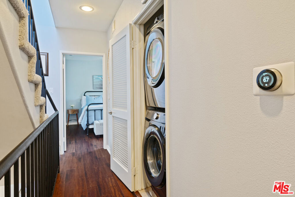 Located in a quiet courtyard setting in the heart of Valley Village, this three level townhome offers bright living spaces and a private rooftop deck with treetop views. Recently updated laminate wood flooring runs throughout the first two levels, creating a clean and cohesive feel across the main living areas.The main floor features an open living and dining space with a fireplace and French doors that bring in natural light. The kitchen includes granite countertops, stainless steel appliances, white cabinetry, a gas range, and a large window above the sink that fills the space with daylight. A kitchen bar provides a comfortable place to sit and gather while meals are being prepared. A powder room and pantry storage beneath the stairs add everyday convenience.Upstairs, the bedrooms offer comfortable layouts and natural light, with in unit laundry located on the same level. The primary bathroom features a remodeled shower with fiberglass enclosed sliding doors on rollers, along with granite counters and tile flooring.The private rooftop deck provides open sky and treetop views, creating a quiet outdoor space above the neighborhood.Additional highlights include a smart thermostat, guest parking, and two tandem assigned parking spaces. Conveniently located near Studio City, Ventura Boulevard, the NoHo Arts District, and major freeways.